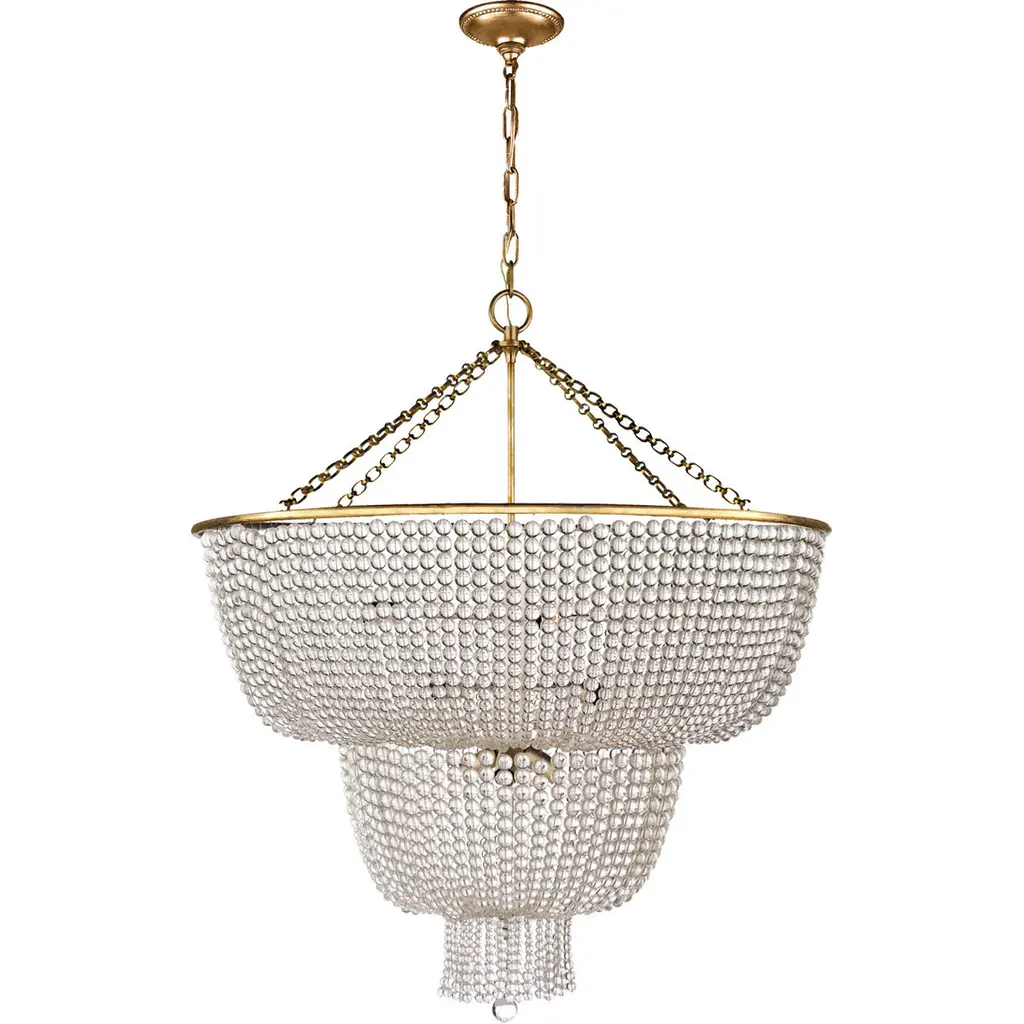 Dress the room in decadence with this shimmering chandelier, draped in a waterfall of glass beads with burnished silver-leaf framework. Hardwired.