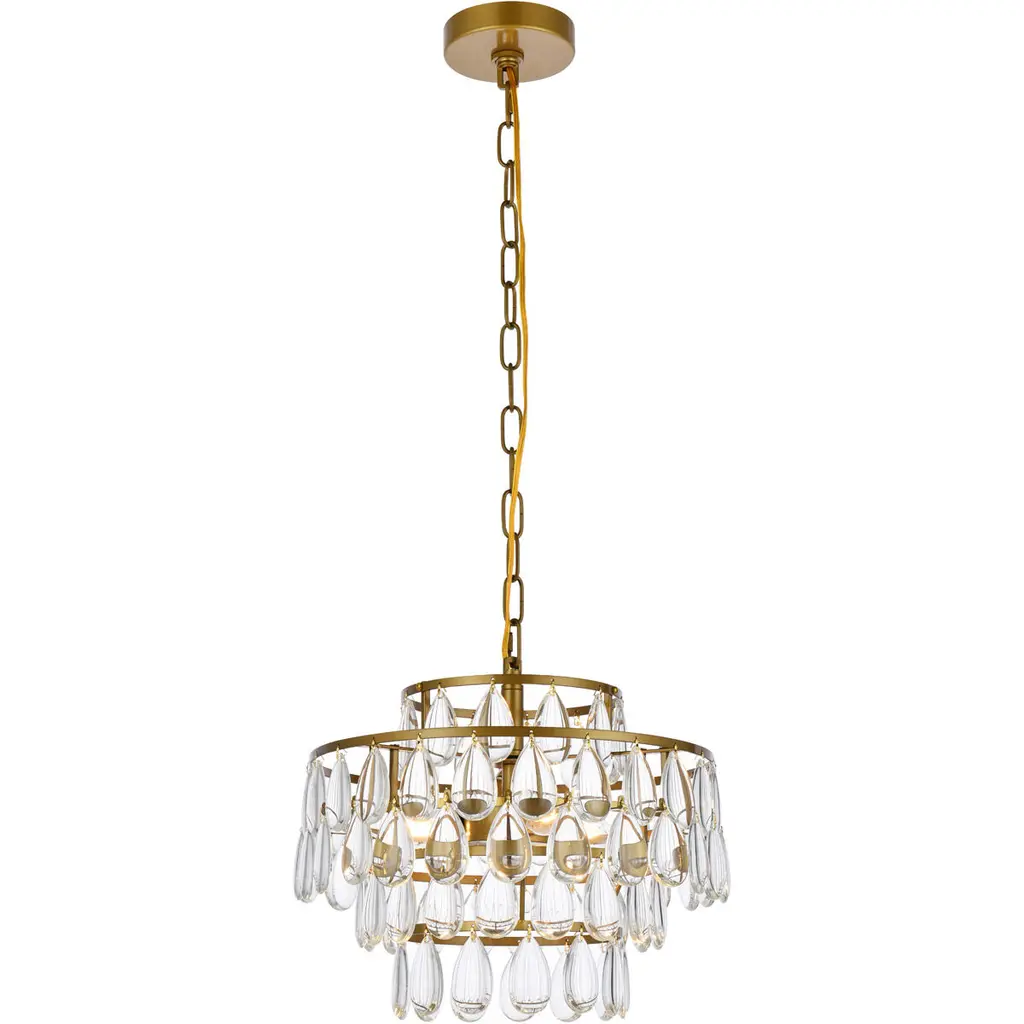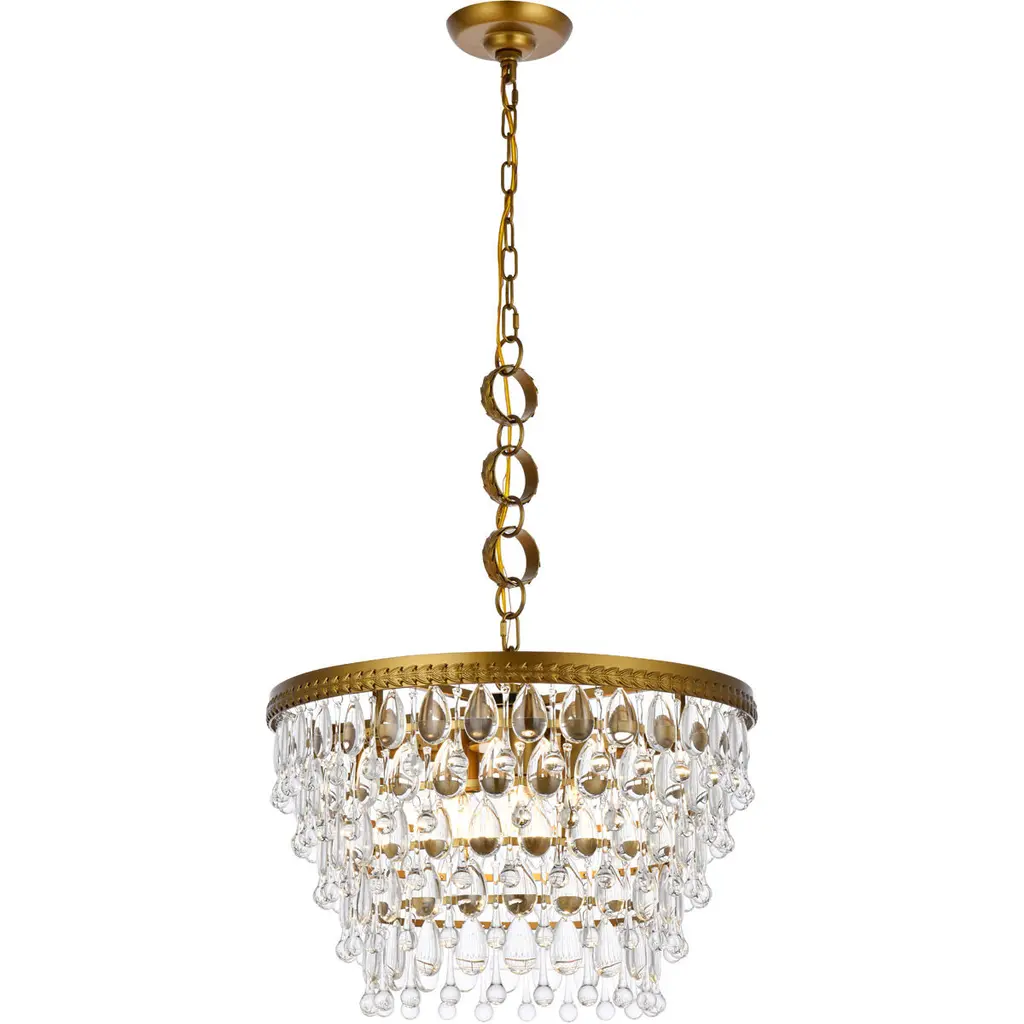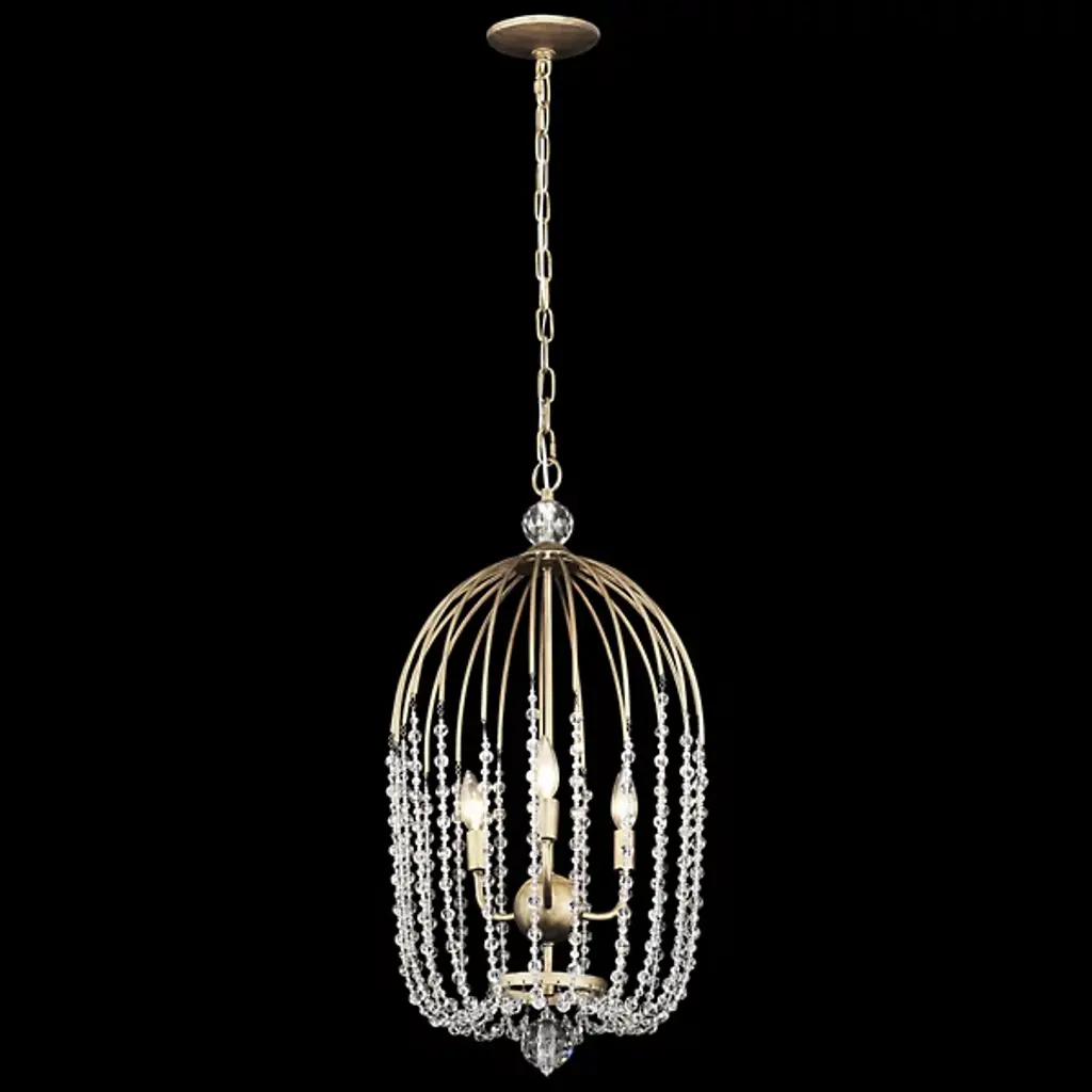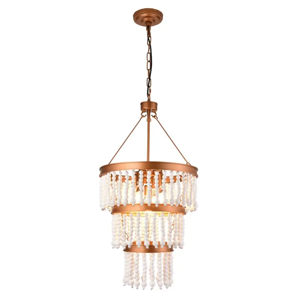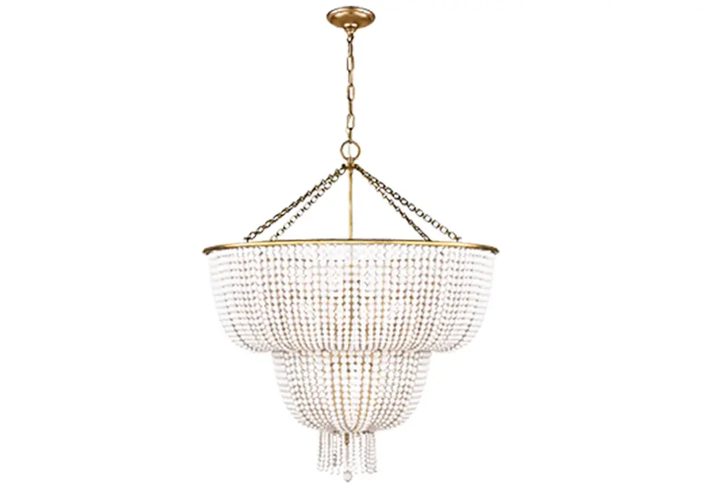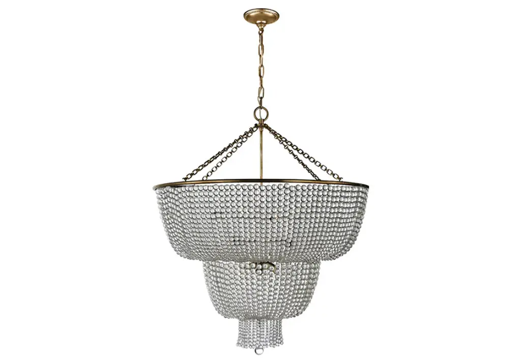 This refined chandelier lends a look of traditional elegance with its draped beading and low-profile frame. It is available in a luxurious two-tier or an elegant one-tier frame wit h either clear glass or white acrylic beads.