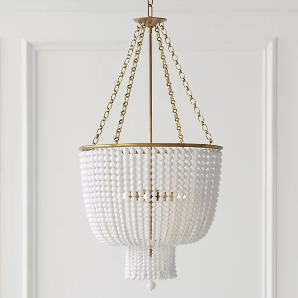 The Jacqueline Chandelier by Visual Comfort Signature, formerly known as Visual Comfort, brings a refined, traditional presence to your living space. Its design consists of individual strands of decorative beads which gently cascade down to a central bead accent. The semi-transparent surface (and the beads themselves) allows for light to filter out in a dynamic, shimmering fashion, bringing ambiance as well as lighting to the surrounding space.