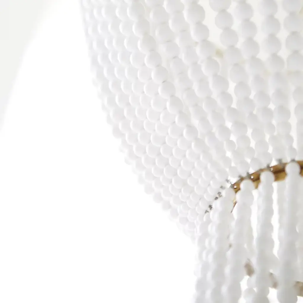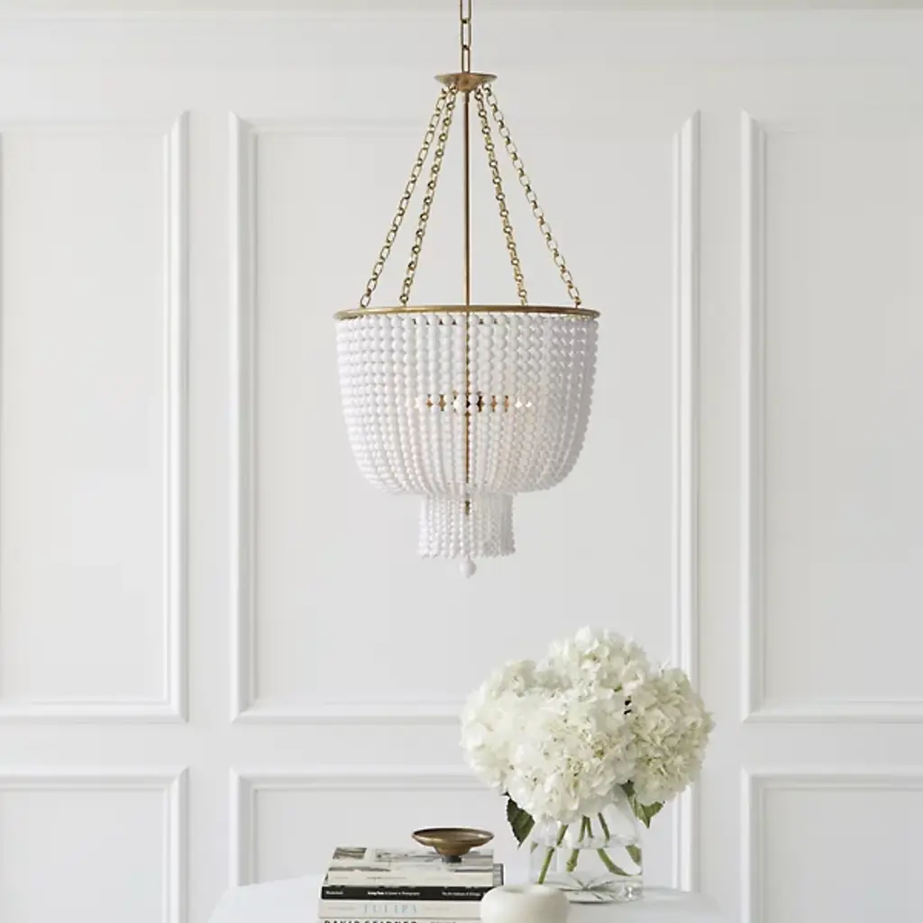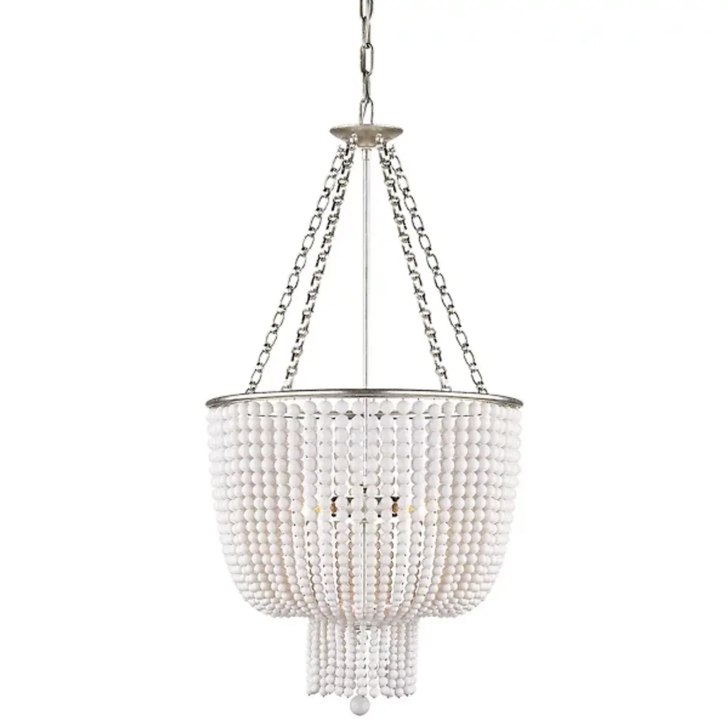 The Jacqueline Chandelier by Visual Comfort Signature, formerly known as Visual Comfort, brings a refined, traditional presence to your living space. Its design consists of individual strands of decorative beads which gently cascade down to a central bead accent. The semi-transparent surface (and the beads themselves) allows for light to filter out in a dynamic, shimmering fashion, bringing ambiance as well as lighting to the surrounding space.