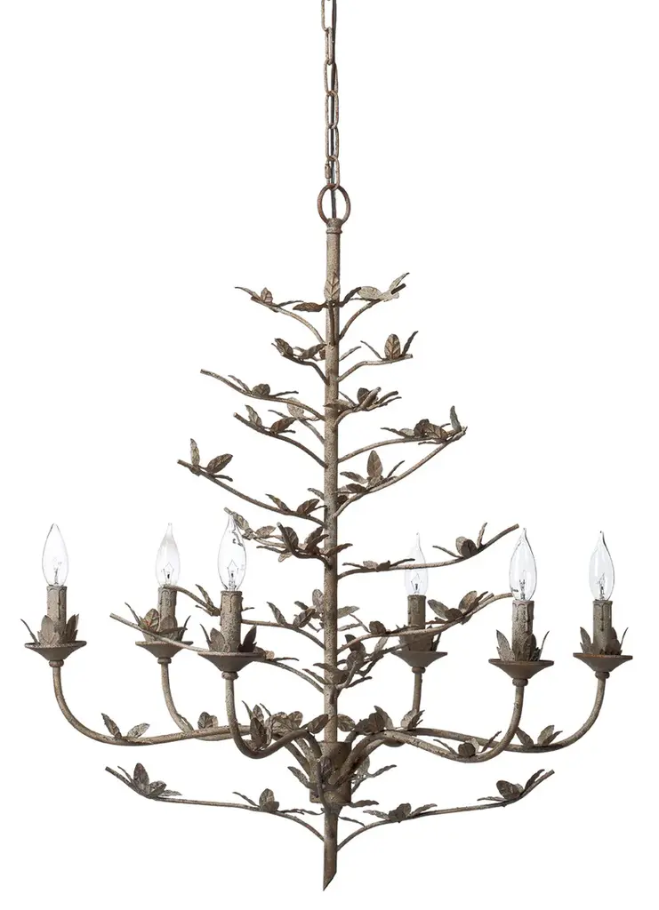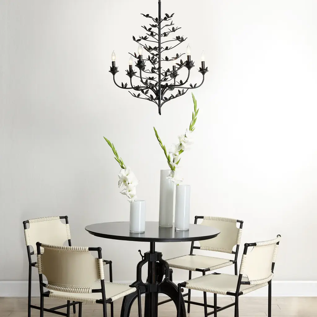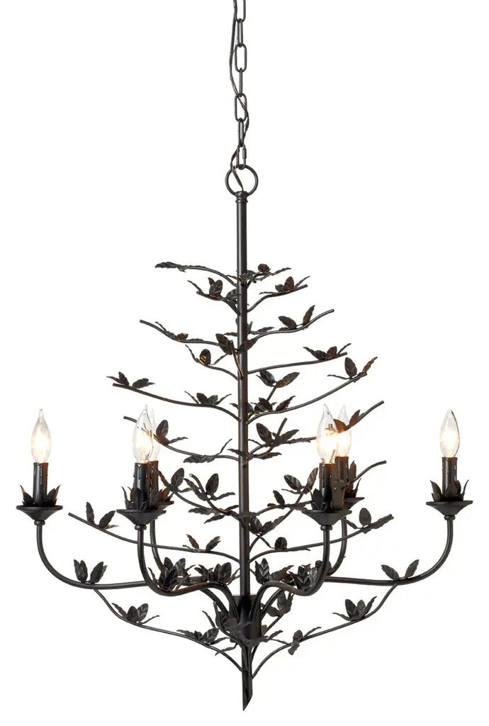The structure of this chandelier was inspired by the natural beauty of foliage in bloom. Every branch of the rust iron or black iron chandelier has its own blooming petals, each crafted and attached by hand. Six iron arms hold faux dripping candlesticks blooming out of delicate iron petals. This eye-catching piece of art is expertly handcrafted and will add dramatic flair to your home's decor. The fixture is suspended from a coordinating 8-foot chain in rust iron, and professional installation is recommended.