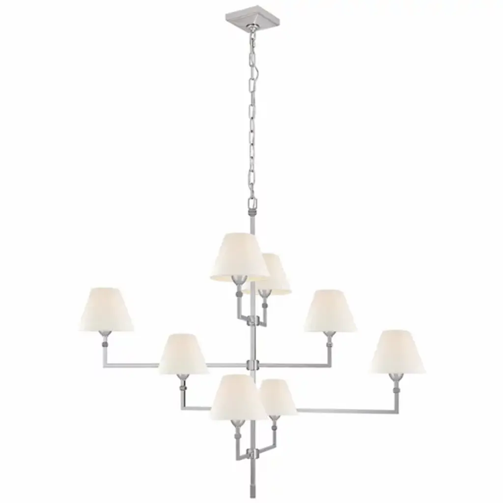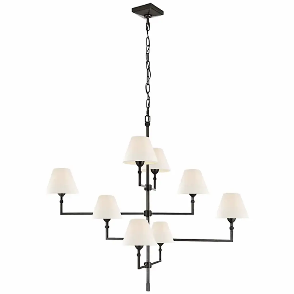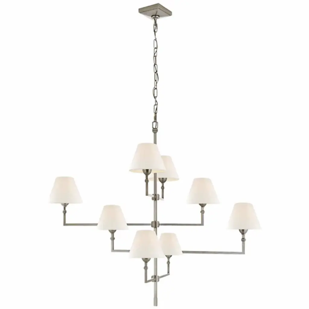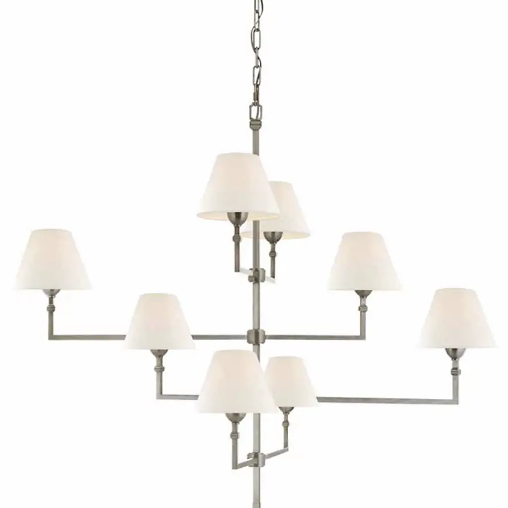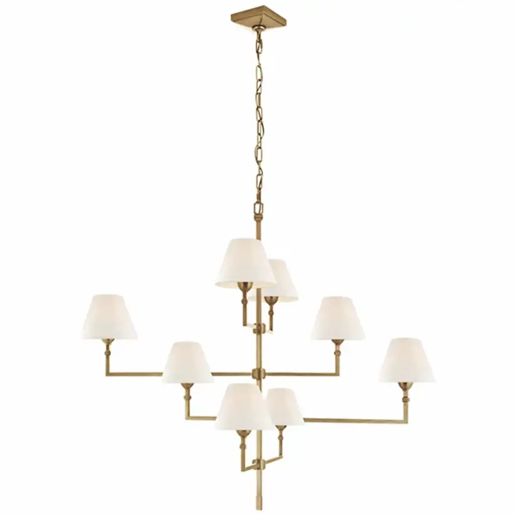 A staircase of calming light. Satisfy both the intimate and spacious feeling of your room with the Jane Offset Chandelier from Visual Comfort Signature, formerly known as Visual Comfort, This transitional design carries clean lines and decorative notes that are sure to complement one’s décor. It streams down with a slender rod and points towards every wall with perpendicular arms. The bold metal arms sport transitional accents and hold classic tapered drum shades. The shades protect the eye from side glare. A golden light filters through the shades and exits vertically through its openings to create a fulfilling aura.