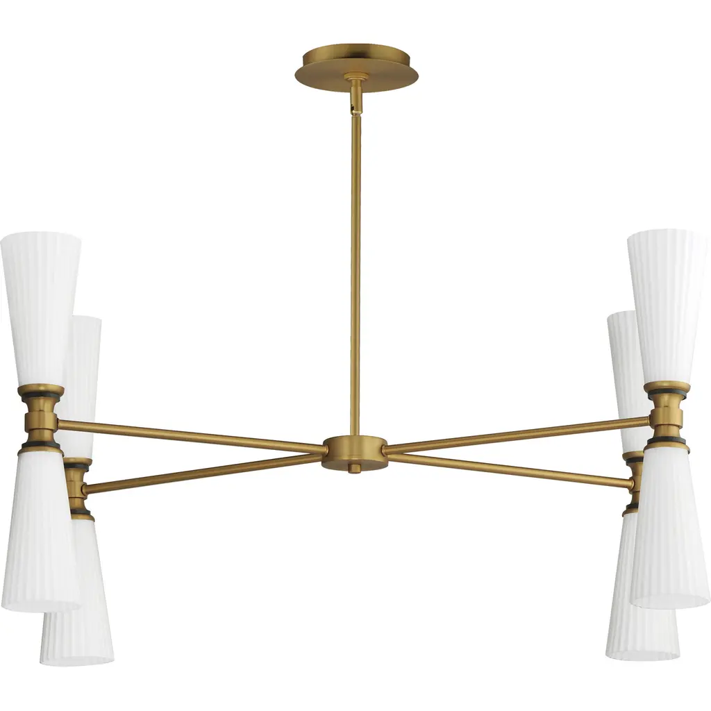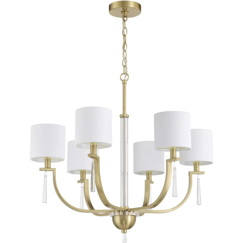 A beautiful blend of acrylic, metal and linen, Janelle gives off a vintage vibe with details that feel fresh. Tapered white linen shades are suspended on long, linear sticks of acrylic that allow the metal details inside to show through. With linear, chandelier and sconce options in aged brass or polished nickel, this updated retro design is sure to find a place in your space.