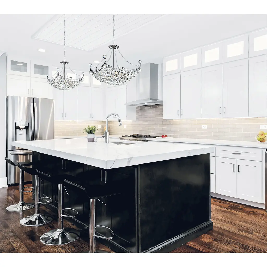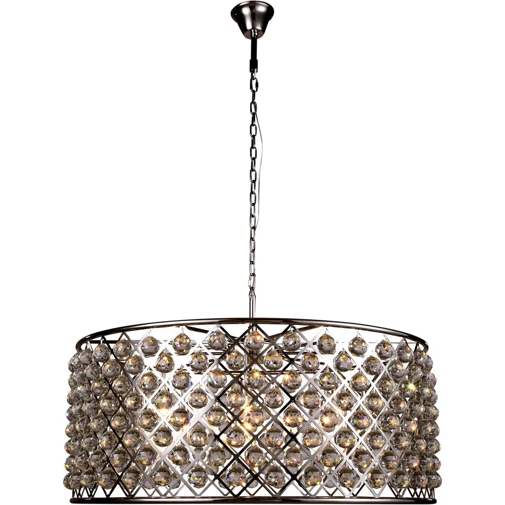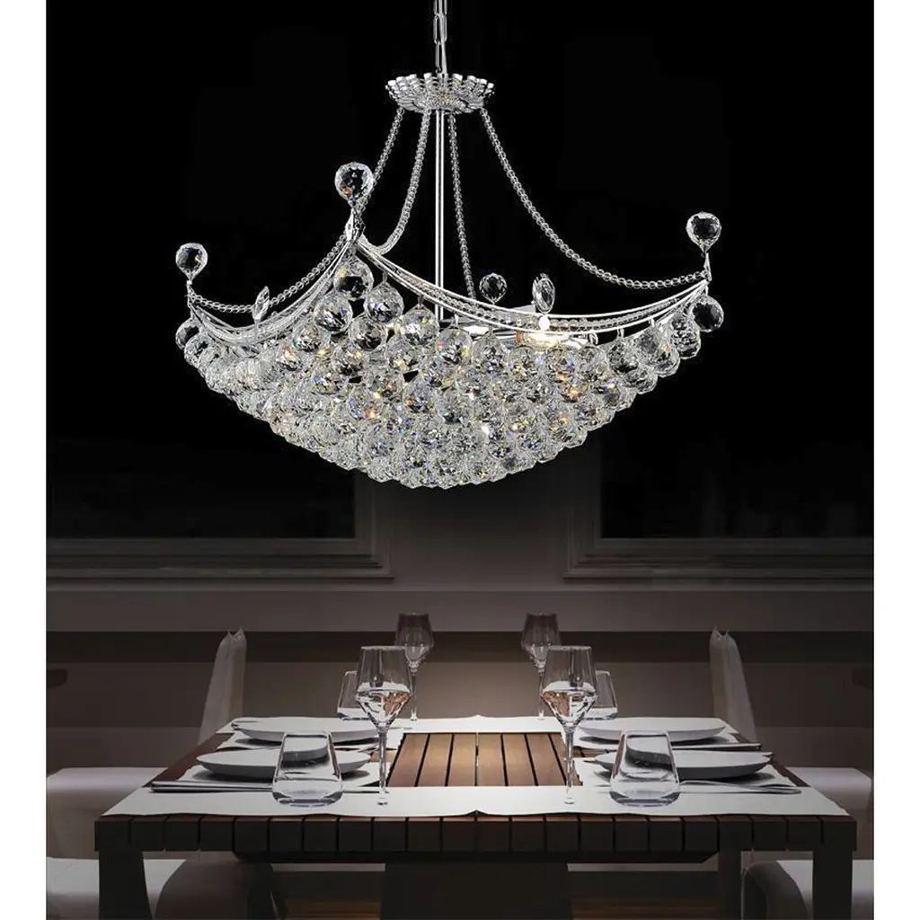 A statement-making chandelier, the Jasmine 8 Light Chandelier can enhance your dining space with its ornamental structure and glittering diffused light. This down chandelier is designed with a chrome-finished candelabra base with a basket of dangling crystal balls radiating light that is soft and warm yet still elegant.