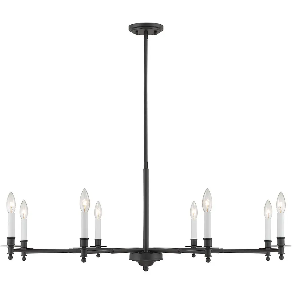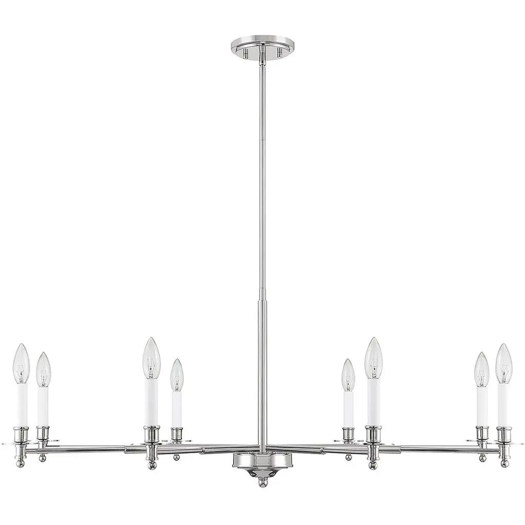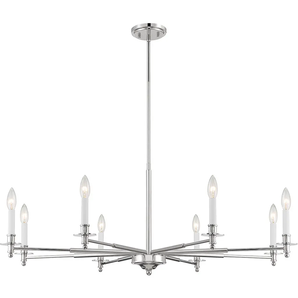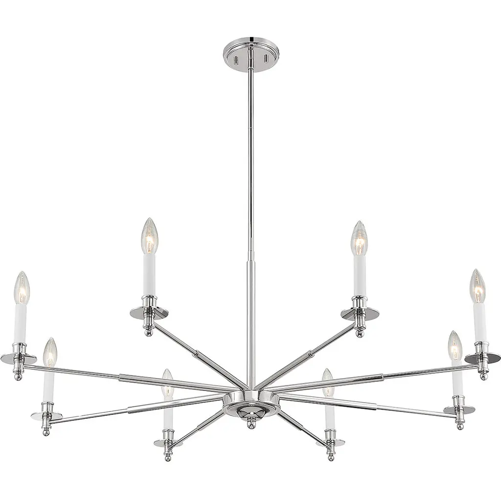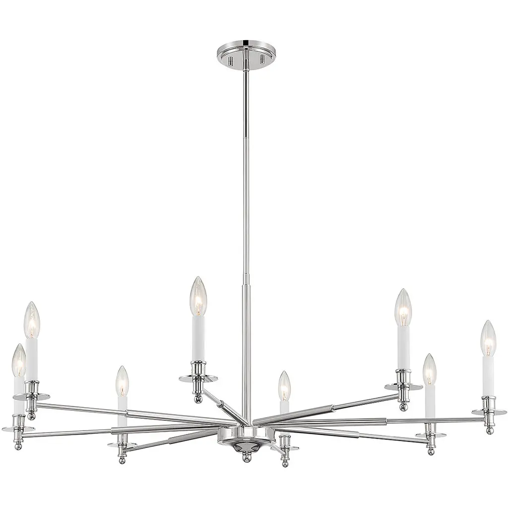 The Savoy House Jasmine 8-light chandelier has a traditional-inspired look that is perfectly versatile for a wide range of spaces and styles. Polished nickel finish with white candle covers. Jasmine is 42" in width and has an adjustable height ranging from 16" to 69.5". Comes with four 12" downrods and one 6" downrod. It uses 8 candelabra size bulbs of up to 60 watts per bulb (bulbs not included).
