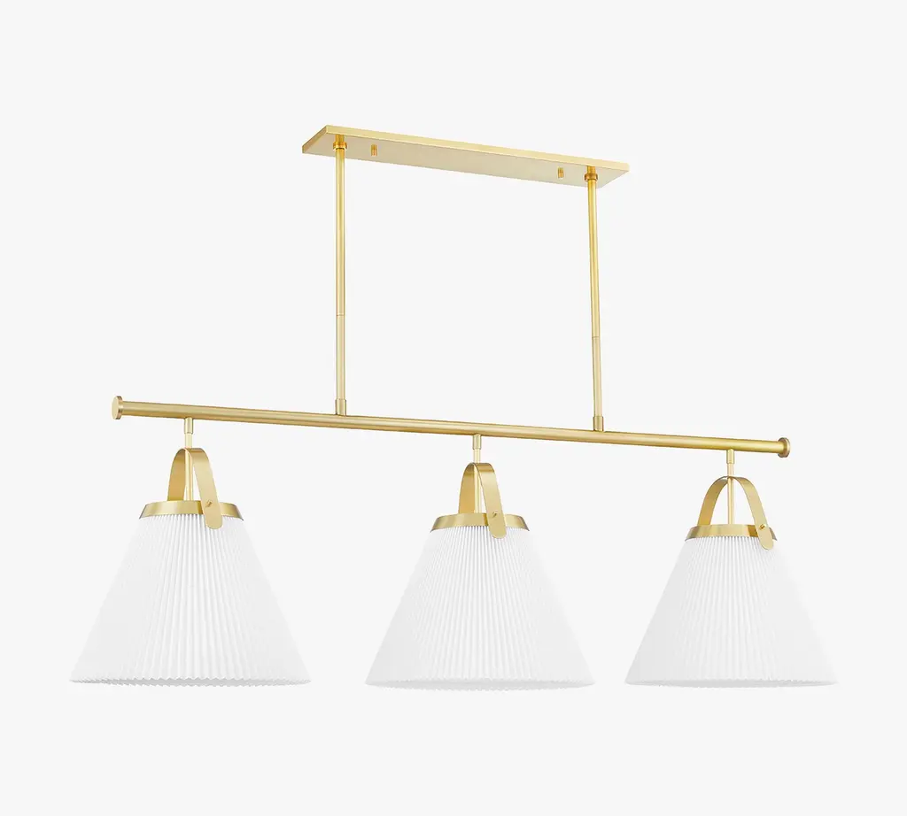 Pleated cone shades in Belgian linen, arched metal accents, and a linear base are a modern mix of classic touches and clean shapes. The chandelier comes in your choice of metal finish to match or counterbalance the hardware you have in place, and is also available as a single sconce or pendant.