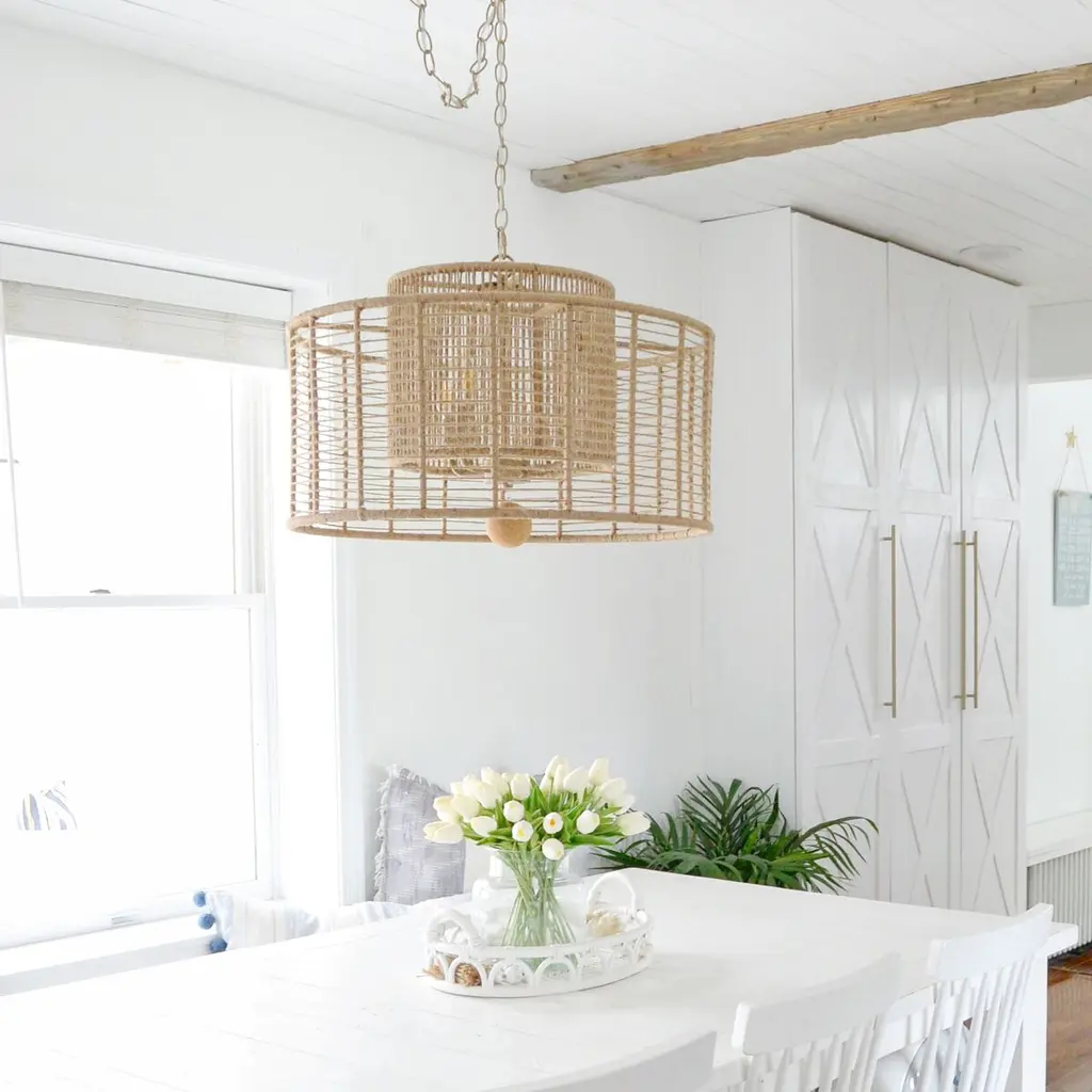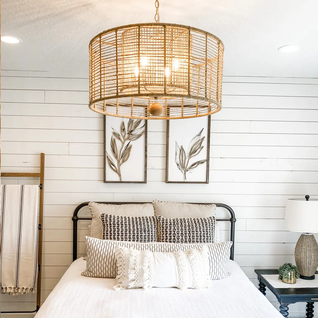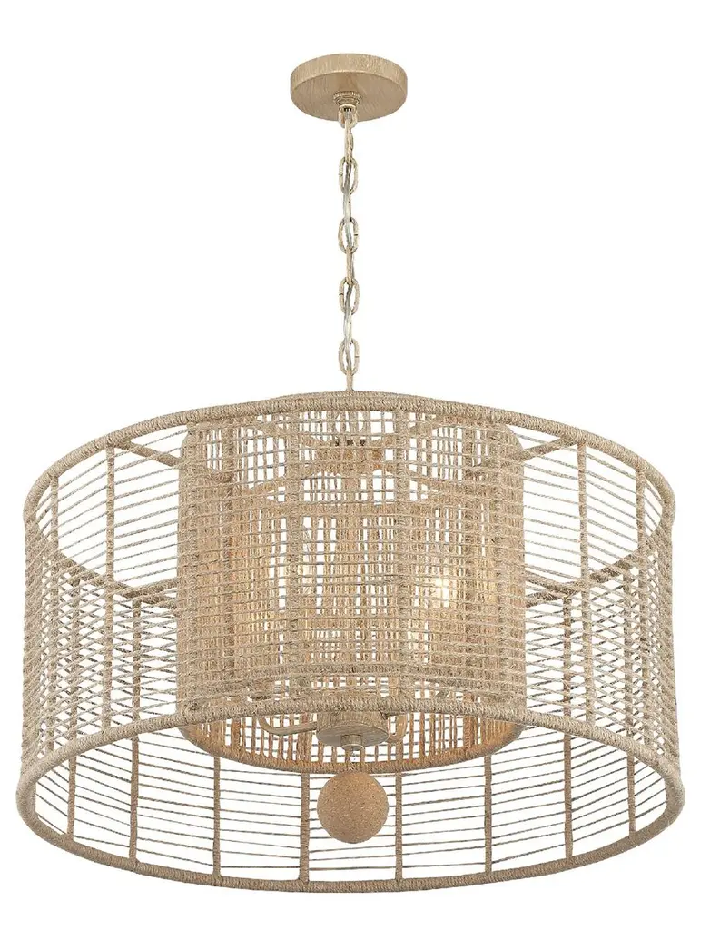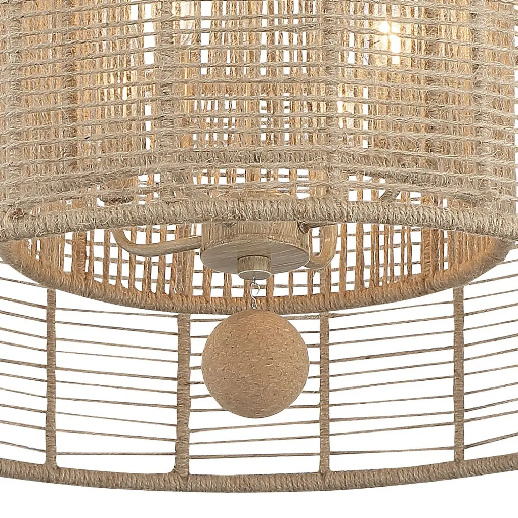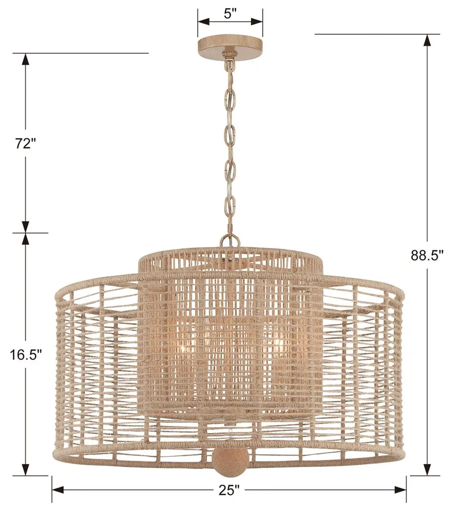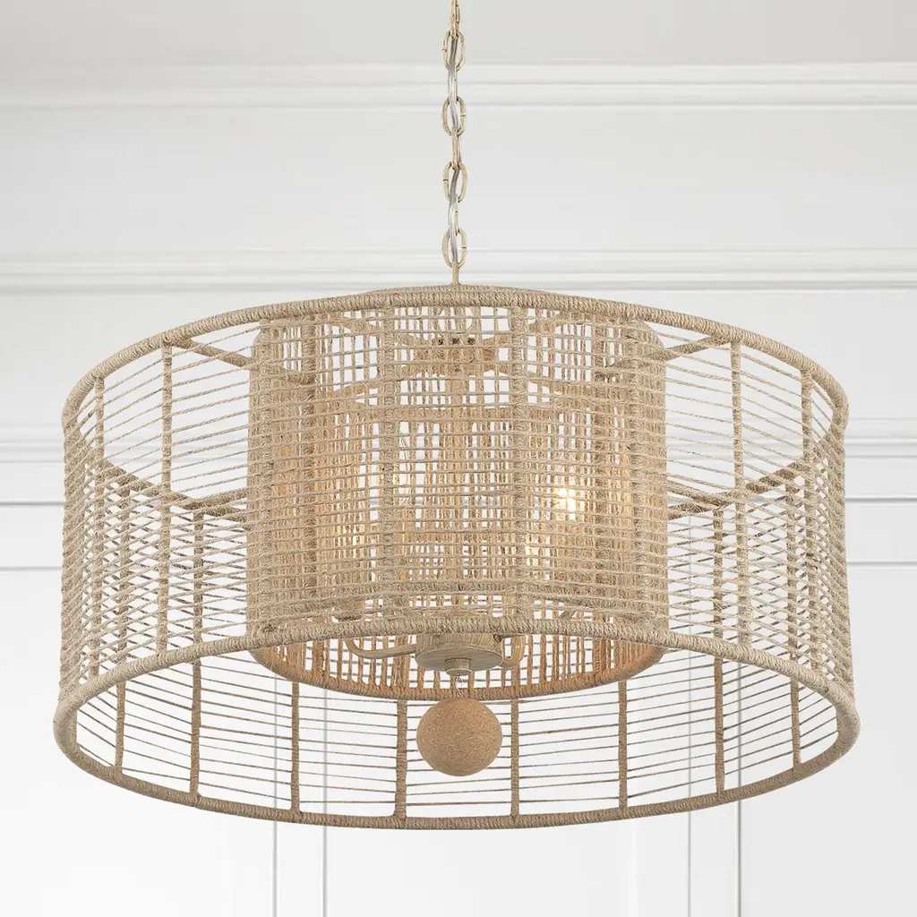 A casual take on a formal chandelier, this fixture's open and airy steel frame is wrapped in jute for an organic textural finish. Hardwired.