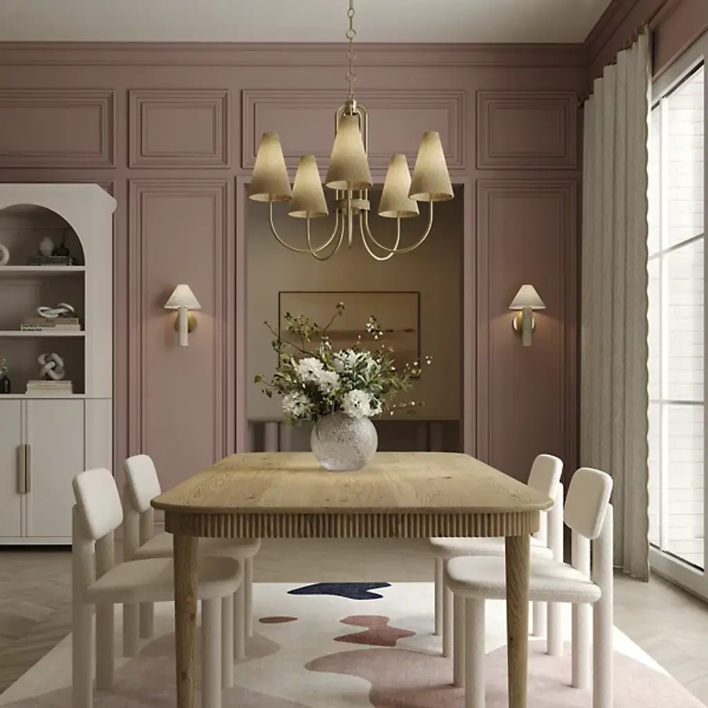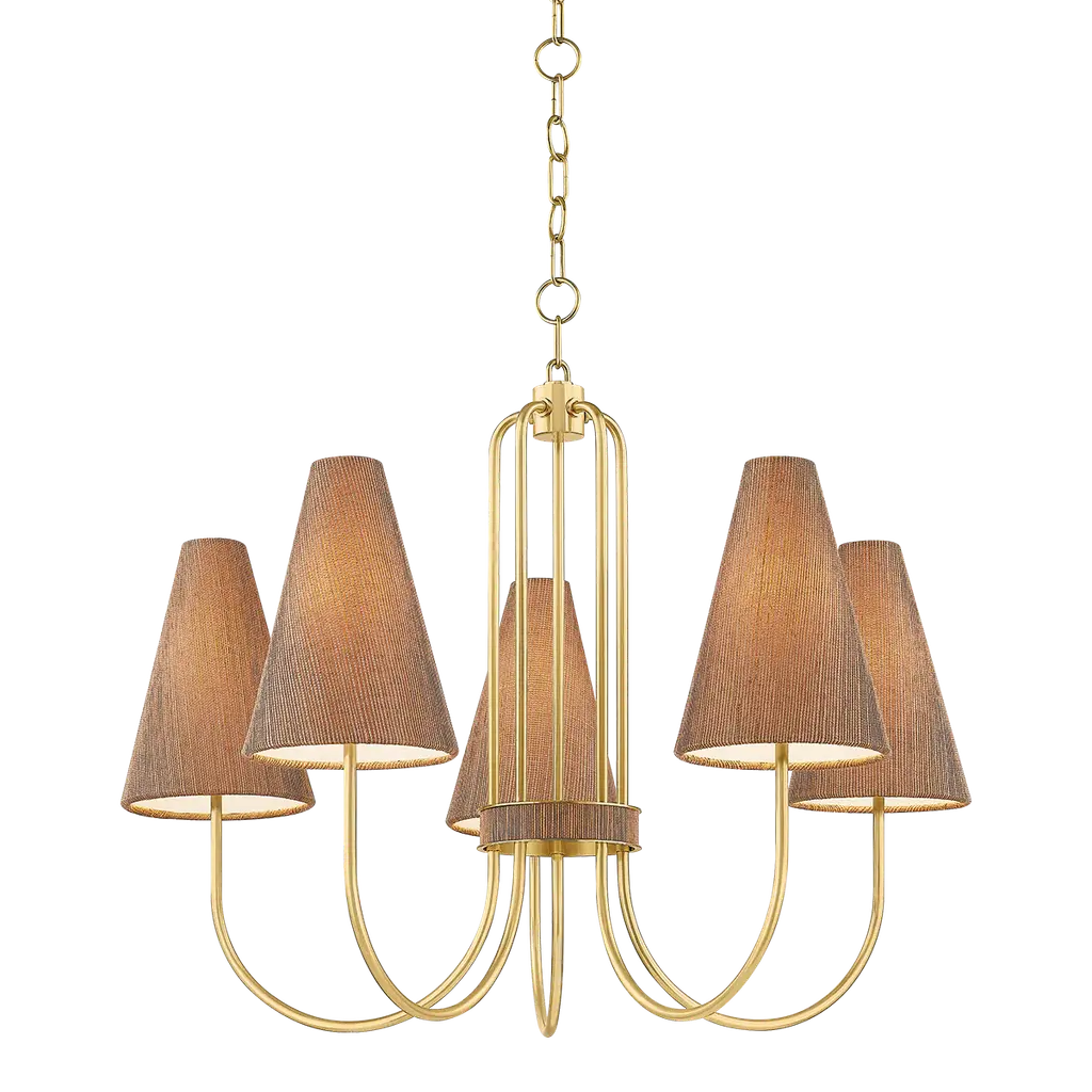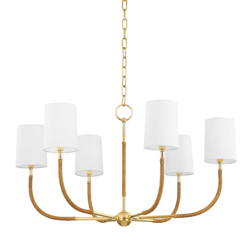 The Jessel Chandelier from Mitzi bridges time periods by blending a vintage-inspired framework with contemporary material interpretations. Sweeping arms establish fluid movement around the central axis, bringing energy and grace to the composition. Each elongated grasscloth shade contributes textural richness while moderating light output to create nuanced illumination patterns. The handwoven shade material ensures subtle uniqueness in each fixture while introducing organic elements to more formal spaces. Especially effective in cottage-inspired interiors, this chandelier brings natural warmth to dining areas, front entrances, or living rooms.