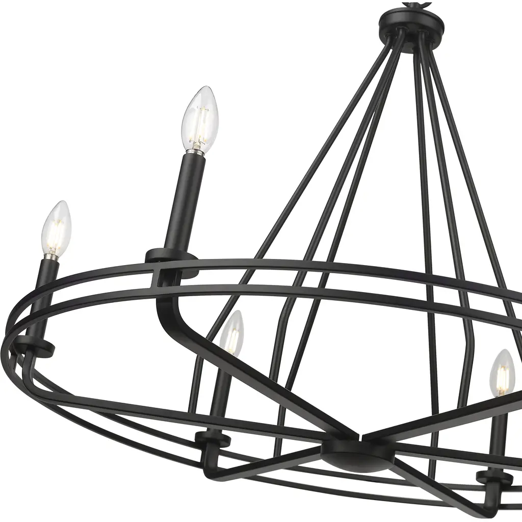 The Jody Family of chandelier lighting is a whimsical take on the traditional wagon wheel candelabra silhouette. Designed to create a dramatic impact, the fixtures feature radiating spokes supporting the dual circular frame and are available as 5- or 6-light options. Finished in either matte black or vintage brass, the result is a stunning fixture perfect for illuminating any dining space or grand entryway with stately simplicity.