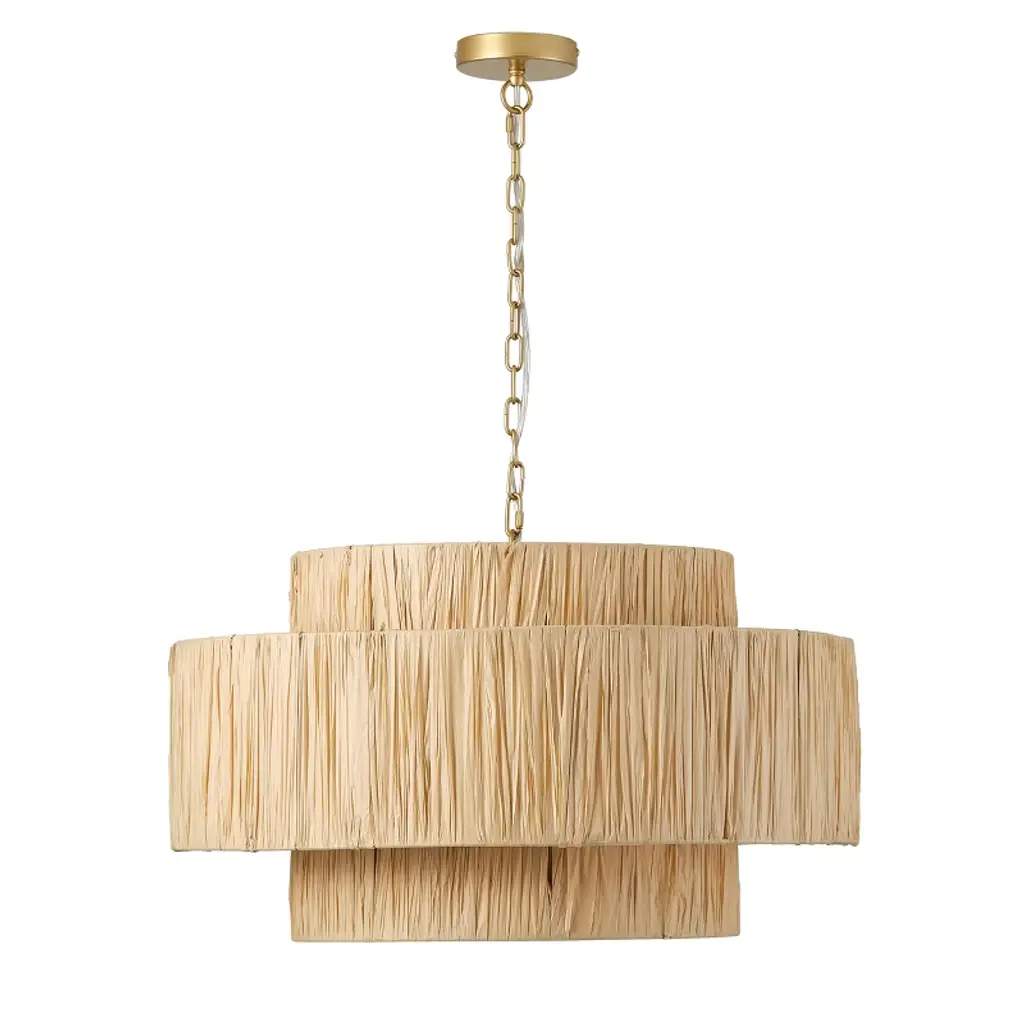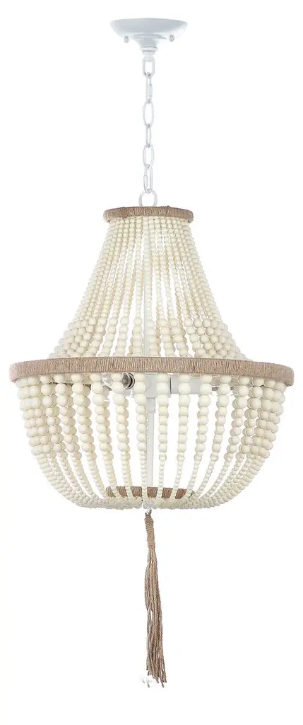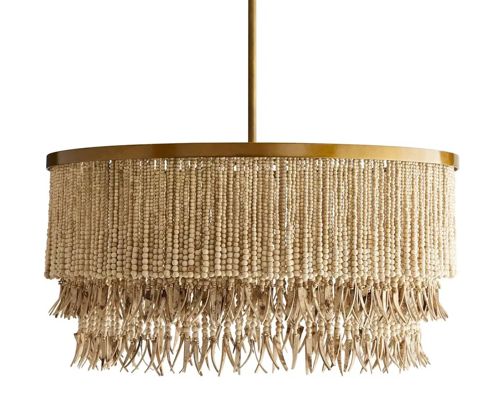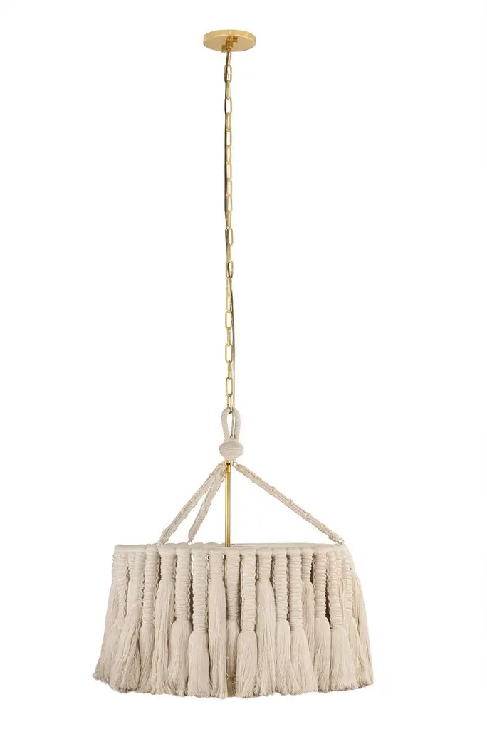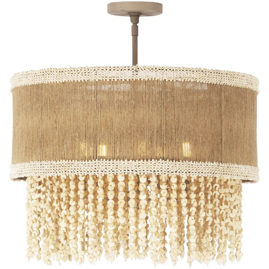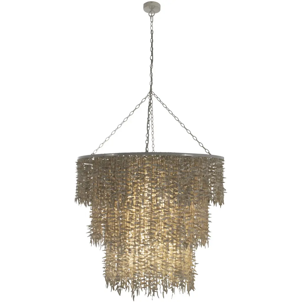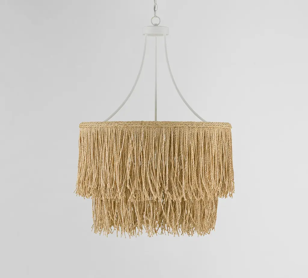 A skirt woven from Abacá rope gives this two-tiered chandelier a natural sense of movement – like style that can’t sit still. The wrought iron hardware has been finished in a gesso-white finish to maintain the light and airy feel. (Also available as a single-tiered chandelier and pendant.)