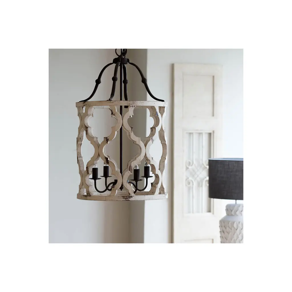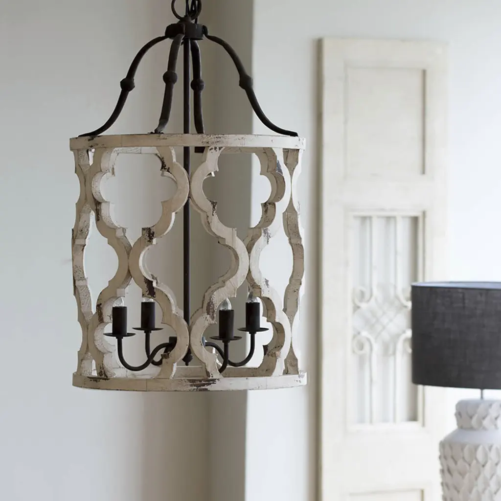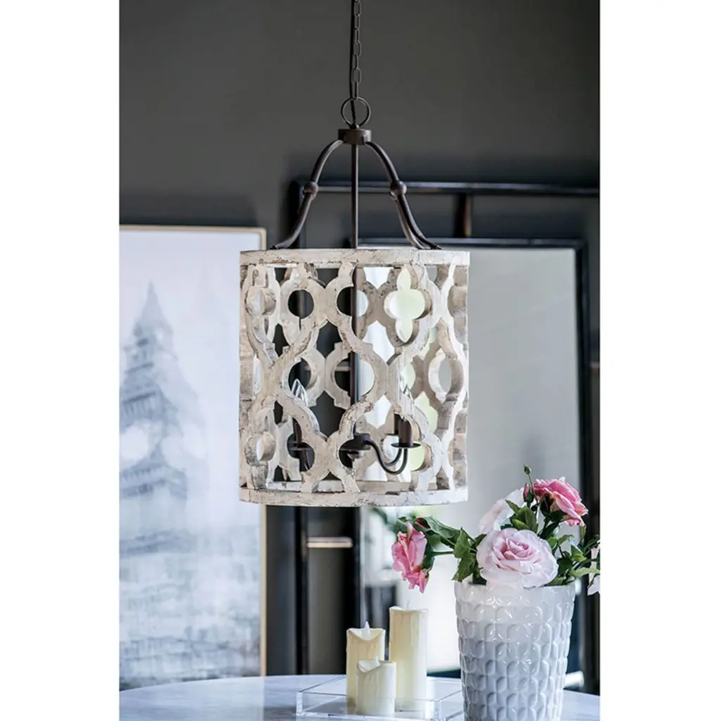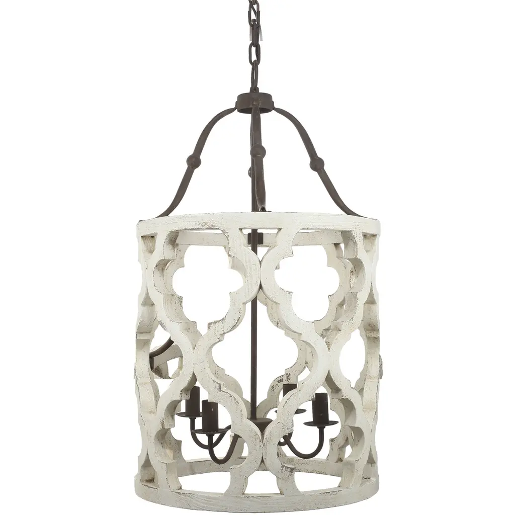 With a charming cottage chic personality, the Jolette Four-Light Wood Chandelier offers an effortless way to bring bright rustic nostalgia to any space. The decorative open frame is constructed from wood, sculpted into decorative lattices and finished in distressed white. Use vintage-inspired bulbs to complete the look.