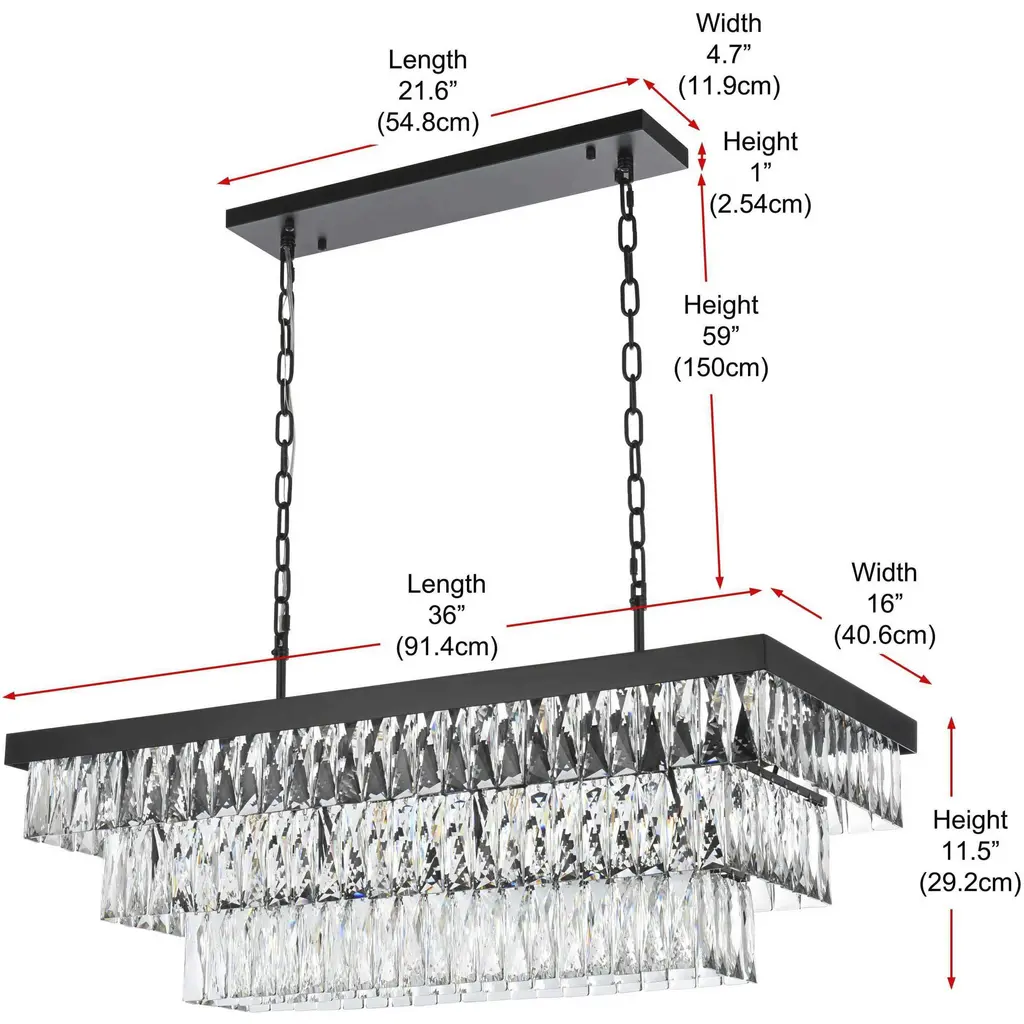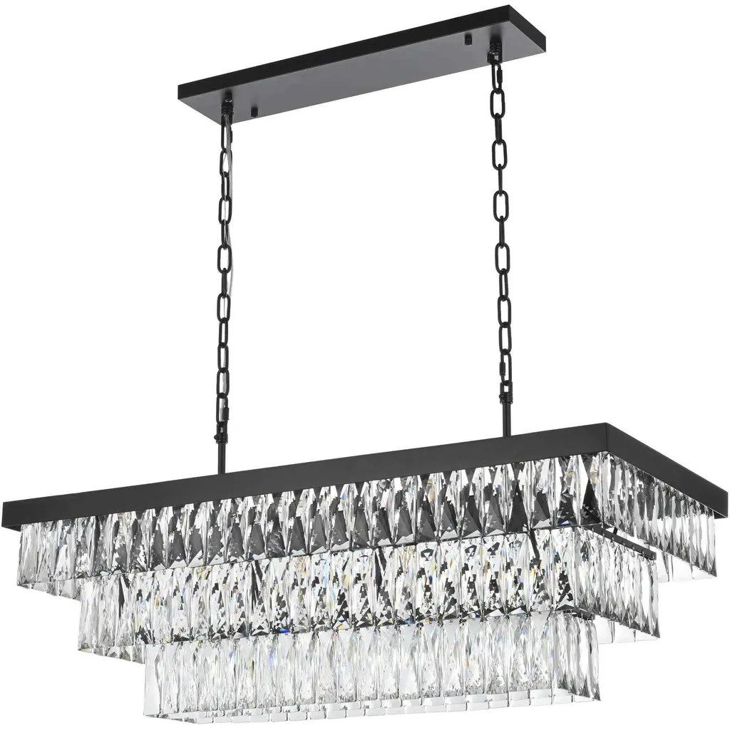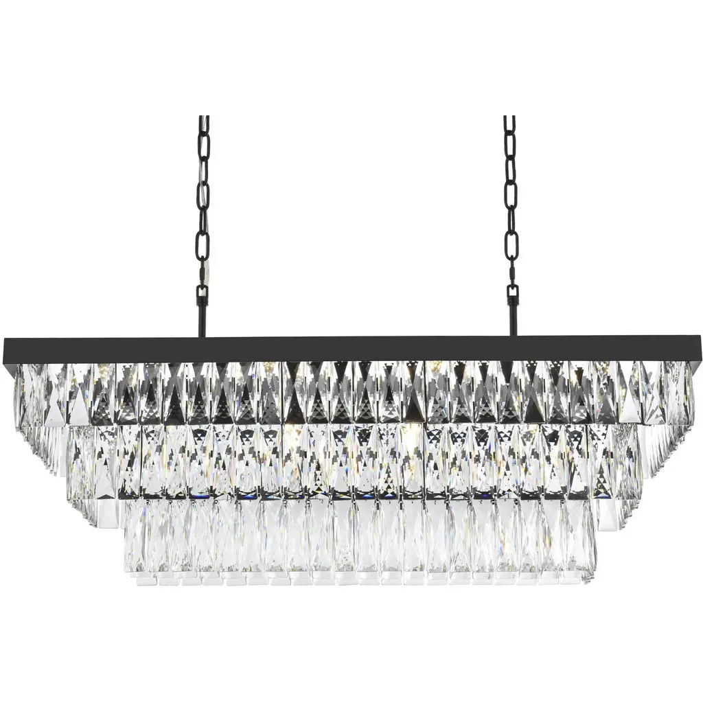 Transform your space with this spectacular linear pendant that reinvents crystal lighting for contemporary interiors. The bold rectangular frame suspends two perfectly proportioned crystal tiers, creating a mesmerizing interplay of light and structure. Each precisely cut crystal is strategically positioned to maximize light play, producing brilliant refractions that dance across your space. The strong horizontal presence makes this fixture an ideal centerpiece above dining tables, conference rooms, or in grand living spaces. The thoughtful construction marries industrial strength with crystalline delicacy, as the robust metal frame appears to float above while supporting the spectacular crystal arrangement. Whether styled in reflective chrome, sophisticated black, or warm satin gold, this pendant commands attention through its architectural presence. The linear composition offers a fresh interpretation of crystal lighting, where clean lines and geometric precision meet the spectacular light performance of premium crystal. This fixture doesn't merely illuminate it defines space through its commanding horizontal presence while creating an ever-changing display of light and shadow.