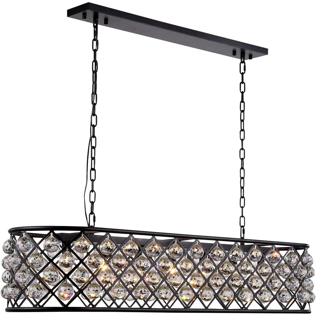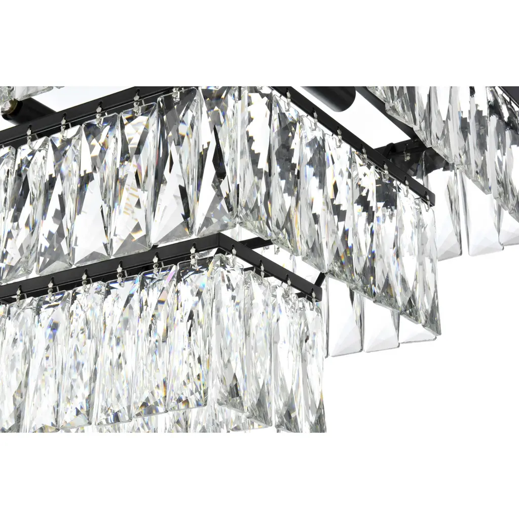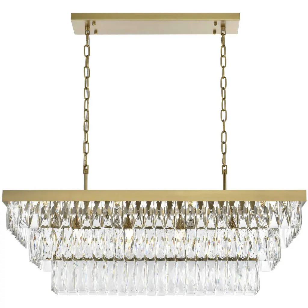 Transform your space with this spectacular linear pendant that reinvents crystal lighting for contemporary interiors. The bold rectangular frame suspends two perfectly proportioned crystal tiers, creating a mesmerizing interplay of light and structure. Each precisely cut crystal is strategically positioned to maximize light play, producing brilliant refractions that dance across your space. The strong horizontal presence makes this fixture an ideal centerpiece above dining tables, conference rooms, or in grand living spaces. The thoughtful construction marries industrial strength with crystalline delicacy, as the robust metal frame appears to float above while supporting the spectacular crystal arrangement. Whether styled in reflective chrome, sophisticated black, or warm satin gold, this pendant commands attention through its architectural presence. The linear composition offers a fresh interpretation of crystal lighting, where clean lines and geometric precision meet the spectacular light performance of premium crystal. This fixture doesn't merely illuminate it defines space through its commanding horizontal presence while creating an ever-changing display of light and shadow.