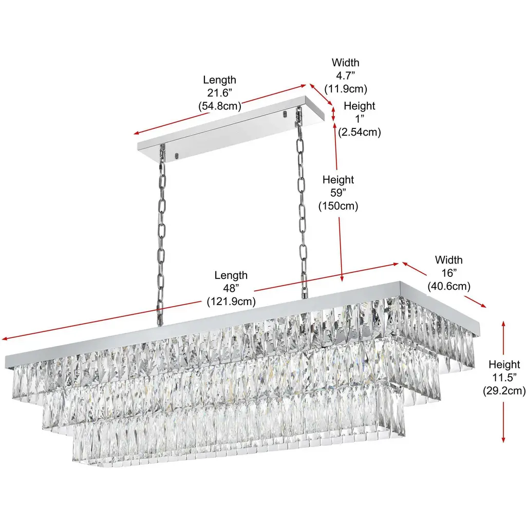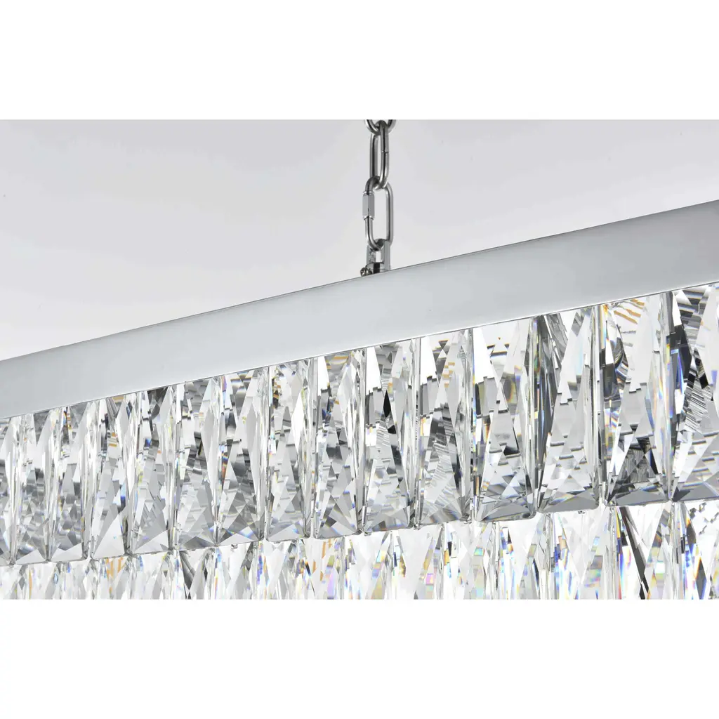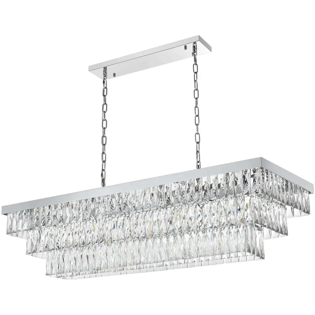Transform your space with this spectacular linear pendant that reinvents crystal lighting for contemporary interiors. The bold rectangular frame suspends two perfectly proportioned crystal tiers, creating a mesmerizing interplay of light and structure. Each precisely cut crystal is strategically positioned to maximize light play, producing brilliant refractions that dance across your space. The strong horizontal presence makes this fixture an ideal centerpiece above dining tables, conference rooms, or in grand living spaces. The thoughtful construction marries industrial strength with crystalline delicacy, as the robust metal frame appears to float above while supporting the spectacular crystal arrangement. Whether styled in reflective chrome, sophisticated black, or warm satin gold, this pendant commands attention through its architectural presence. The linear composition offers a fresh interpretation of crystal lighting, where clean lines and geometric precision meet the spectacular light performance of premium crystal. This fixture doesn't merely illuminate it defines space through its commanding horizontal presence while creating an ever-changing display of light and shadow.