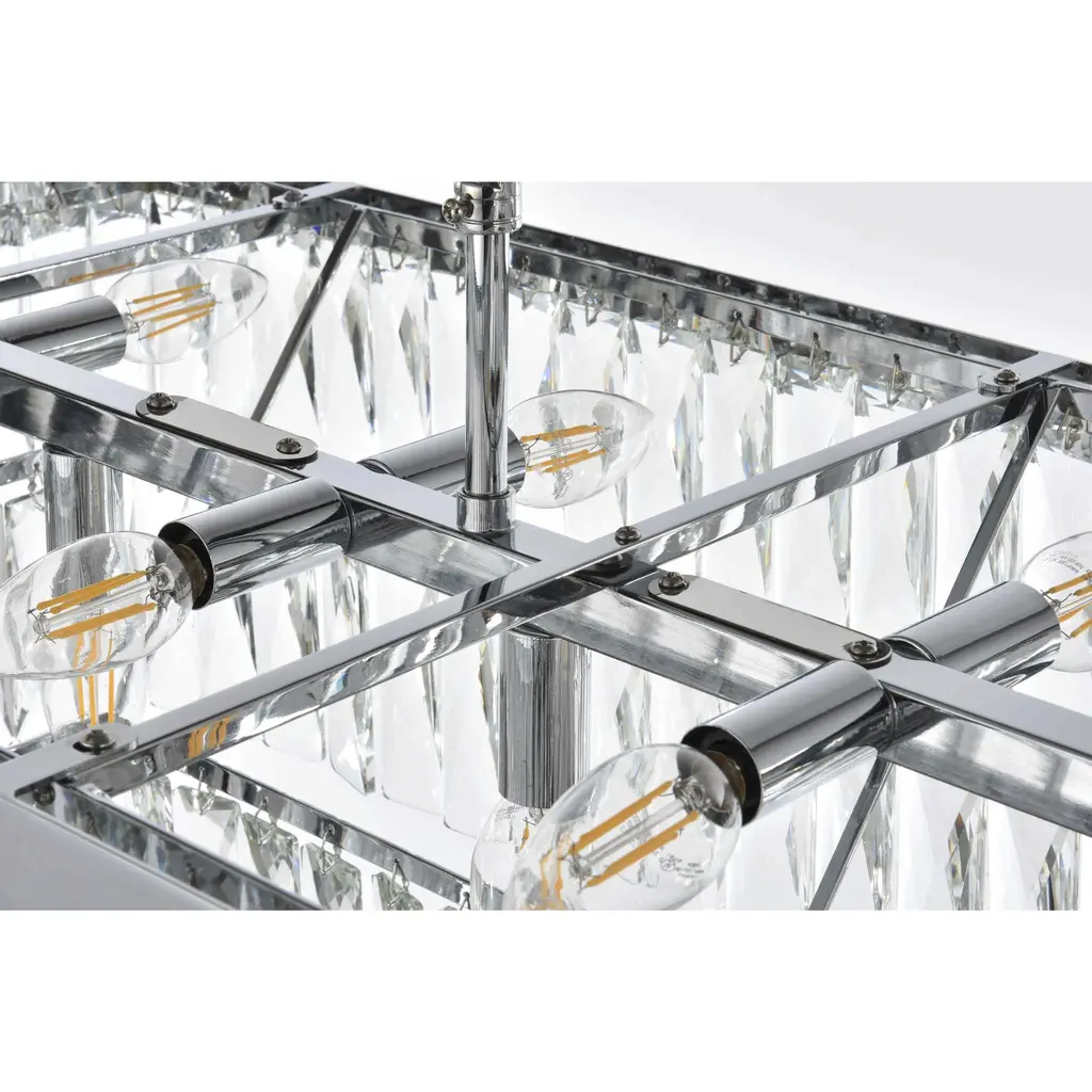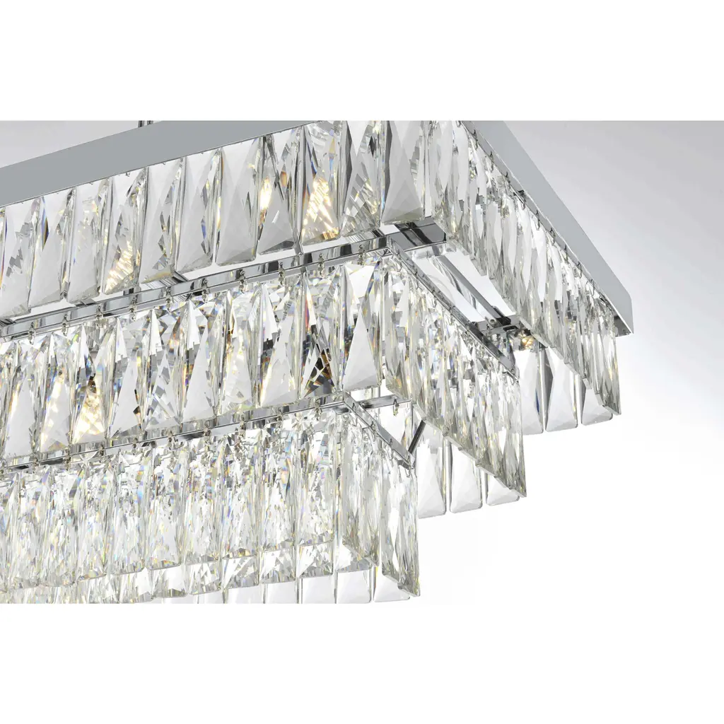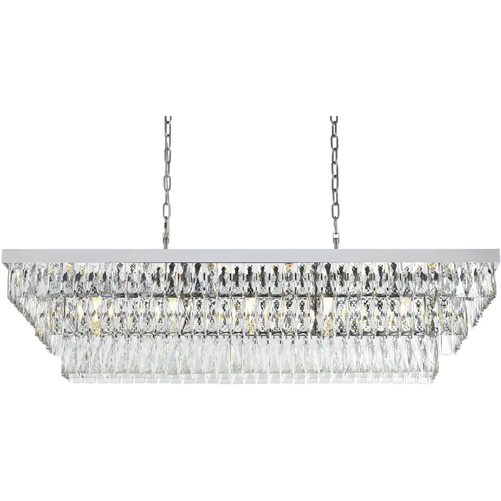 Transform your space with this spectacular linear pendant that reinvents crystal lighting for contemporary interiors. The bold rectangular frame suspends two perfectly proportioned crystal tiers, creating a mesmerizing interplay of light and structure. Each precisely cut crystal is strategically positioned to maximize light play, producing brilliant refractions that dance across your space. The strong horizontal presence makes this fixture an ideal centerpiece above dining tables, conference rooms, or in grand living spaces. The thoughtful construction marries industrial strength with crystalline delicacy, as the robust metal frame appears to float above while supporting the spectacular crystal arrangement. Whether styled in reflective chrome, sophisticated black, or warm satin gold, this pendant commands attention through its architectural presence. The linear composition offers a fresh interpretation of crystal lighting, where clean lines and geometric precision meet the spectacular light performance of premium crystal. This fixture doesn't merely illuminate it defines space through its commanding horizontal presence while creating an ever-changing display of light and shadow.