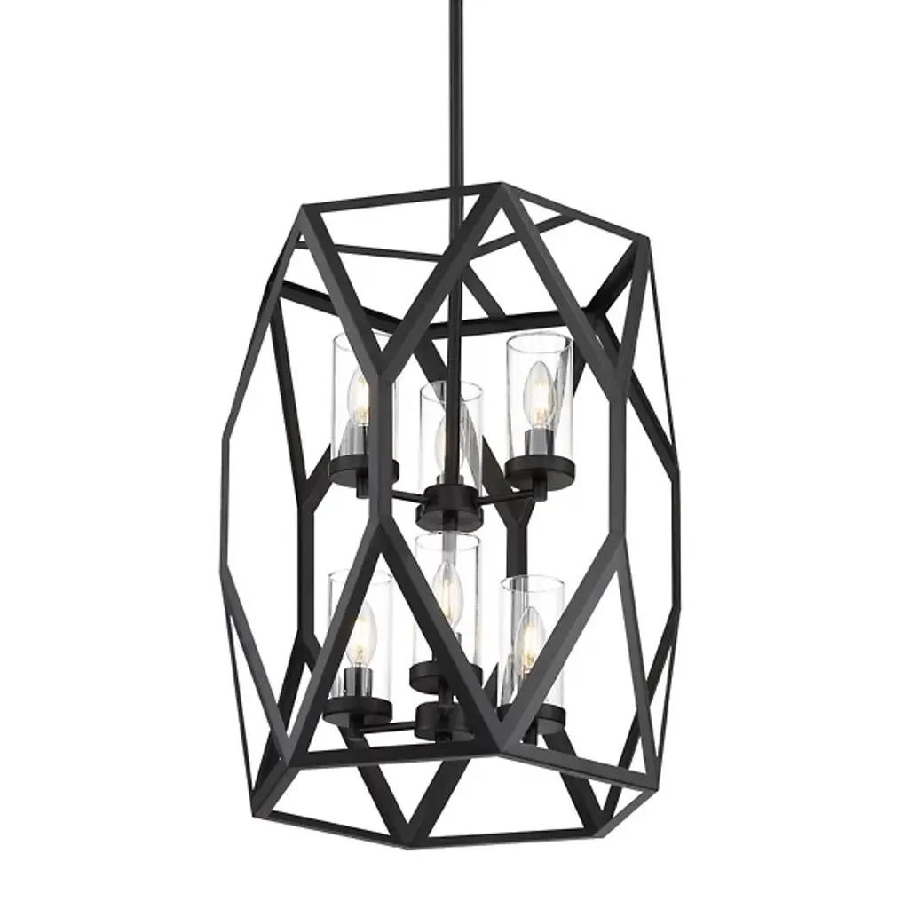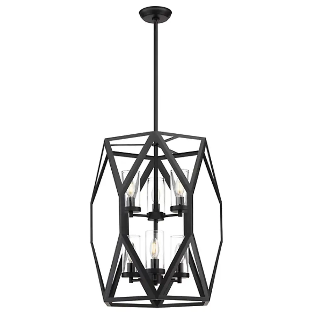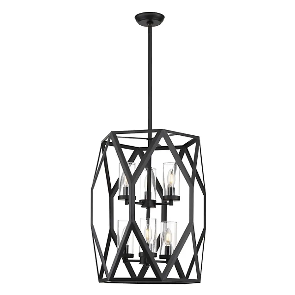 Add an appealing, geometric touch to the décor of your modern home with the Josephine 2-Tier Chandelier from Alder & Ore. A long and thin downrod lowers from the ceiling into the center of a tall, open frame full of angled metal lines. Two sets of candelabra-style bulbs rest at the center, with each bulb individually set within a clear, cylindrical glass shade. The light from the bulbs is bright and even, flowing into the room with a unique presentation of light and shadow as it passes through the outer frame.