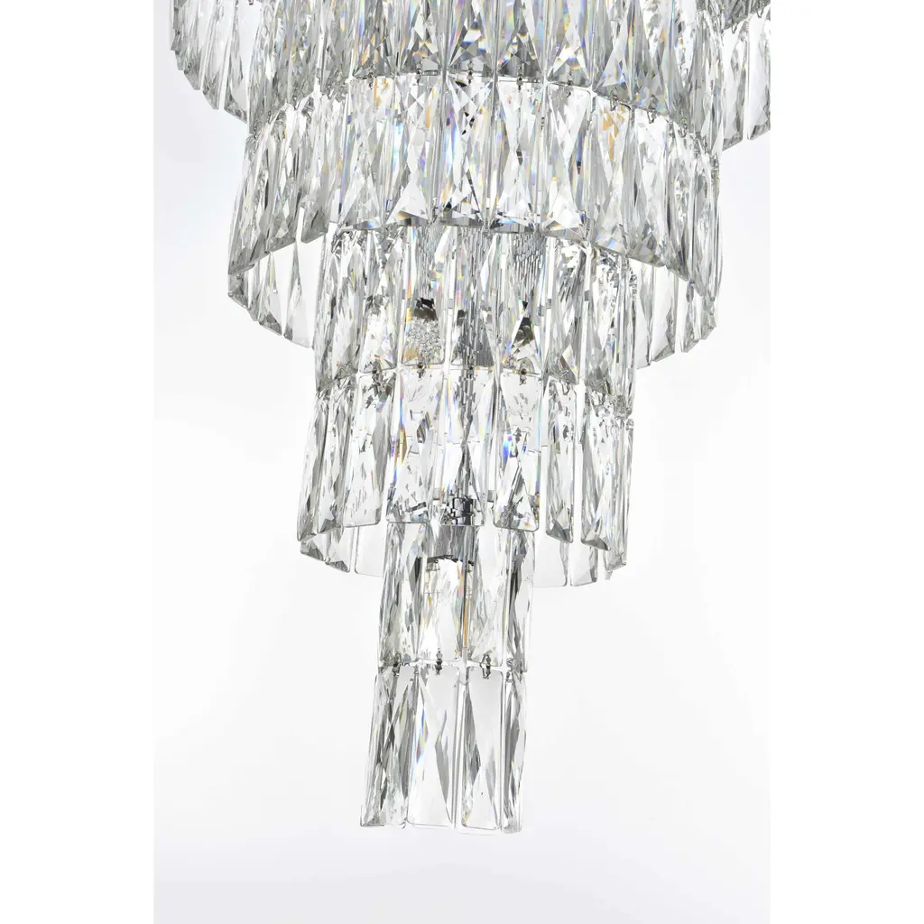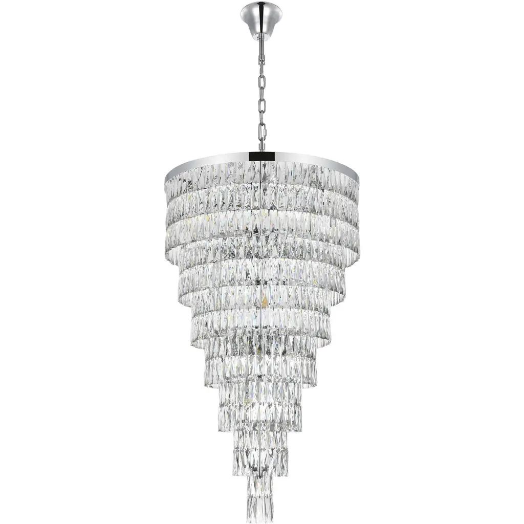 Transform your space with this extraordinary pendant that reimagines classical crystal design for contemporary interiors. The masterfully engineered silhouette features seven graduating tiers that create a spectacular inverted pyramid, reminiscent of a frozen cascade captured in mid-descent. Each precisely cut rectangular crystal is strategically positioned to maximize light play, creating mesmerizing displays of fractured light throughout your space. The substantial scale makes this fixture an ideal centerpiece for grand entryways, sophisticated dining rooms, or executive offices. The thoughtful construction incorporates 41 light sources distributed throughout the tiers, ensuring both spectacular illumination and enchanting crystal animation. The robust iron framework provides a secure foundation while maintaining visual lightness, allowing the crystals to appear as if floating in space. Available in reflective chrome, sophisticated black, or warm satin gold, this pendant makes an unforgettable statement while maintaining refined restraint. The cascading arrangement creates a sense of movement and flow, while the geometric precision of each crystal adds contemporary edge to the classical form. This is more than a light fixture it's an architectural feature that transforms your space through its commanding presence and spectacular light performance.