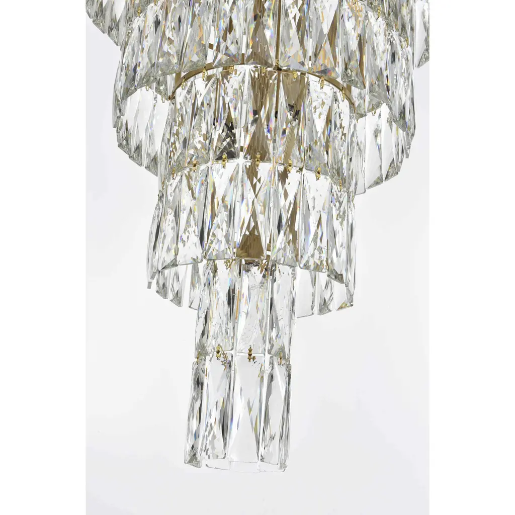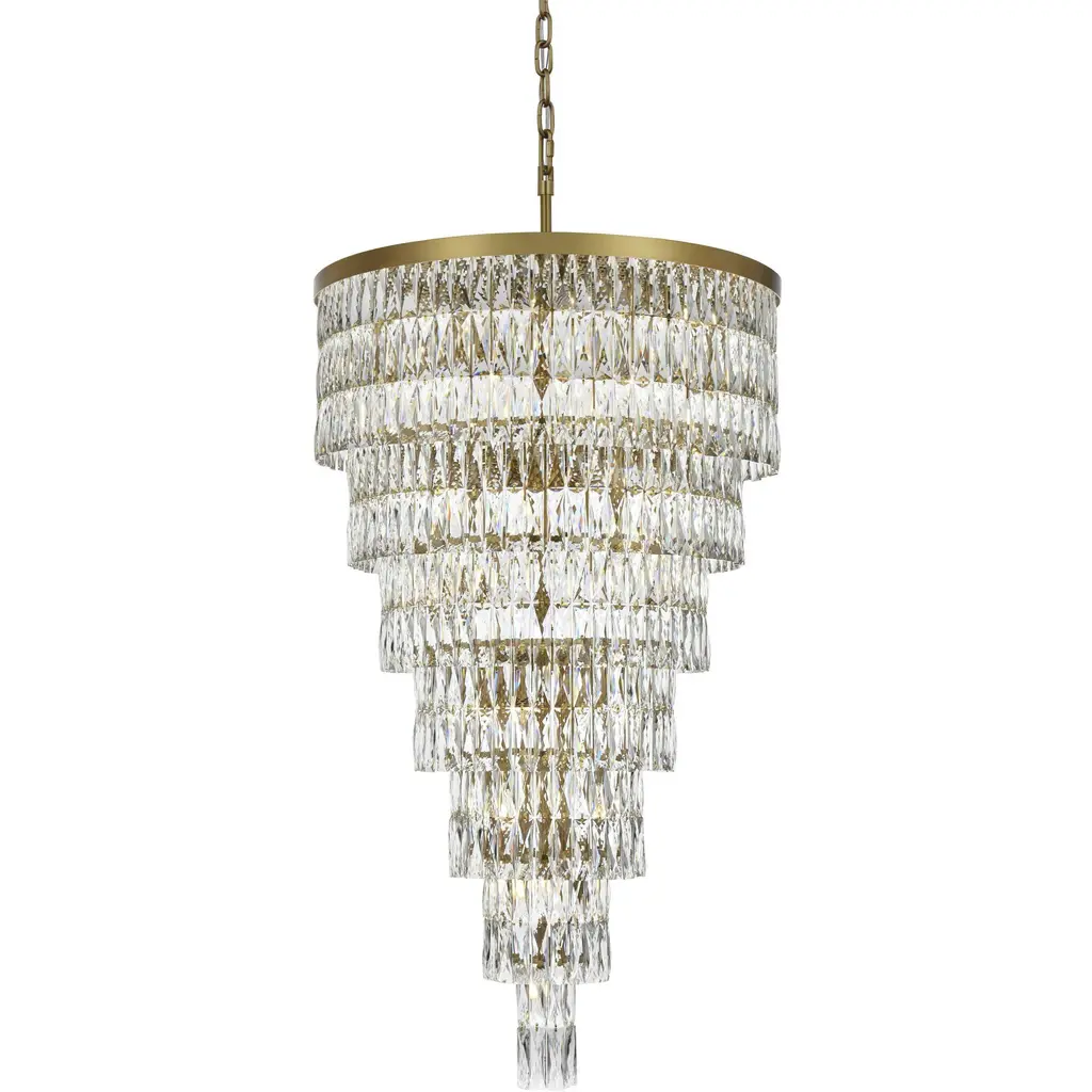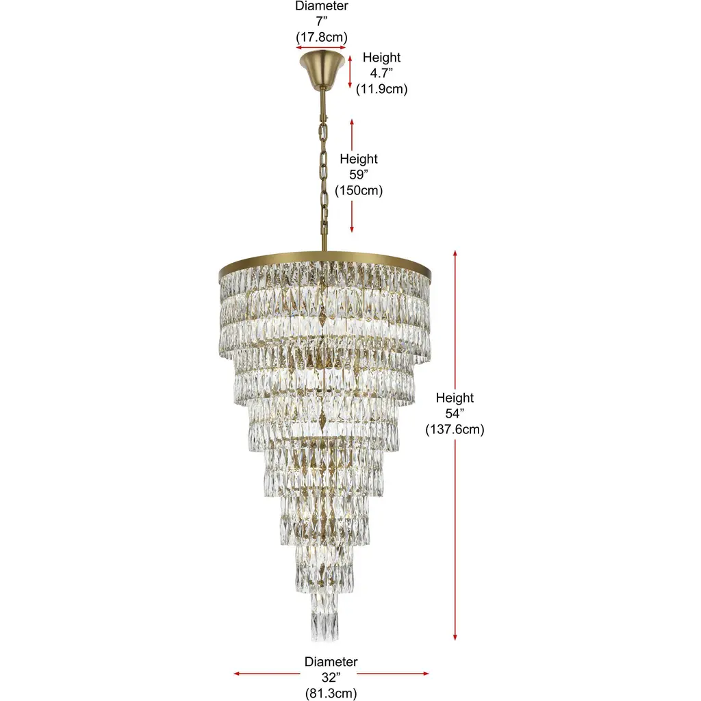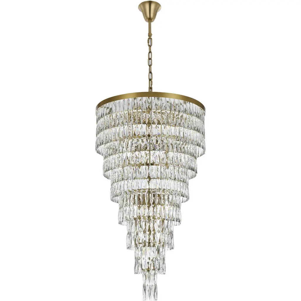 Transform your space with this extraordinary pendant that reimagines classical crystal design for contemporary interiors. The masterfully engineered silhouette features seven graduating tiers that create a spectacular inverted pyramid, reminiscent of a frozen cascade captured in mid-descent. Each precisely cut rectangular crystal is strategically positioned to maximize light play, creating mesmerizing displays of fractured light throughout your space. The substantial scale makes this fixture an ideal centerpiece for grand entryways, sophisticated dining rooms, or executive offices. The thoughtful construction incorporates 41 light sources distributed throughout the tiers, ensuring both spectacular illumination and enchanting crystal animation. The robust iron framework provides a secure foundation while maintaining visual lightness, allowing the crystals to appear as if floating in space. Available in reflective chrome, sophisticated black, or warm satin gold, this pendant makes an unforgettable statement while maintaining refined restraint. The cascading arrangement creates a sense of movement and flow, while the geometric precision of each crystal adds contemporary edge to the classical form. This is more than a light fixture it's an architectural feature that transforms your space through its commanding presence and spectacular light performance.