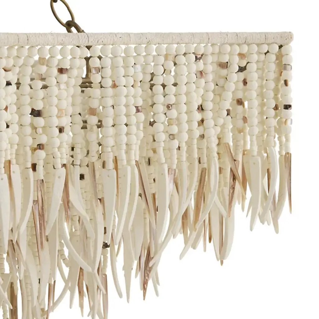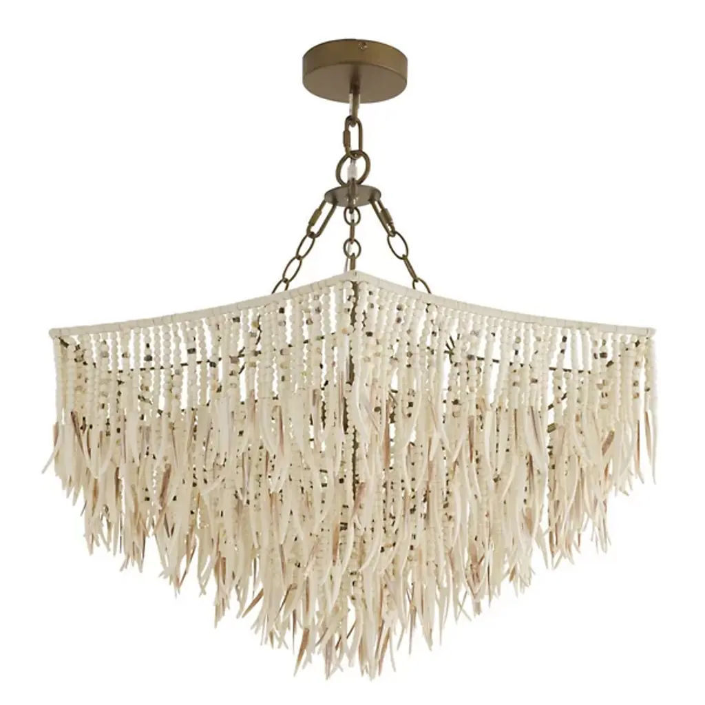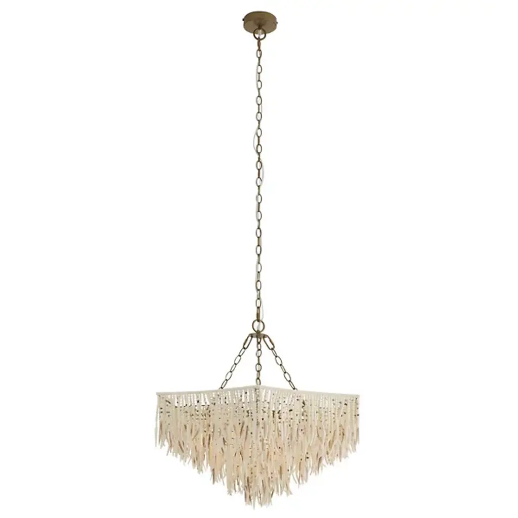 The Josephine Chandelier from Arteriors layers natural materials in cascading tiers, mixing mother-of-pearl shell, white wooden beads, and ivory coconut shell in a composition that recalls draped fabric. Each material brings a unique texture, while the umbrella framework supports the abundant organic elements. Antique brass-plated iron chains provide adjustable suspension, allowing the fixture to function as either a pendant or semi-flush installation. The scalloped arrangement creates movement as light catches the varied surfaces, producing a gentle shimmer.