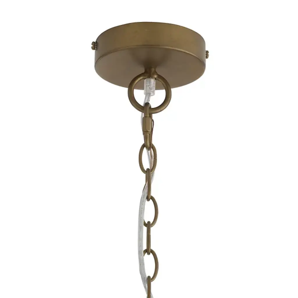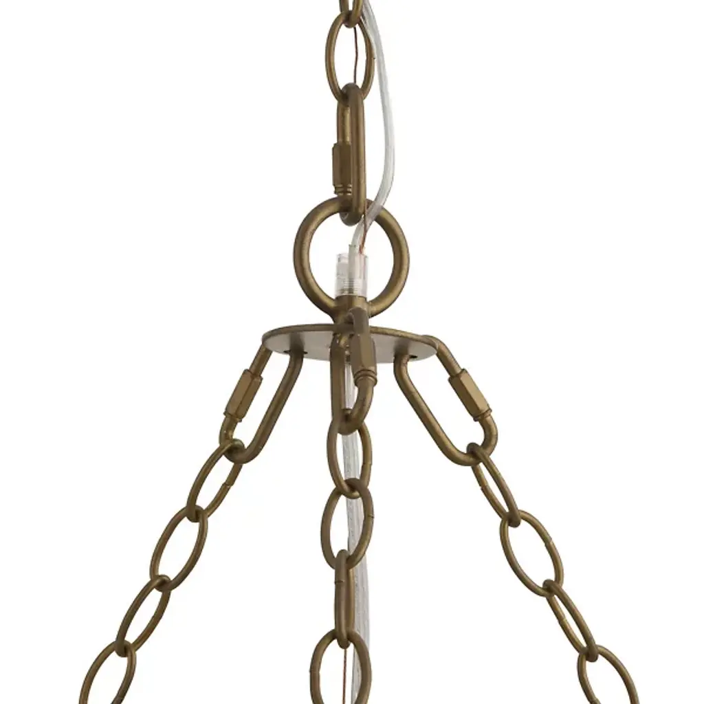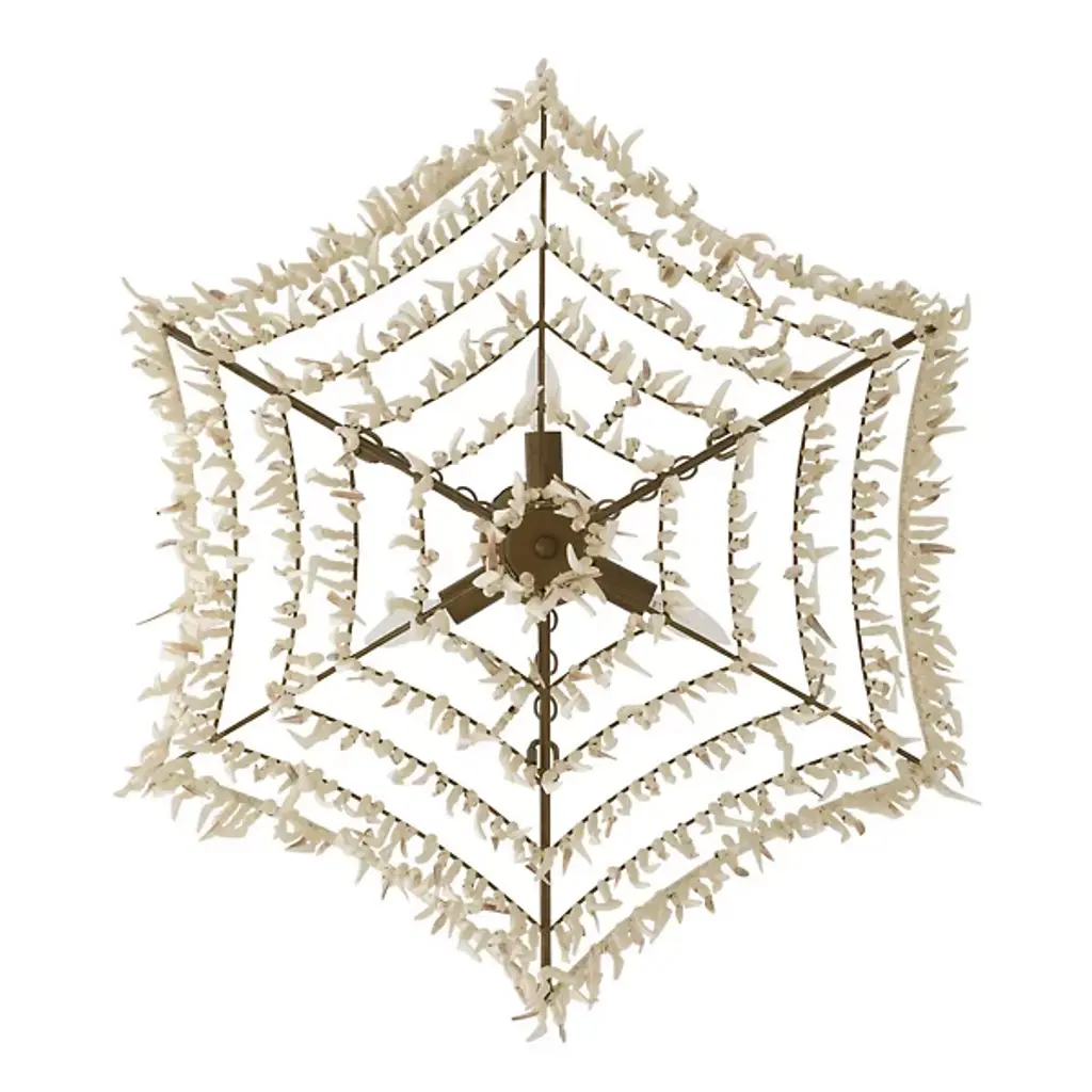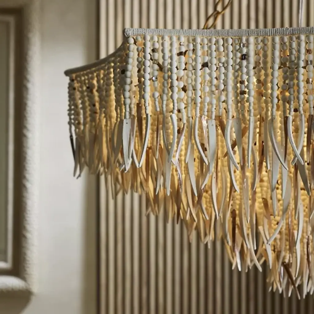 The Josephine Chandelier from Arteriors layers natural materials in cascading tiers, mixing mother-of-pearl shell, white wooden beads, and ivory coconut shell in a composition that recalls draped fabric. Each material brings a unique texture, while the umbrella framework supports the abundant organic elements. Antique brass-plated iron chains provide adjustable suspension, allowing the fixture to function as either a pendant or semi-flush installation. The scalloped arrangement creates movement as light catches the varied surfaces, producing a gentle shimmer.