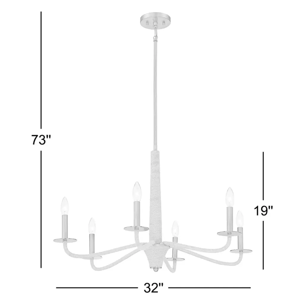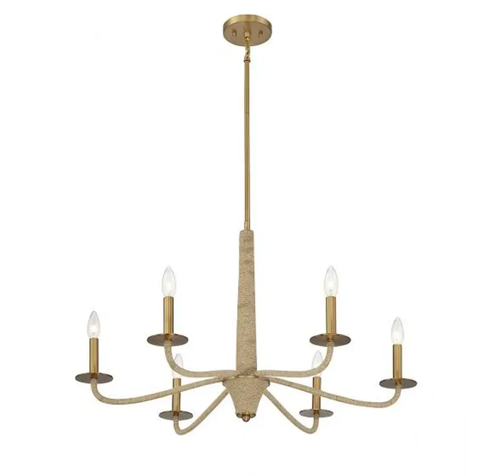 The 6-light chandelier beautifully combines coastal, transitional, and glamorous decor touches to create an extraordinary lighting look for today's stylish homes. The rope is wrapped around select elements of the structure, which is finished in warm brass. It is 32" in diameter and has an adjustable height ranging from 19" to 73". It uses six candelabra size bulbs with a max of 60 watts per bulb. Comes with four 12" down rods and one 6" down rod, plus 80" of cord.