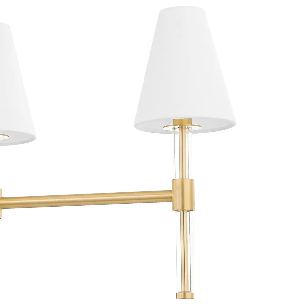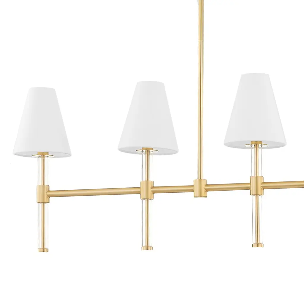 Clear acrylic jackets over the five arms and crisp white linen shades heighten the sophistication of this gleaming linear chandelier. Because it's damp rated, you can use the fixture in a bathroom as well as over a dining table, in an entry, or just about anywhere else in your home.