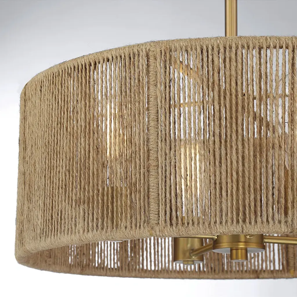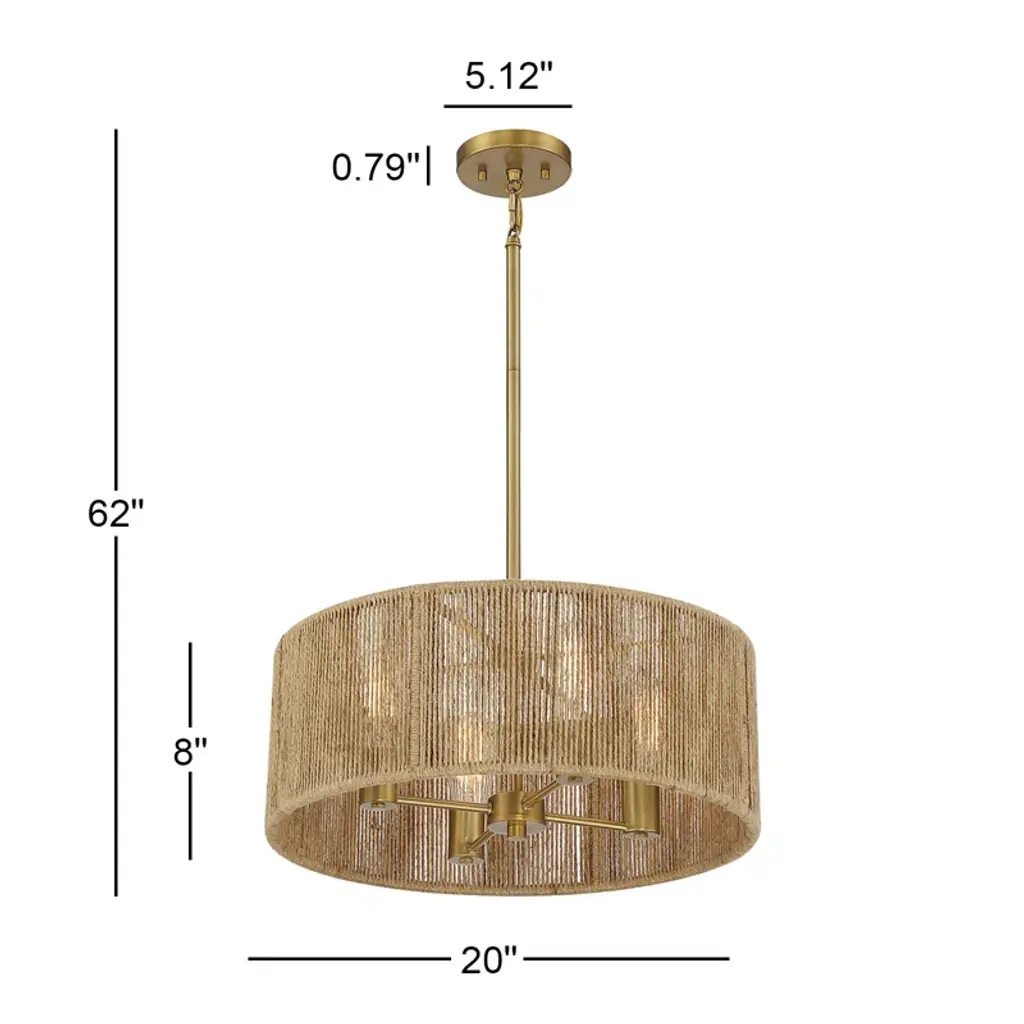 Our 4-light chandelier warmly welcomes your guests into your home. Crafted from steel, it has a brass finish that offers a distinctive contrast to the rope-woven drum shade. It accommodates four 60W max bulbs (sold separately), and the mix of materials combines natural and vintage elements to complement various décor styles. Illuminate your hallway or dining room with the ambient glow of this eye-catching fixture.