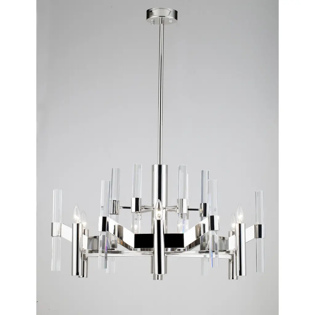 12-Light 40" Oval Contemporary Linear Chandelier with Solid Clear Glass Cylinders Placed within Decorative Polished Nickel Frame.