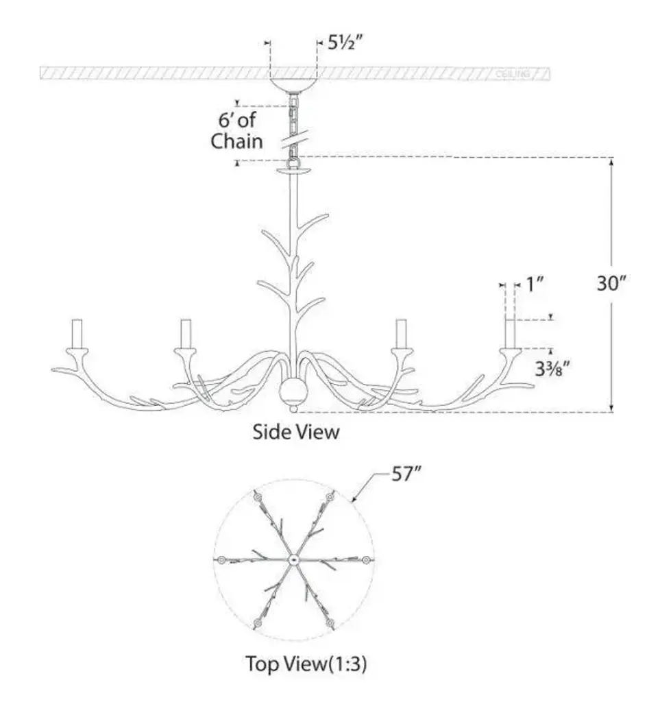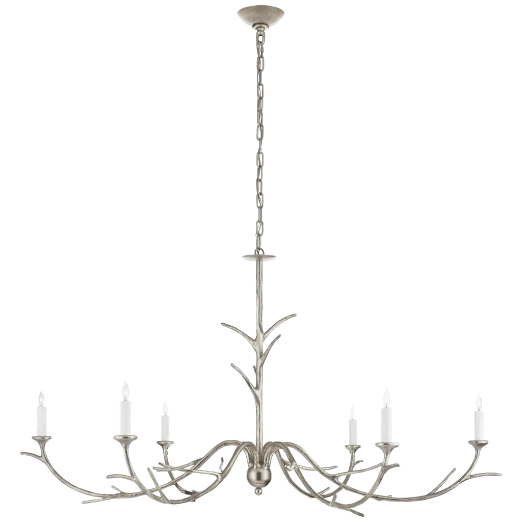 Iberia Large Chandelier in Burnished Silver Leaf Designer: Julie Neill Canopy: 5.5" Round Mounting: Chain Shade Detail: No Option Socket: 6 - E12 Candelabra Wattage: 6 - 40 C11 Safety Rating Location: DRY