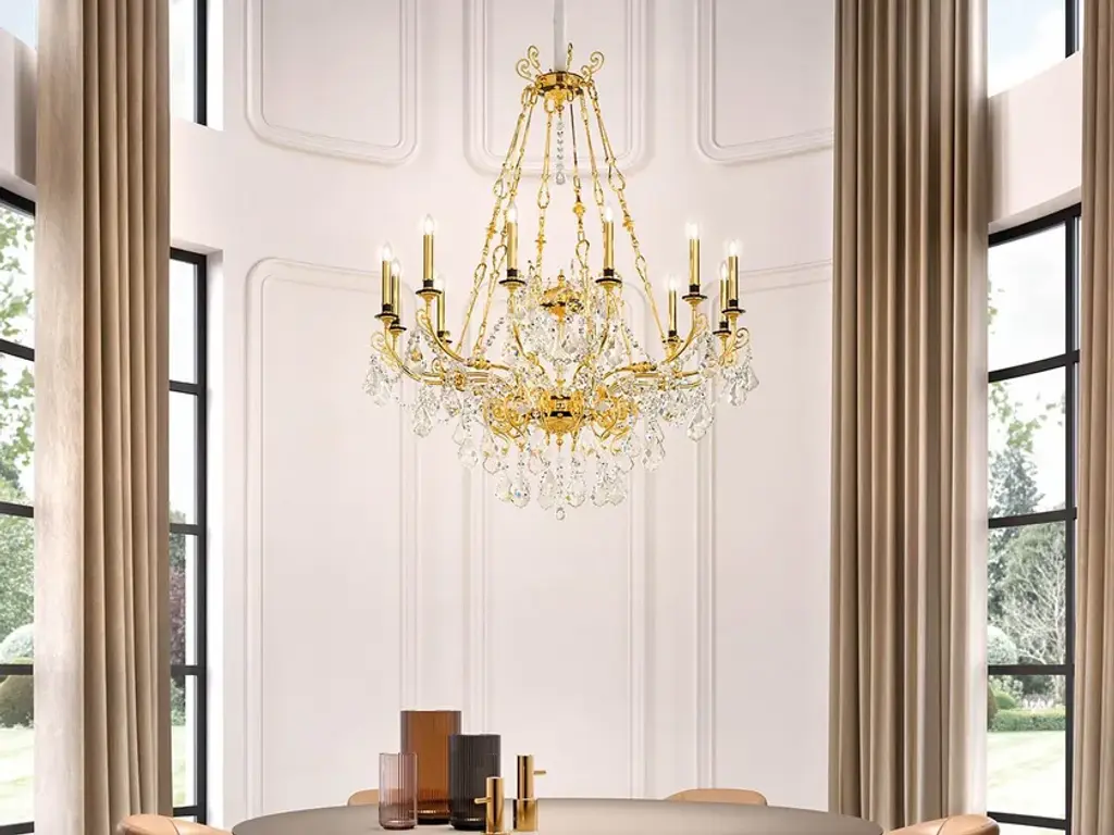Metal finish: shiny gold - shiny chrome - grey painted.Colours: Julienne clear: central body, arms and final cup with bobeche in colour amethyst.Julienne fumè: central body, arms and final cup with bobeche in colour fumè.Julienne mirror: central body, arms and final cup with bobeche in colour amethyst.Julienne amber: central body, arms and final cup with bobeche and cups in amber colours.Julienne red & gold: central body, arms, cup and bobeche are in matt red color.Julienne black & gold: central body, arms, cup and bobeche are in matt black color.Other colours on request.Particular: central body, arms and cup made in Veneto.Cups made in Tuscany.Pendants and decorative elements handmade in 24K gold finish embellished with Swarovski® crystals.