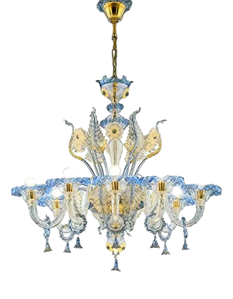 Metal finish: shiny gold - shiny chrome - grey painted.Colours: Julienne clear: central body, arms and final cup with bobeche in colour amethyst.Julienne fumè: central body, arms and final cup with bobeche in colour fumè.Julienne mirror: central body, arms and final cup with bobeche in colour amethyst.Julienne amber: central body, arms and final cup with bobeche and cups in amber colours.Julienne red & gold: central body, arms, cup and bobeche are in matt red color.Julienne black & gold: central body, arms, cup and bobeche are in matt black color.Other colours on request.Particular: central body, arms and cup made in Veneto.Cups made in Tuscany.Pendants and decorative elements handmade in 24K gold finish embellished with Swarovski® crystals.