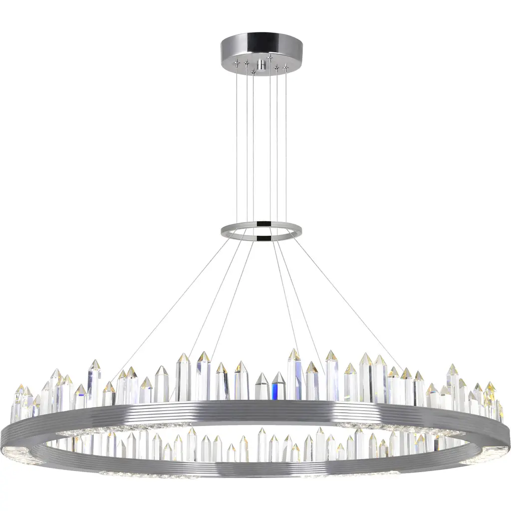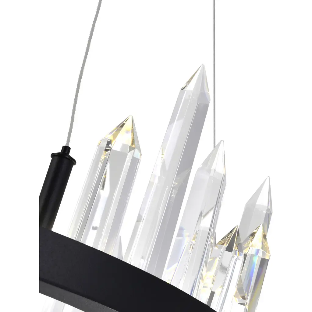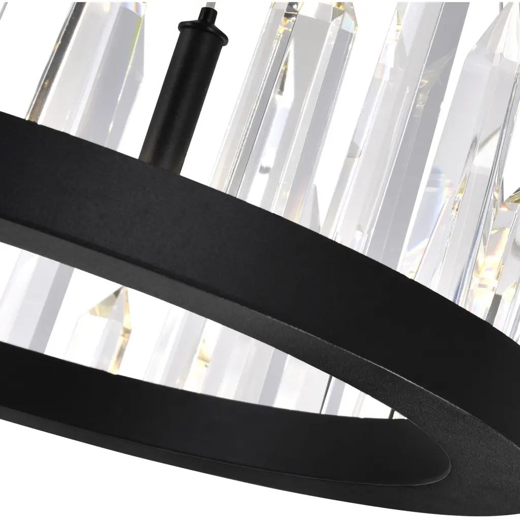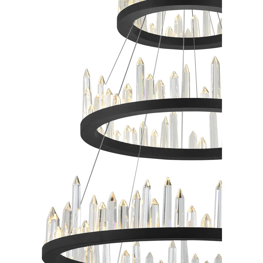 This striking 42-inch chandelier blends modern geometry with timeless elegance, featuring three sleek black metal rings layered with clear crystal prisms for a dazzling light display. The integrated LED lighting ensures energy-efficient, long-lasting brilliance, casting a warm and inviting glow. Its transitional design effortlessly complements contemporary, or industrial decor, making it a versatile centerpiece. Perfect for living rooms, dining areas, or grand entryways, it adds instant sophistication to any space. With its bold yet refined silhouette, the Juliette Chandelier transforms your home into a conversation-starting showcase.