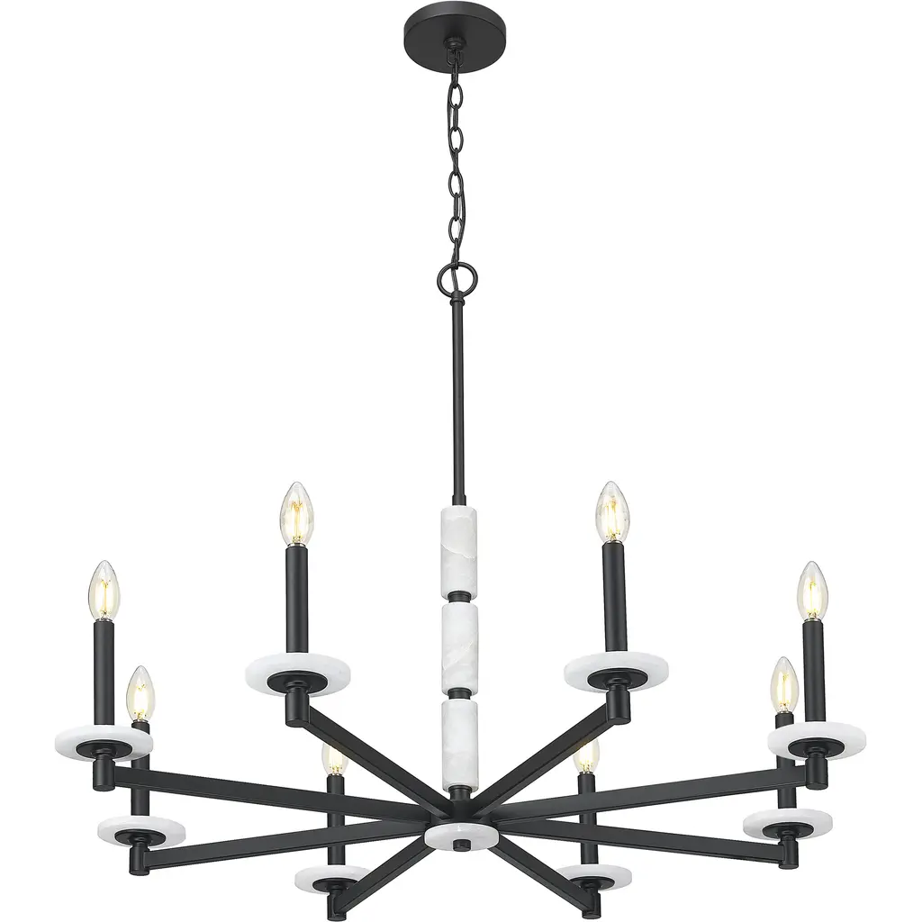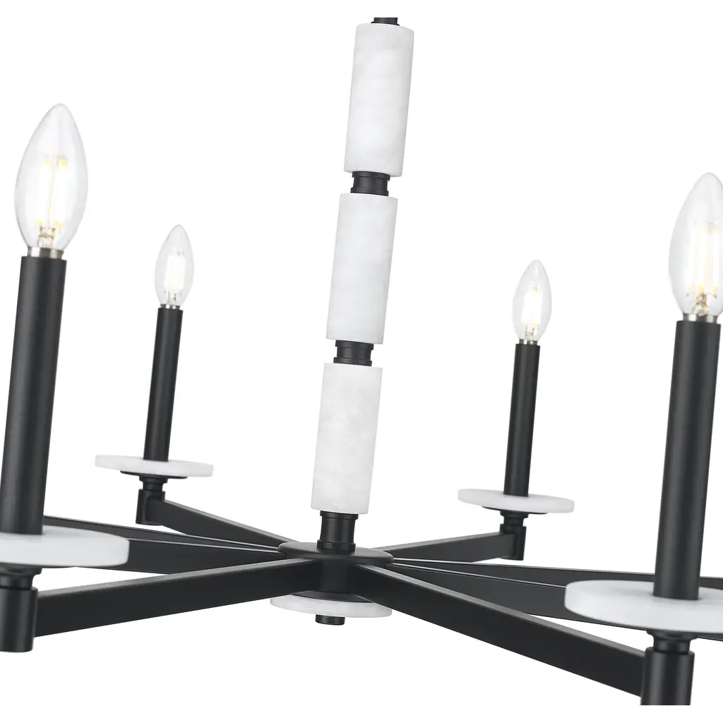 This chandelier brings bold elegance to the heart of the room. Eight alabaster spheres circle a matte black frame, offering contrast and glow in perfect measure. With its sculptural layout and soft light, its made to captivate.