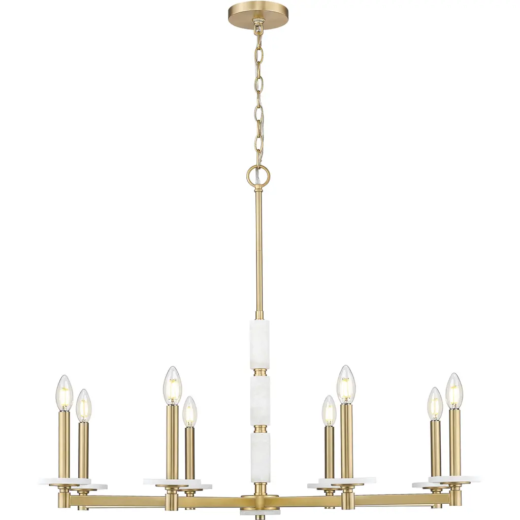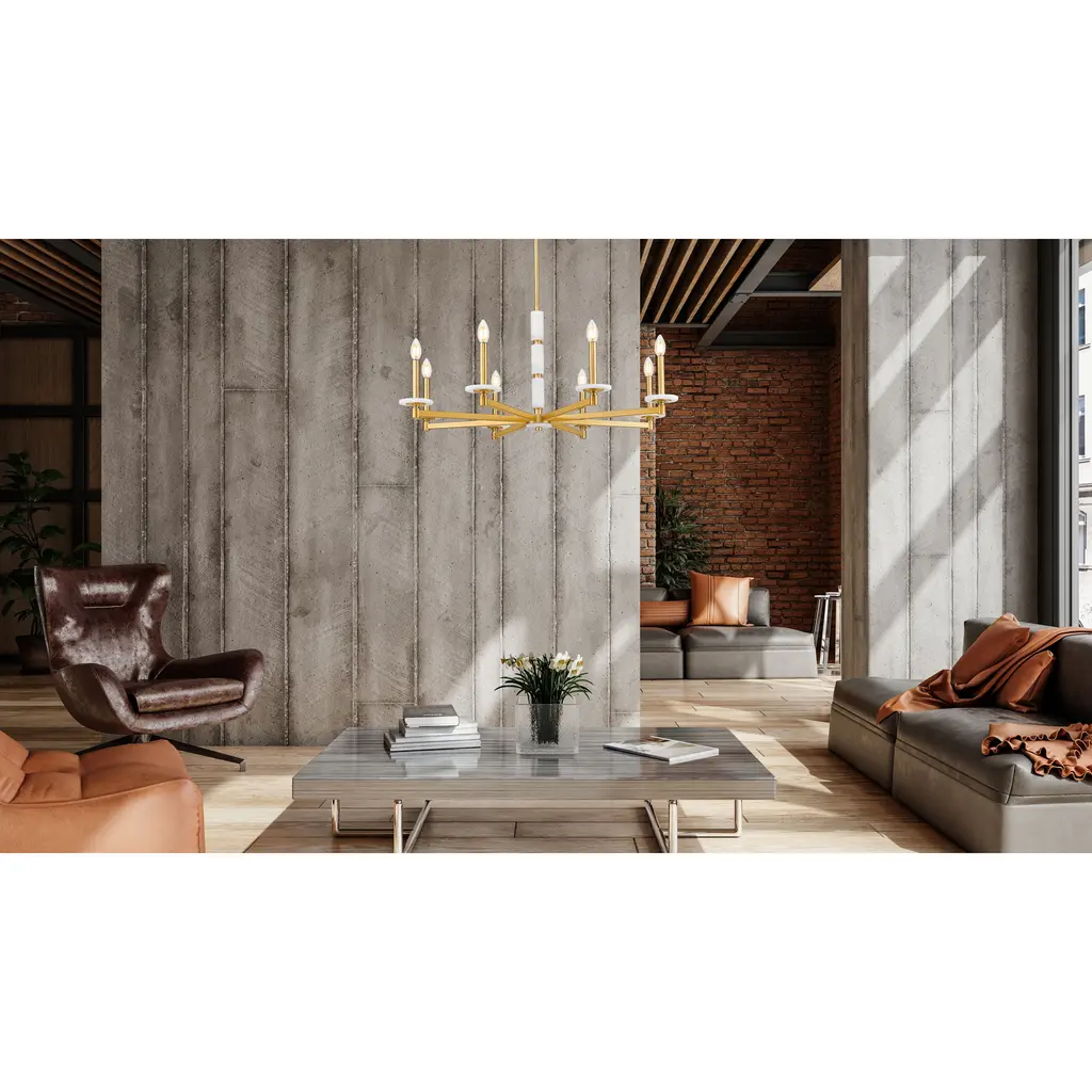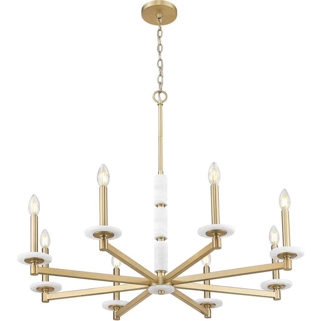 Looking for an effortless fusion of warmth, balance, and beauty The modern gold frame of this stunning eight-light chandelier curves gracefully around eight alabaster spheres, each one glowing with a natural, calming light. It brings softness to high ceilings and a golden tone to every gathering.