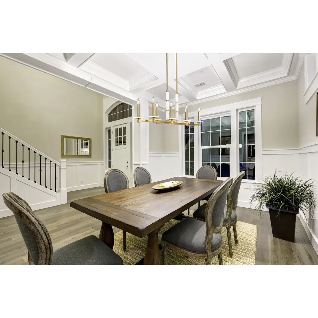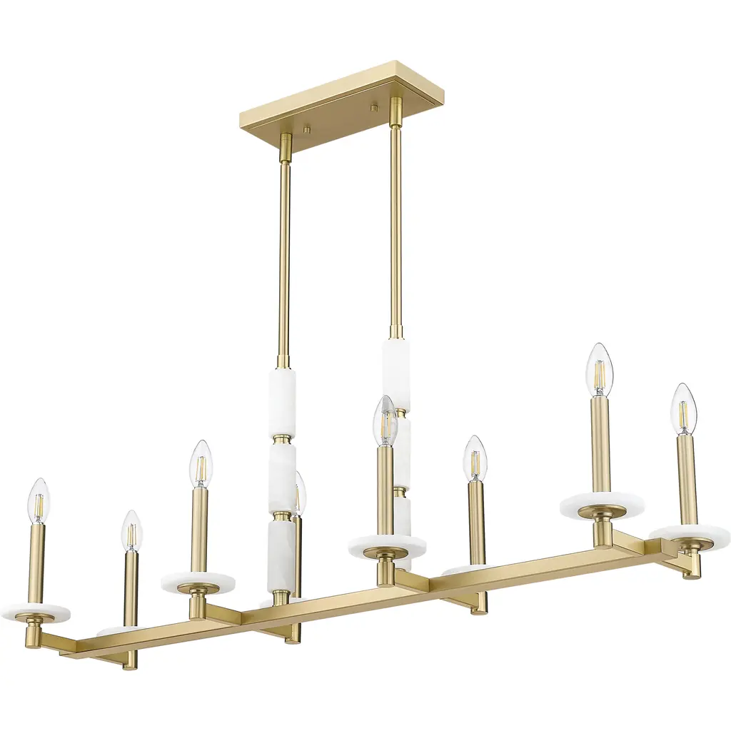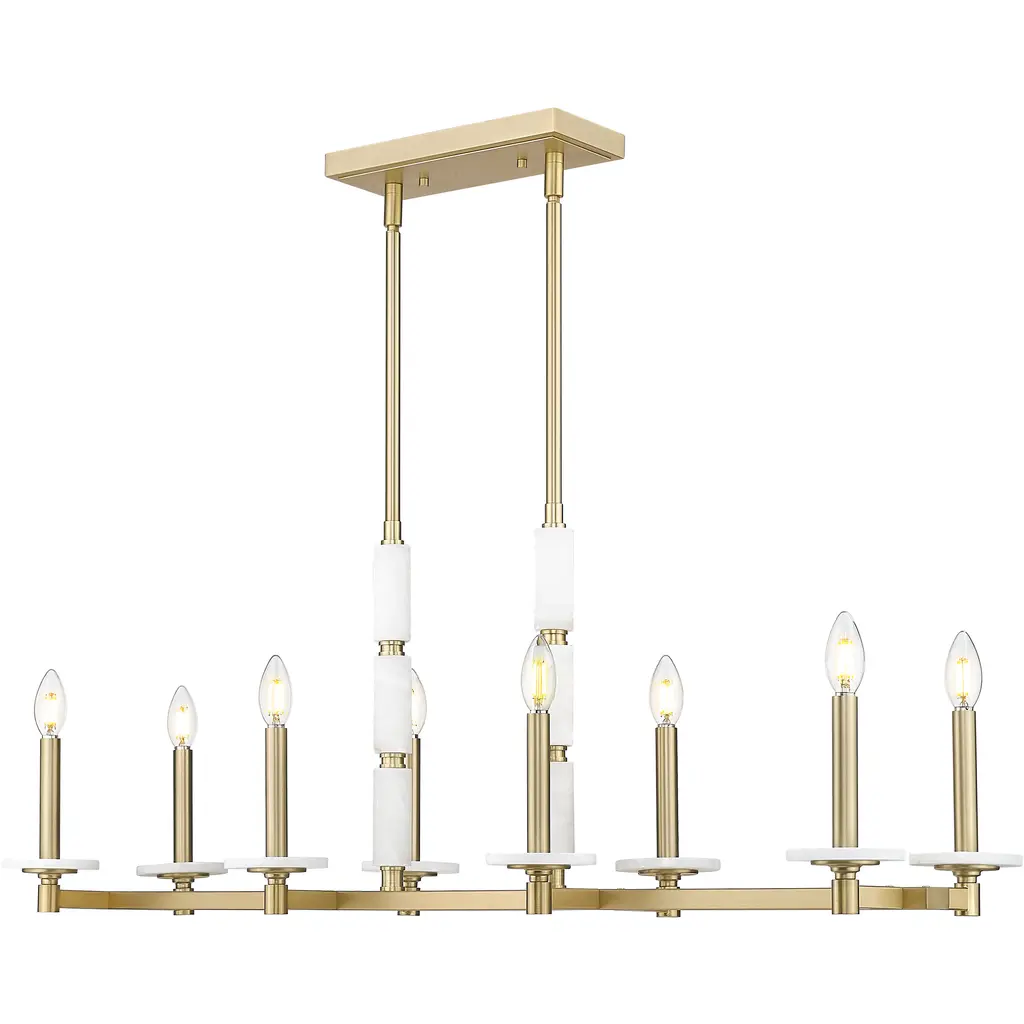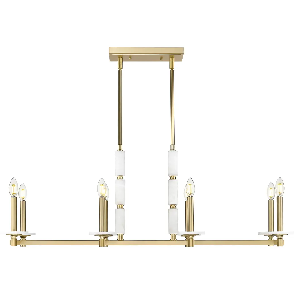 Brilliant in form and golden in tone, this linear chandelier is built to impress. Eight alabaster globes float in a warm modern gold structure, casting a soft and even glow across long surfaces. Ideal for open layouts, it delivers elegant scale with a whisper of glamor.