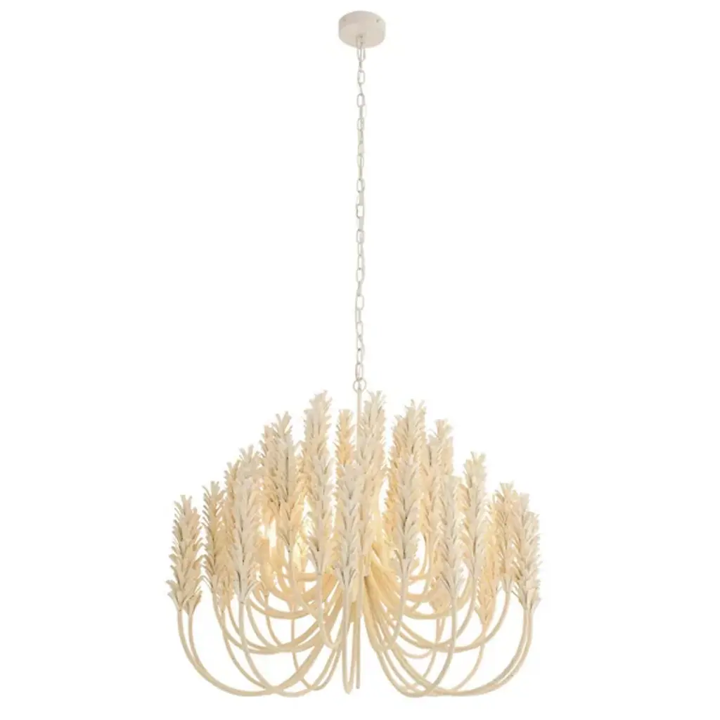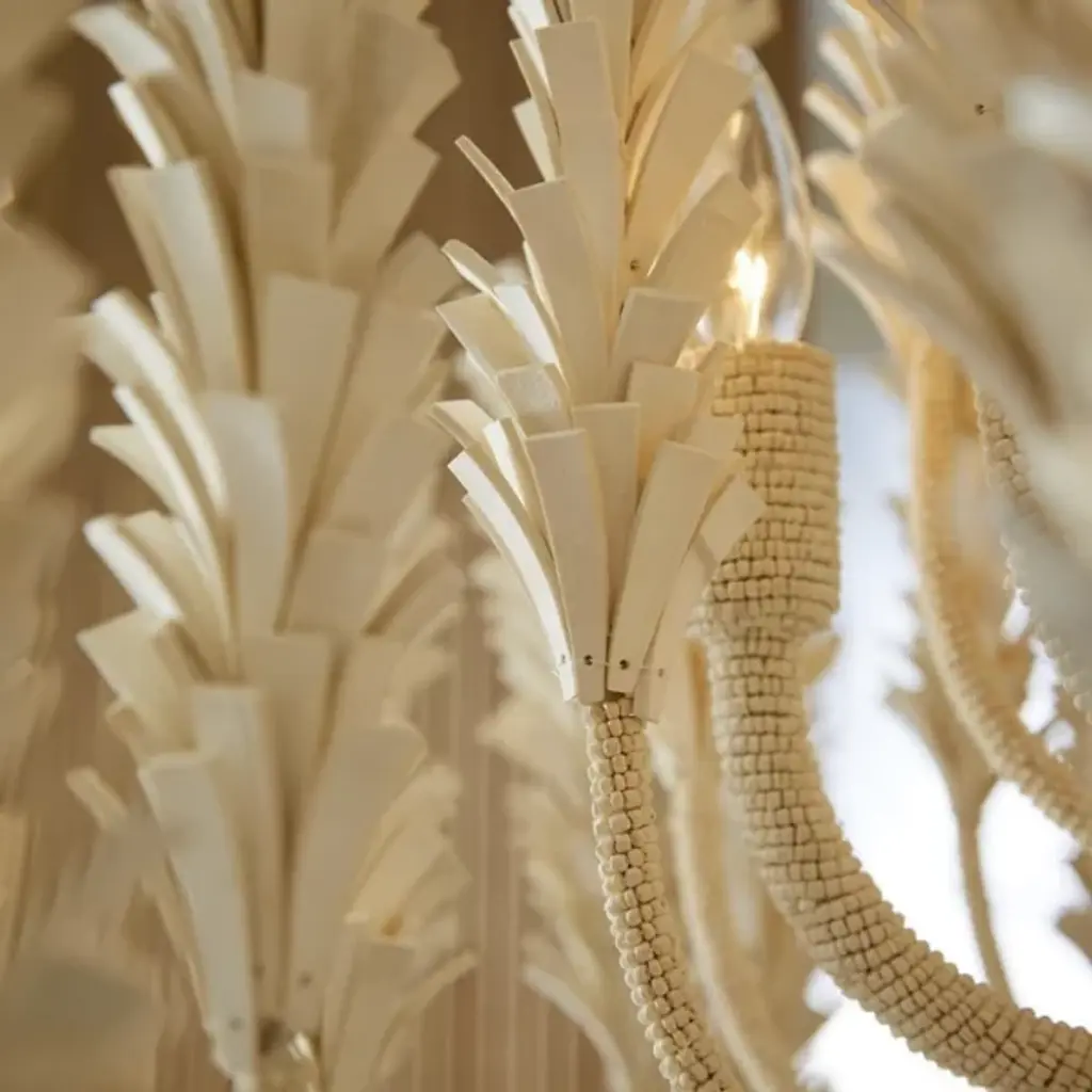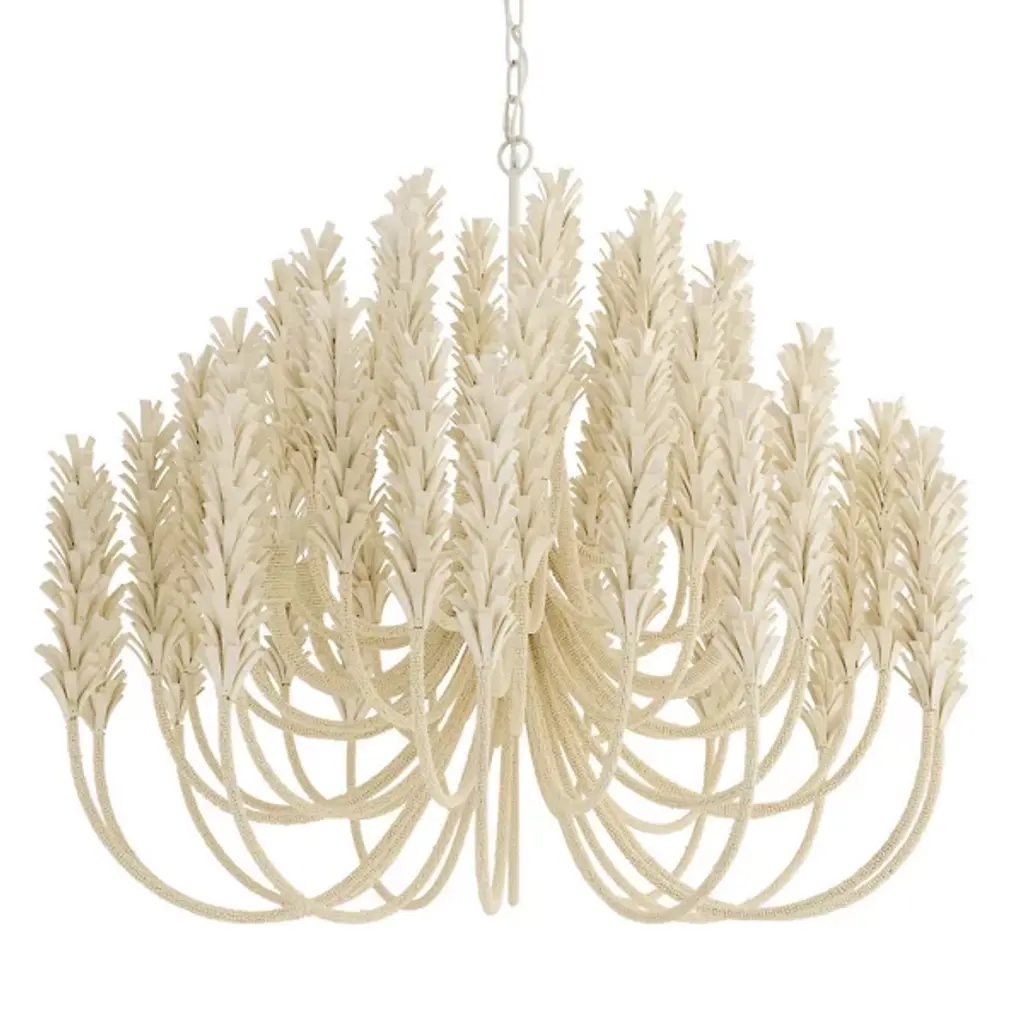 The Kaia Chandelier from Arteriors features curved white iron arms adorned with cascading layers of ivory coconut shell, resembling crystallized formations. Each beaded stem creates rich texture while the arms add movement to the organic composition. The abundant shell detailing catches and reflects light, producing a shimmering effect when illuminated. The iron framework provides structural support while disappearing behind the natural shell embellishments. This piece combines coastal materials with sculptural presence, bringing natural texture and dramatic overhead lighting through its shell-adorned arms and flowing curves.