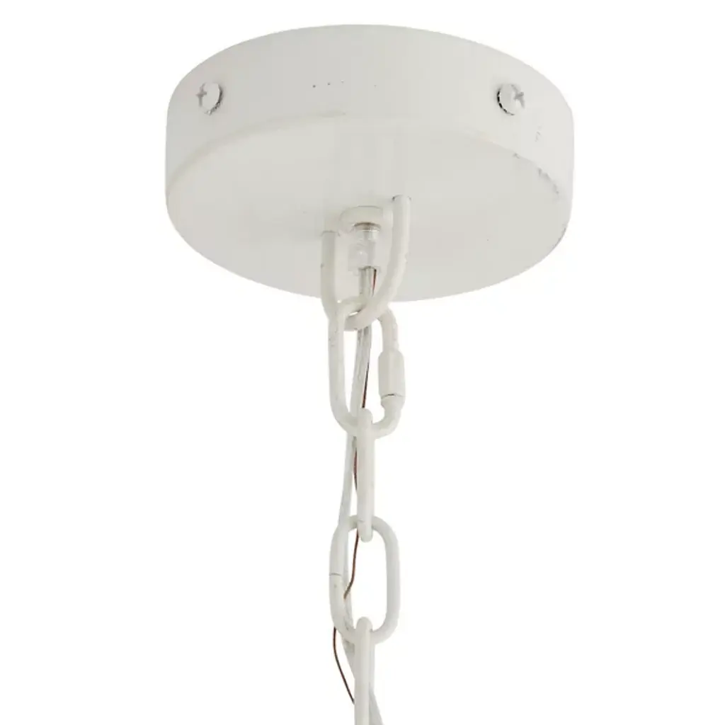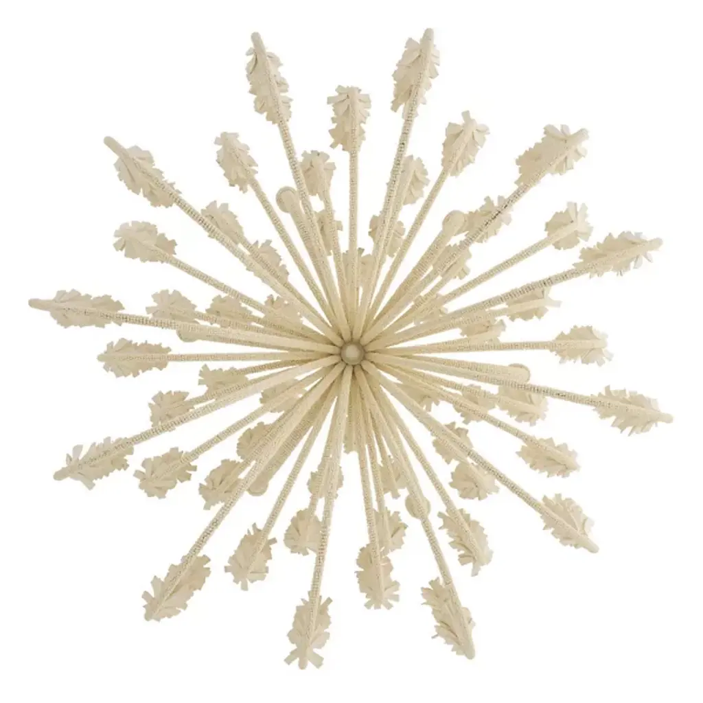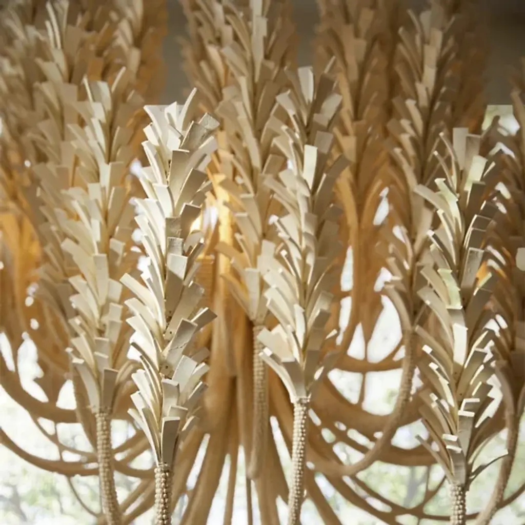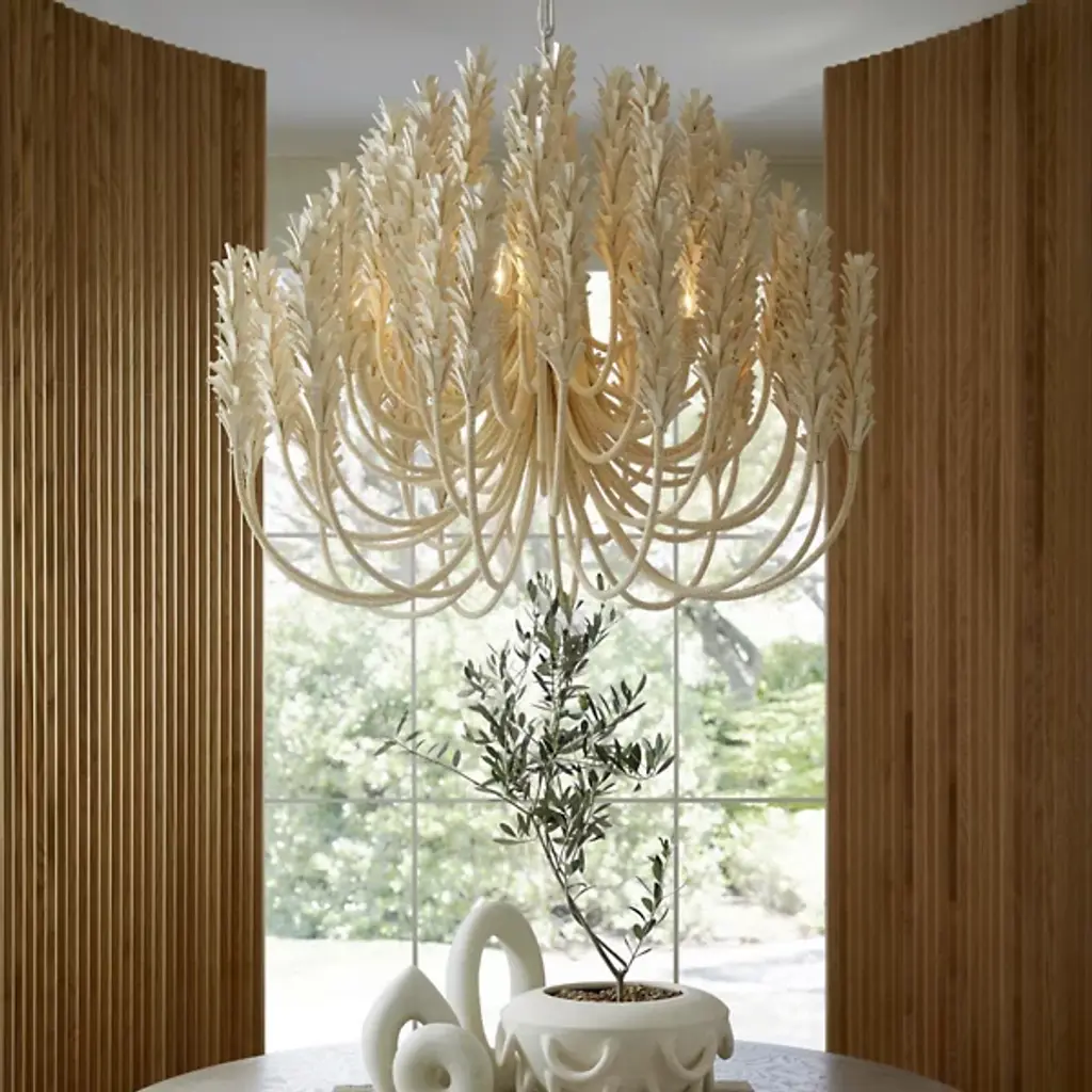 The Kaia Chandelier from Arteriors features curved white iron arms adorned with cascading layers of ivory coconut shell, resembling crystallized formations. Each beaded stem creates rich texture while the arms add movement to the organic composition. The abundant shell detailing catches and reflects light, producing a shimmering effect when illuminated. The iron framework provides structural support while disappearing behind the natural shell embellishments. This piece combines coastal materials with sculptural presence, bringing natural texture and dramatic overhead lighting through its shell-adorned arms and flowing curves.
