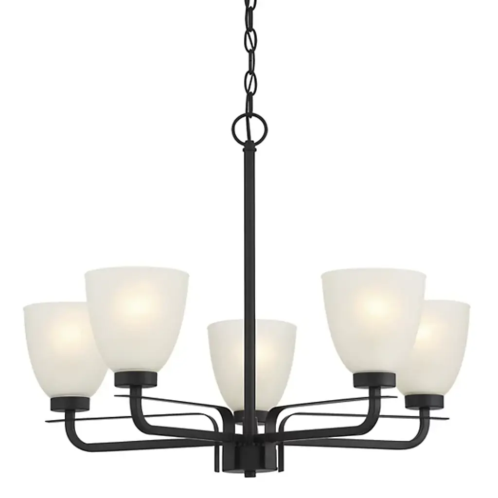 Lend an open and elegant note to your interiors with the appealing style of the Kaitlen Chandelier from Minka-Lavery. Suspended from above by a smooth disc canopy and a medium weight chain threaded through an upper ring finial, it extends a central stem down to a lower hub, which anchors four upward curling arms. Each arm is accented by a flat brace that arcs over at an opposing angle and ends in a damp-listed socket set inside a curving, etched glass cup shade. The shades’ open tops cast a direct splash of light above the fixture, while their translucent sides transform bright glare into an even ambiance.