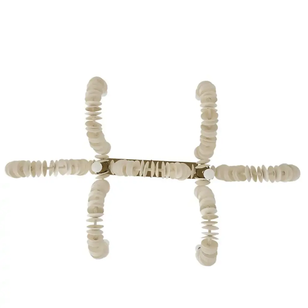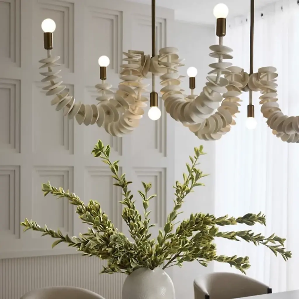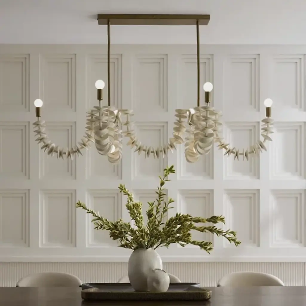 The Kalama Linear Chandelier from Arteriors features coconut shell discs strung along a jute cord that drapes between iron pipes like nature's jewelry. Each strand cascades from the rectangular framework, creating a sense of organic movement. Natural shell material brings texture and warmth to metal construction, while jute wrapping softens the industrial framework. This dramatic suspension recalls tribal necklaces, with a matching square canopy anchoring flowing elements to the ceiling with understated geometric precision.