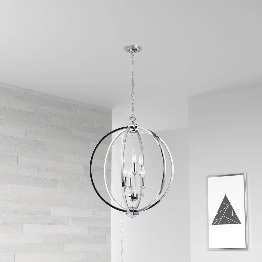 It's the details that make the design, and that's apparent in the Karland family of lighting. The simple appeal of the circle is the base for an appealing line of lighting with a timeless and pretty look. A chain drop suspends the metal frame, a rounded cage created with three open circles in a gleaming polished chrome finish. Within that modern construction, a cluster of lights are set in a housing inspired by traditional candle sconces. Shimmering crystals stud the inside of each band, reflecting and amplifying the light. You'll add a decidedly romantic and artistic touch to any dining room, and a welcoming glow to your foyer or main hall.