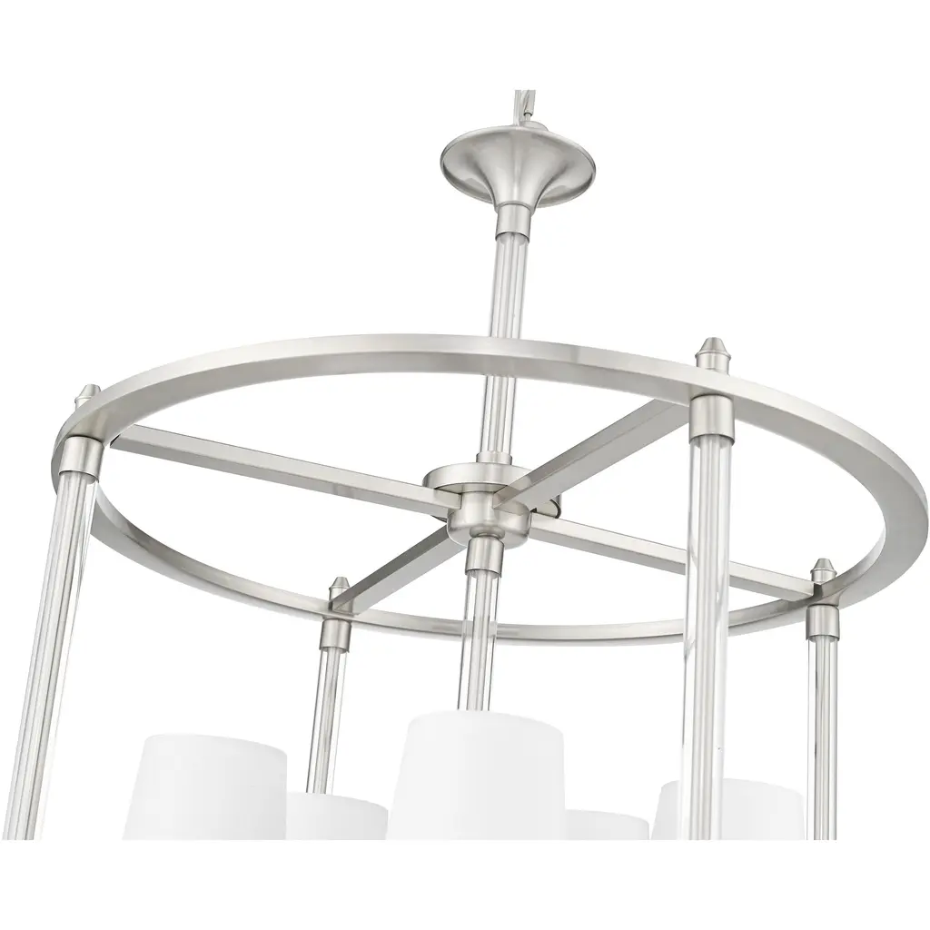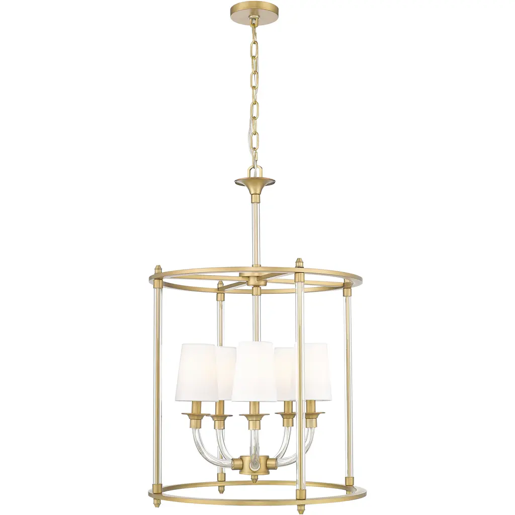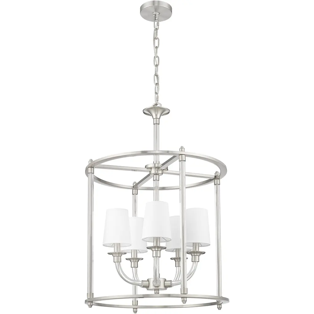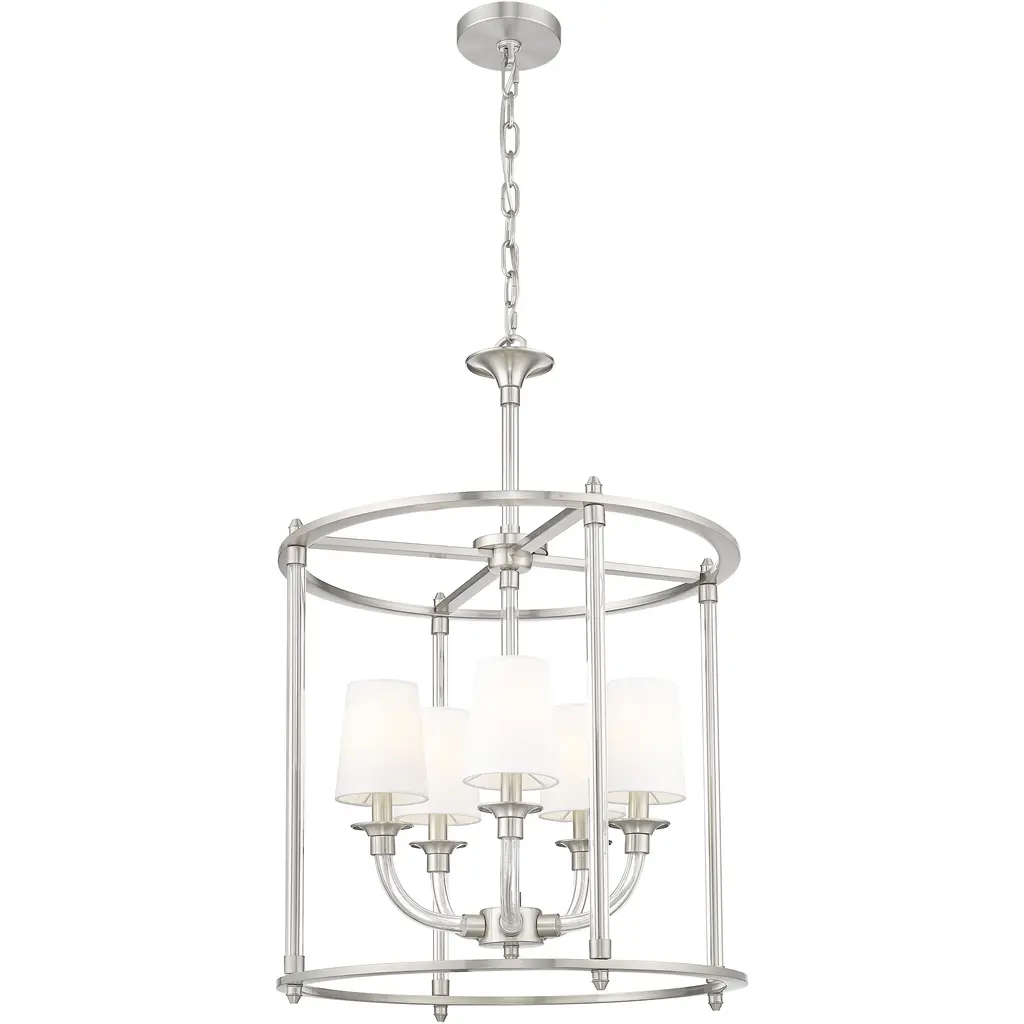 An open cage motif creates depth and definition for this modern five-light chandelier. In brushed nickel, it gleams in the light and shows off five delicately curved glass arms, lending lightness and elegant character. Tapering white fabric shades ensure soft, glowing ambiance, perfect for living and dining rooms.