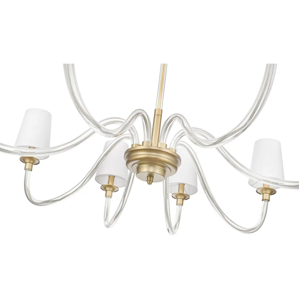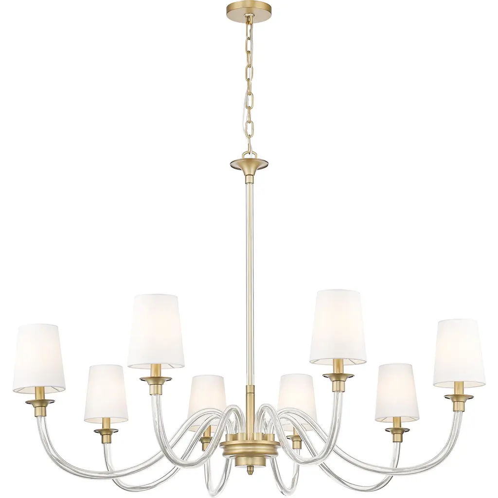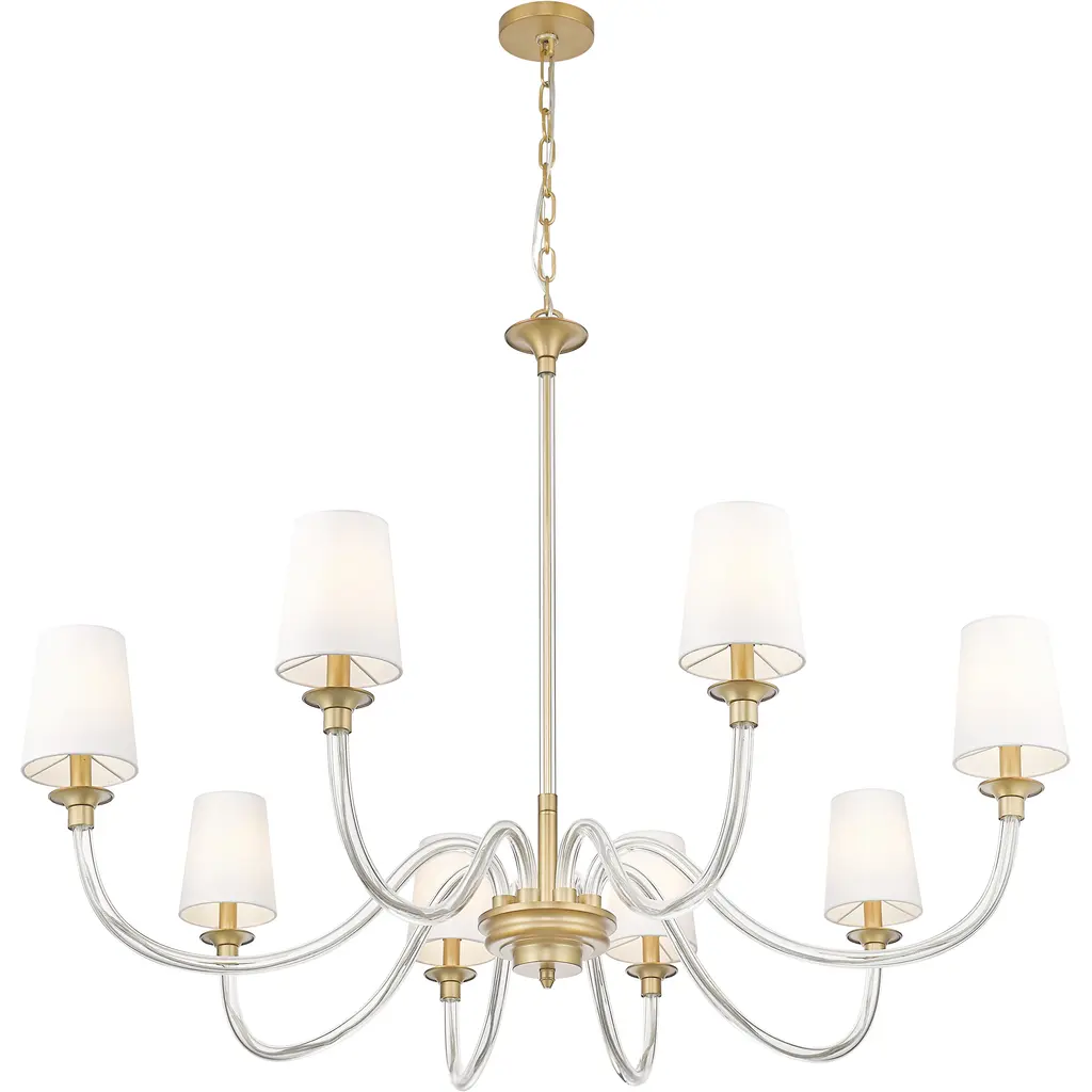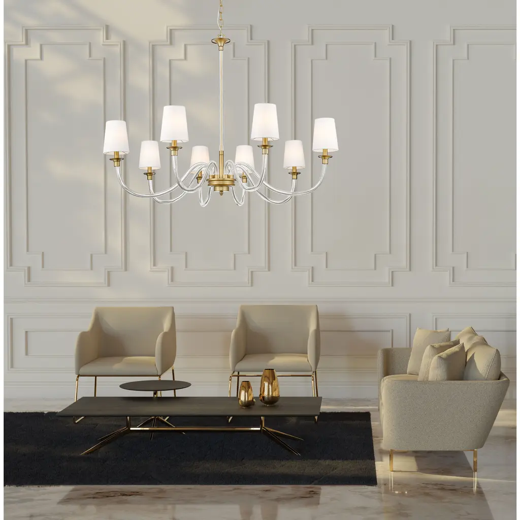 Elegant touches of rich rubbed brass finishing create warmth and contrast for this modern eight-light chandelier. Delicate glass arms are curved and slim, offering refined flair to a familiar silhouette. Lights are capped with white fabric shades, each with a slight taper for added elegance.