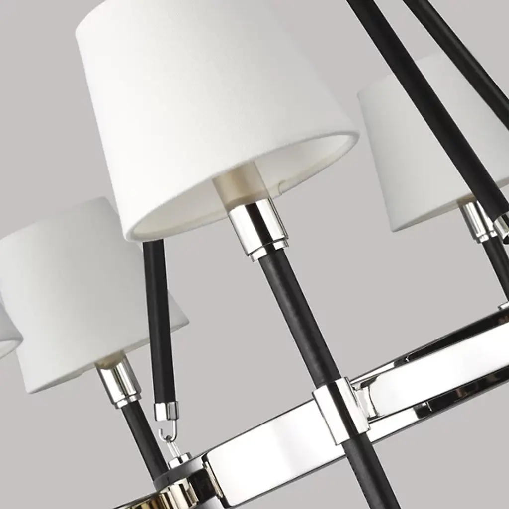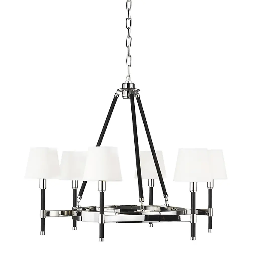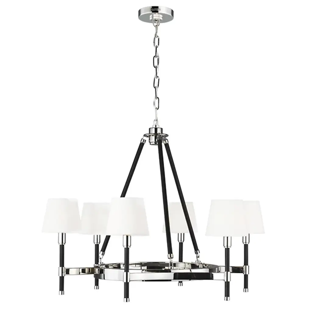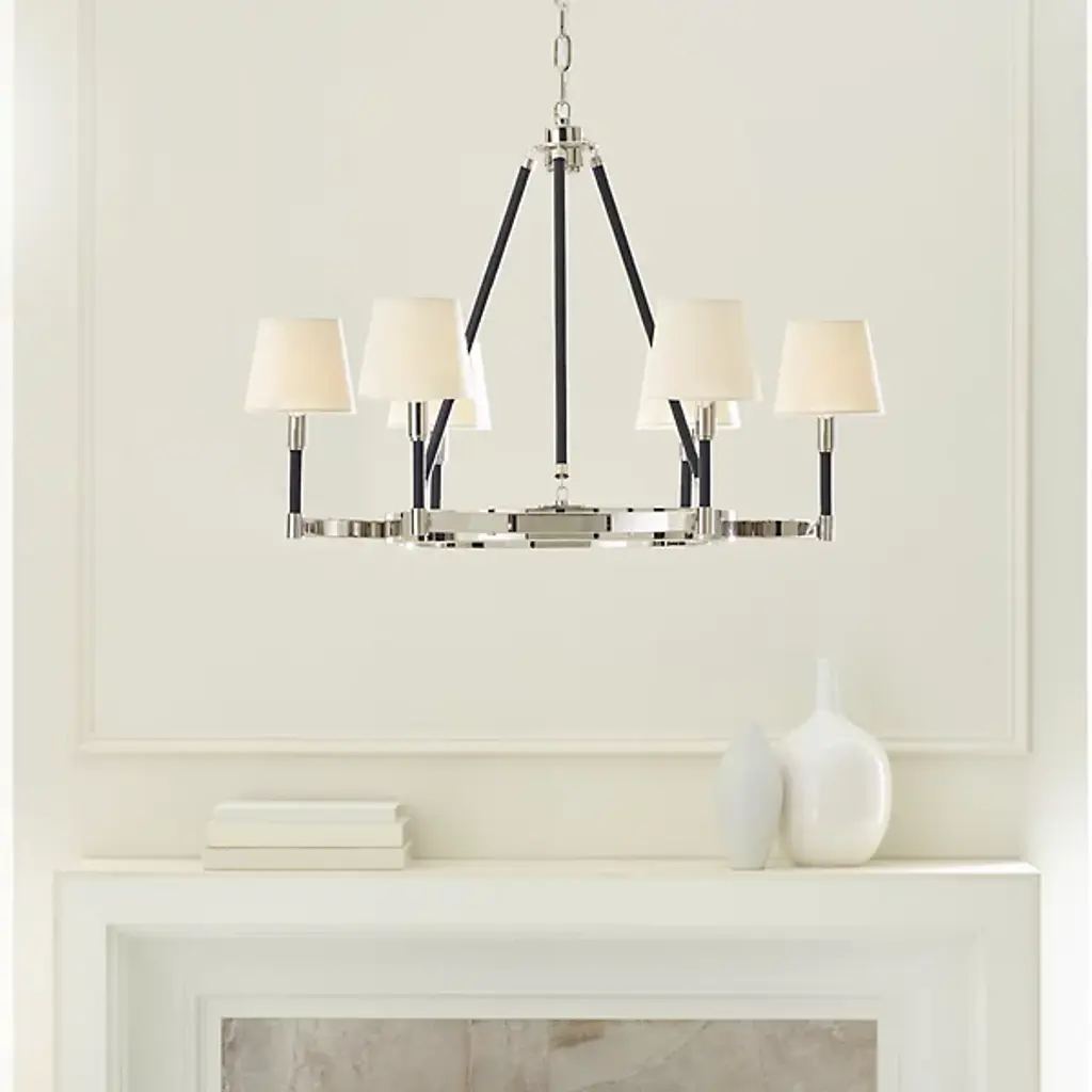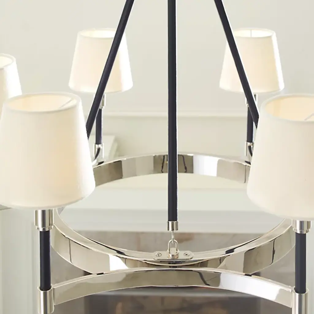 Classic style gets a sleek update for contemporary homes. The Katie Chandelier by Visual Comfort Studio, formerly known as Lauren Ralph Lauren, exudes grace through its gleaming steel accenting and crisp tapered shades. Dropped from a chain suspension, a series of slender stems support a ring frame as it sprouts short arms. Vertical rods hold the piece’s lamping, which is topped with white linen fabric to gently diffuse the glow. The elegant combination of clean metal with its matte finishing makes this piece a beautiful addition to any home.