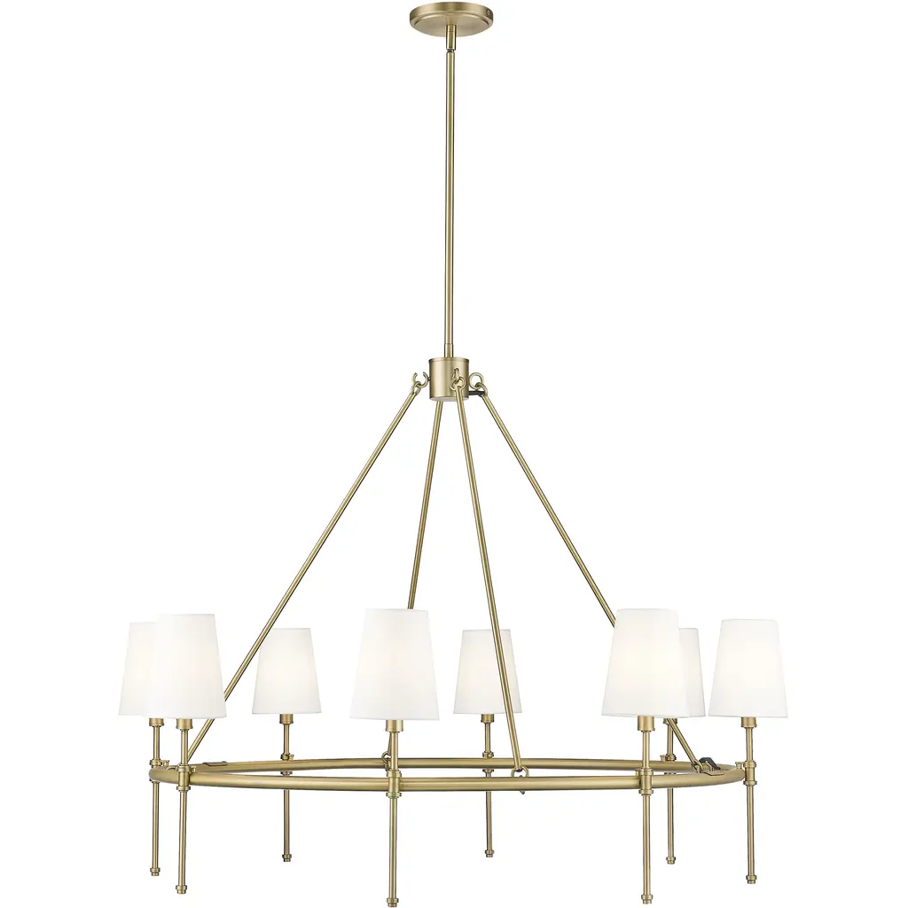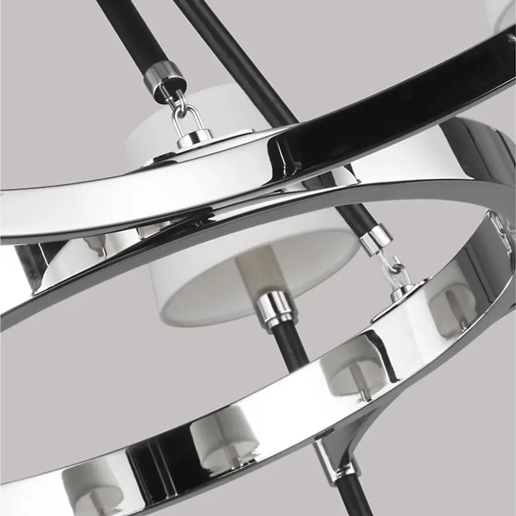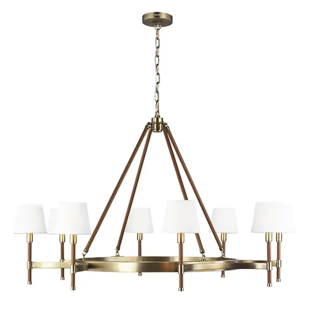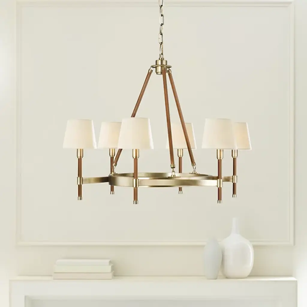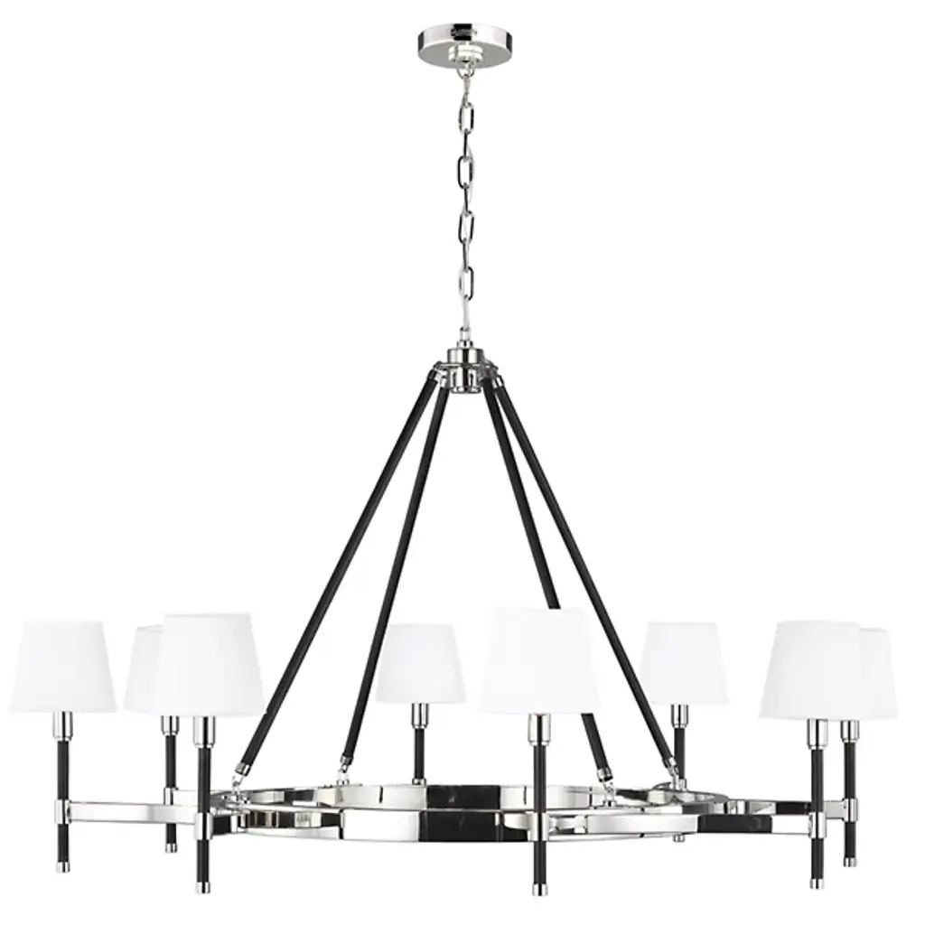 Classic style gets a sleek update for contemporary homes. The Katie Chandelier by Visual Comfort Studio, formerly known as Lauren Ralph Lauren, exudes grace through its gleaming steel accenting and crisp tapered shades. Dropped from a chain suspension, a series of slender stems support a ring frame as it sprouts short arms. Vertical rods hold the piece’s lamping, which is topped with white linen fabric to gently diffuse the glow. The elegant combination of clean metal with its matte finishing makes this piece a beautiful addition to any home.