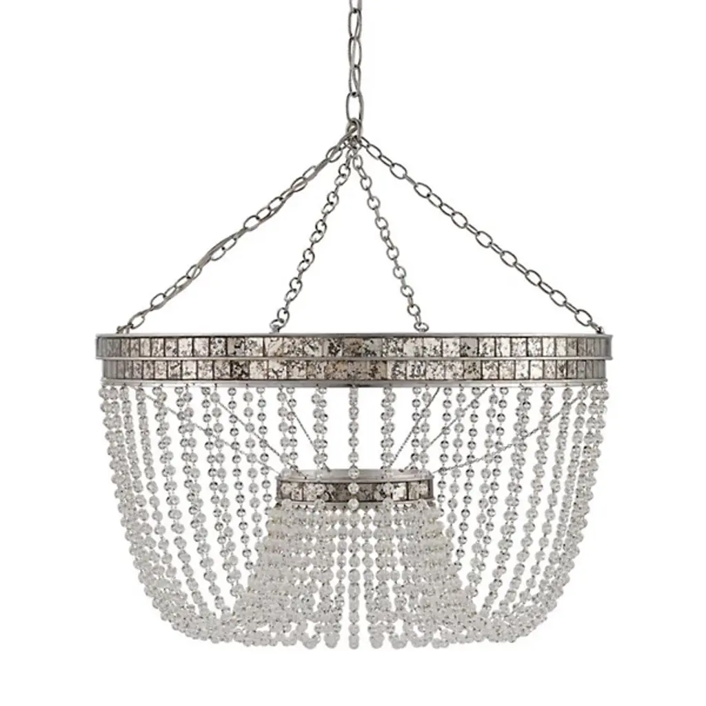 A showstopping addition to the entryway or formal dining room, this sculpted chandelier is crafted of brass with an alabaster dome shade and draped with twisted brass teardrops. Hardwired.