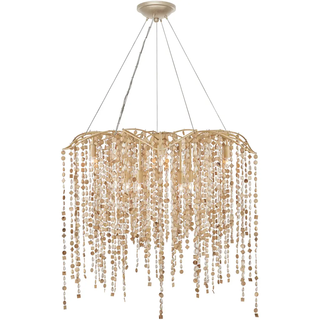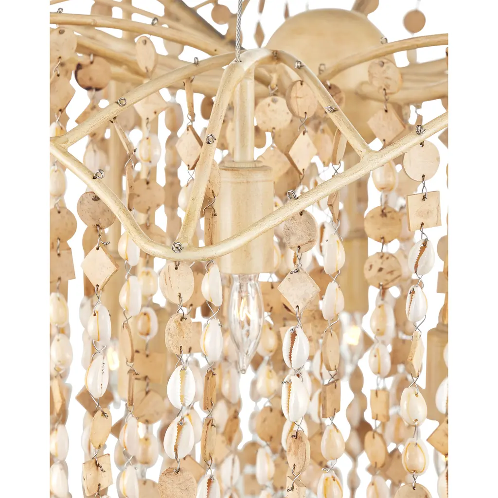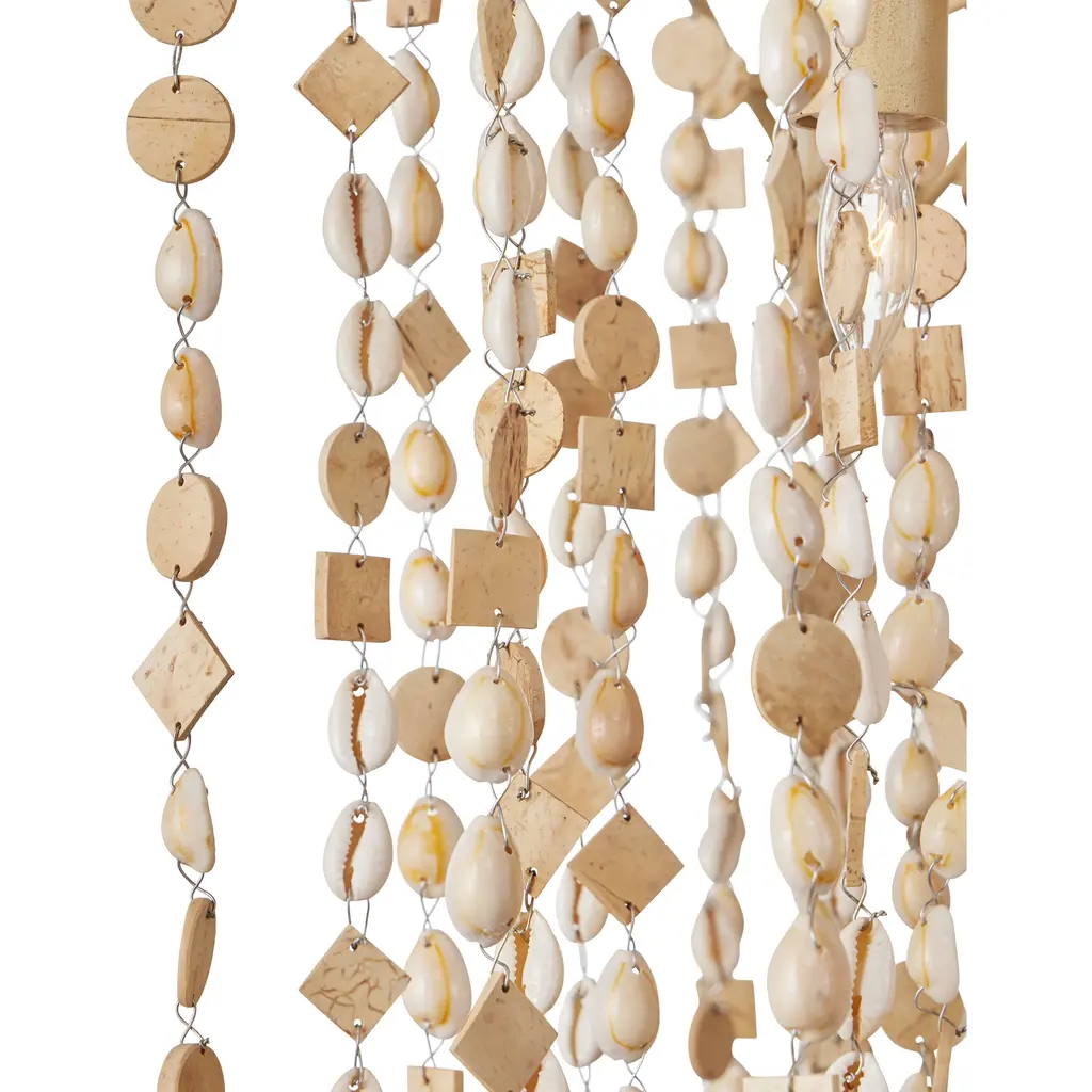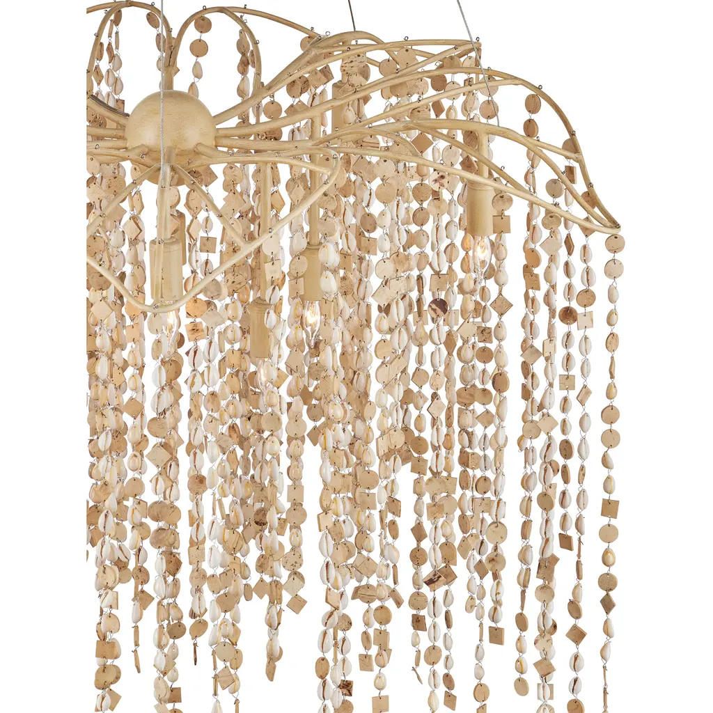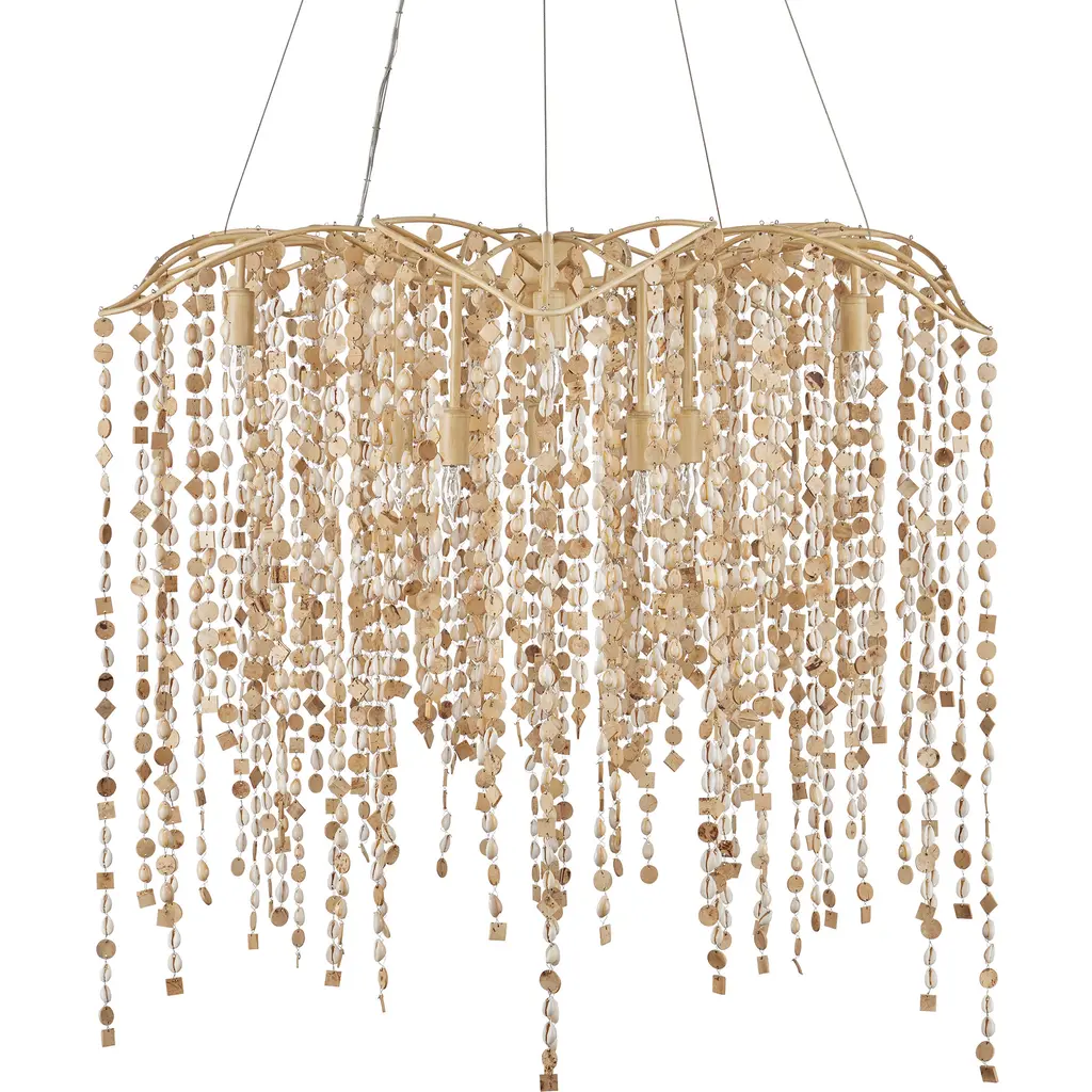 The Kealia Large Chandelier is a striking biophilic design composed of hand-beaded natural cowrie shells and small coconut shell accents that cascade from a gently curved, floral-inspired frame. These natural elements form a curtain-like shade around ten layered lights, creating a dynamic interplay of texture and patterned illumination. The sculptural frame, made from slender ribs of wrought iron in a soft coco cream finish, complements the earthy tones of the materials. Adjustable from 48" to 172" with use of included chain/rod kit/cable. If your space calls for a longer drop, additional chain/rods/cable is available for purchase.