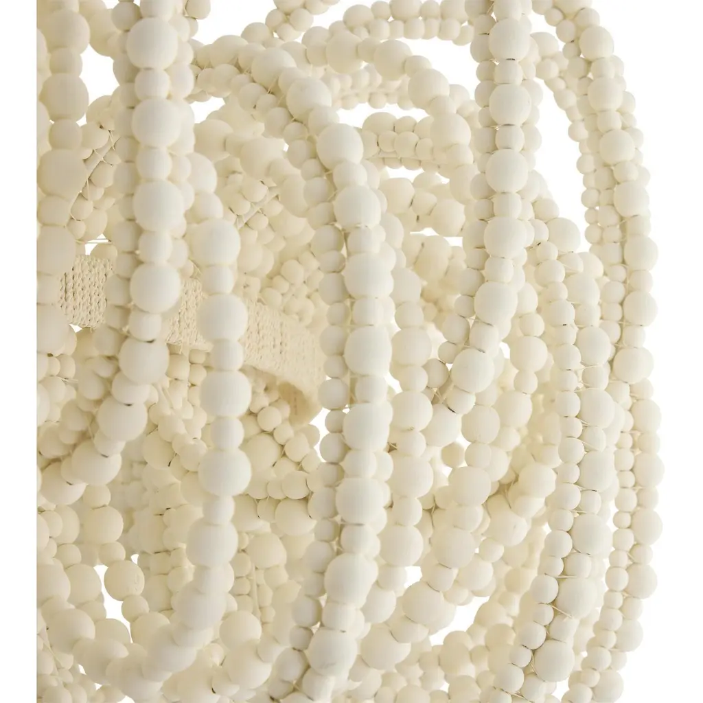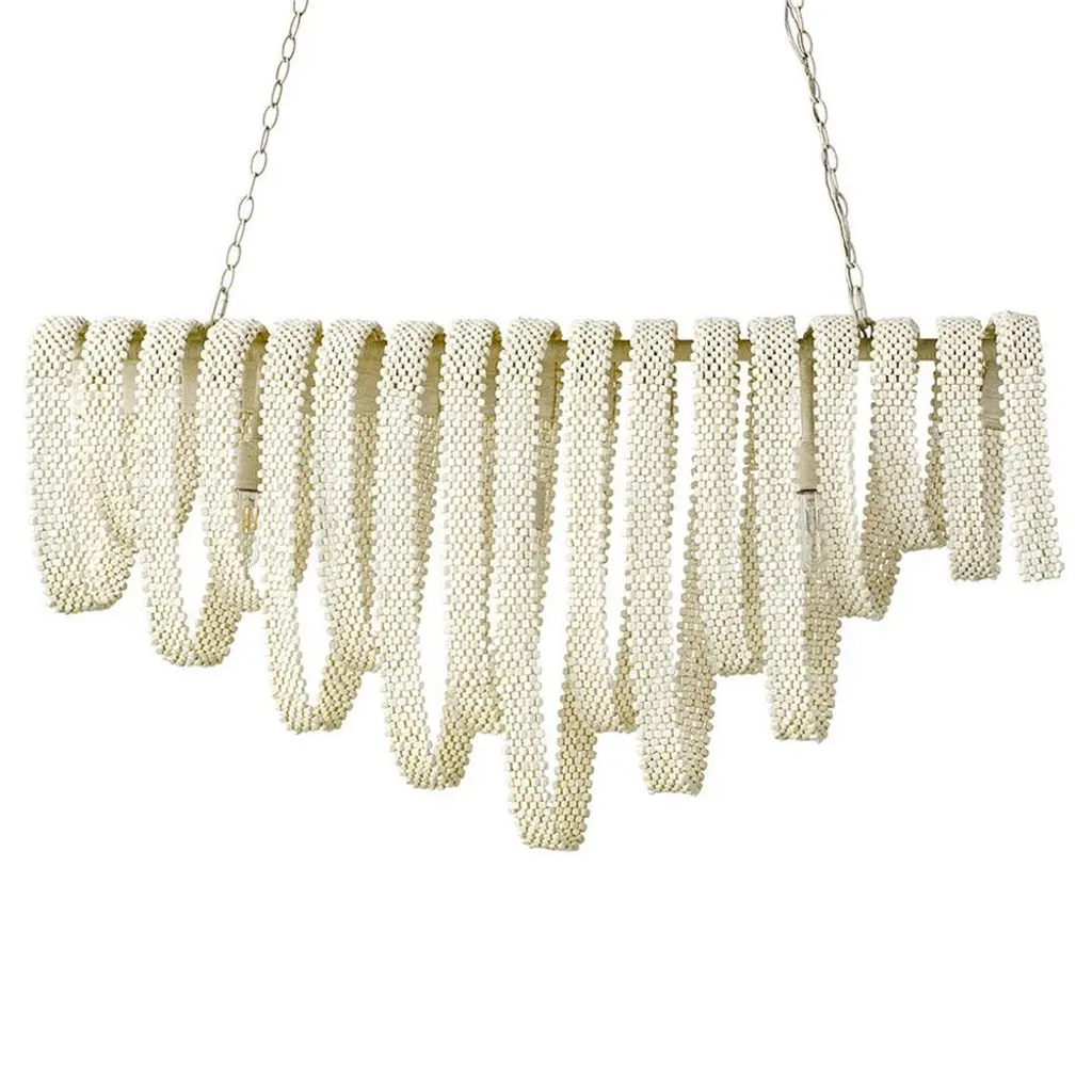 The silhouette of a sinuous sea creature swimming through the waves inspired the loops and drapes of our white wood fixture. The repetition of each beaded loop creates texture and movement from every angle. A white iron pipe and canopy anchors this whimsical feature. Finish will vary.
