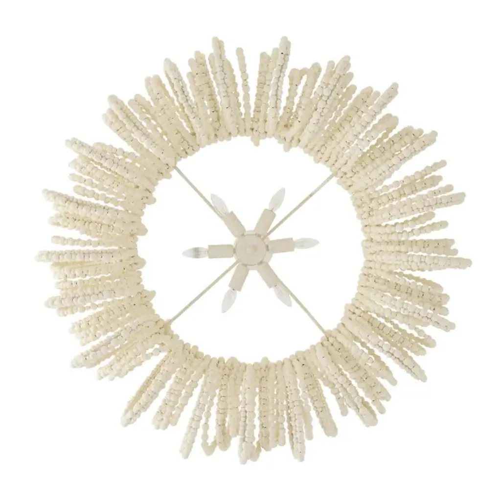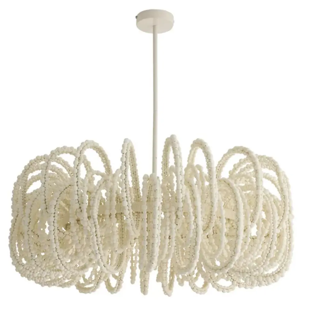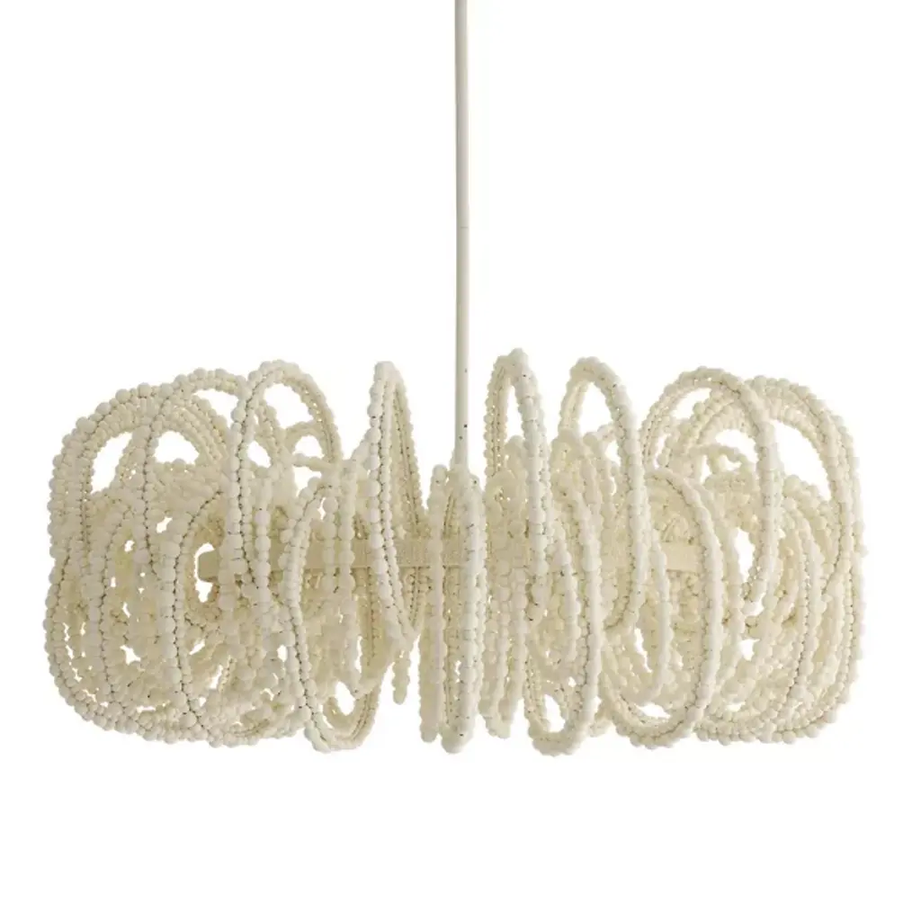 The Keely Chandelier from Arteriors captures the fluid movement of sea creatures through its looping, white wood-beaded strands that drape gracefully from iron supports. Each beaded loop creates its own rhythm while contributing to the overall sinuous form inspired by underwater motion. White iron pipe and canopy anchor this whimsical fixture that works beautifully in dining rooms, bedrooms, or covered outdoor spaces. Repetitive beading produces rich texture from every viewing angle. This organic design brings movement and natural warmth to both casual and refined interiors.