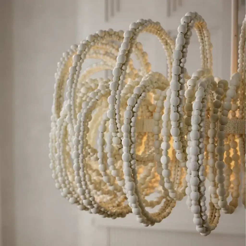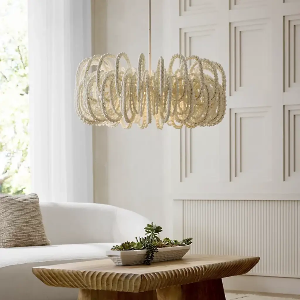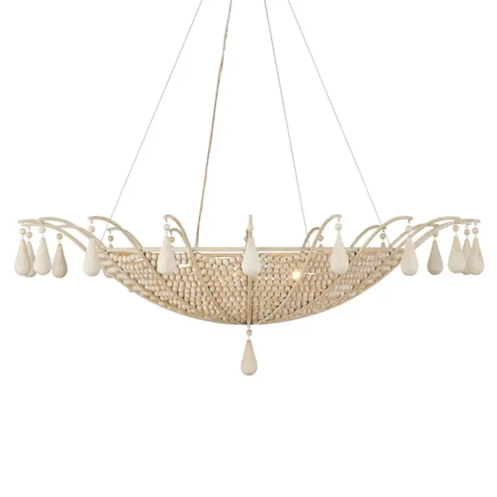 The Keely Chandelier from Arteriors captures the fluid movement of sea creatures through its looping, white wood-beaded strands that drape gracefully from iron supports. Each beaded loop creates its own rhythm while contributing to the overall sinuous form inspired by underwater motion. White iron pipe and canopy anchor this whimsical fixture that works beautifully in dining rooms, bedrooms, or covered outdoor spaces. Repetitive beading produces rich texture from every viewing angle. This organic design brings movement and natural warmth to both casual and refined interiors.