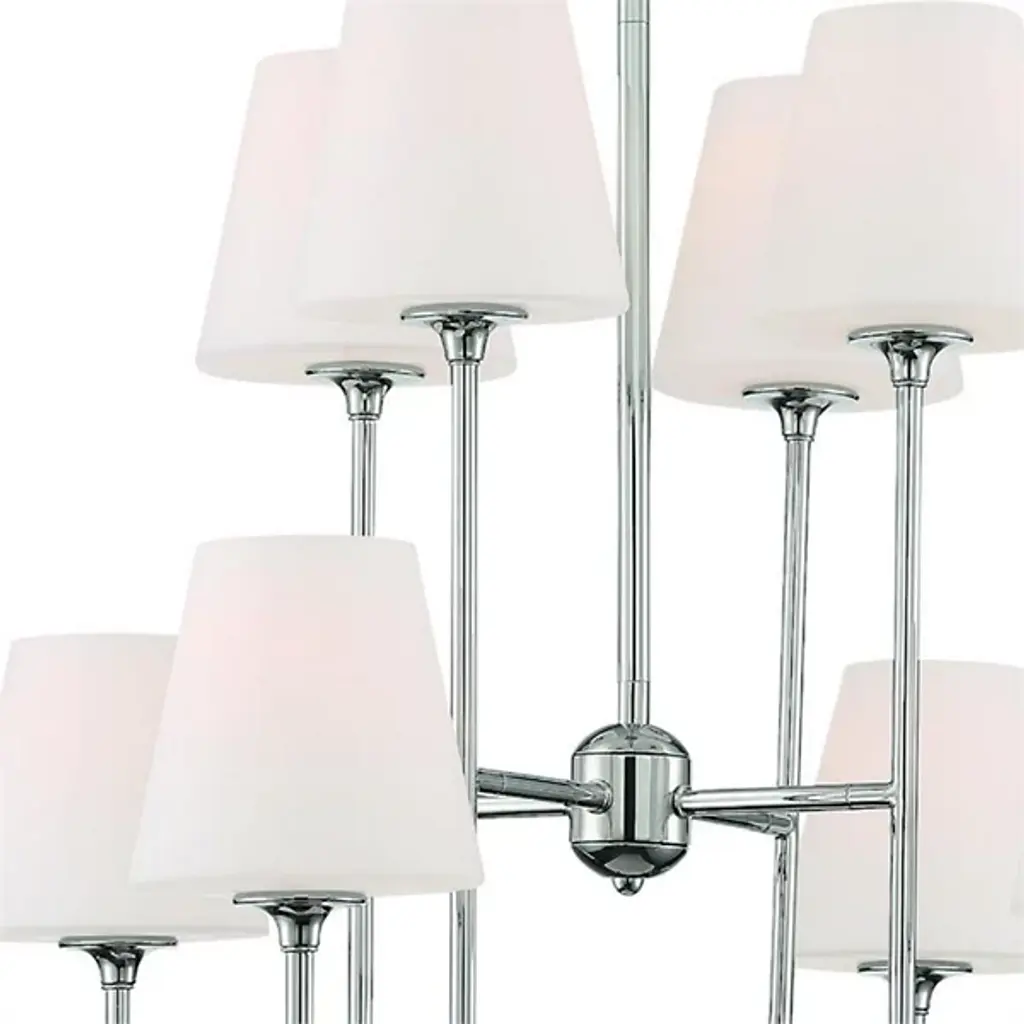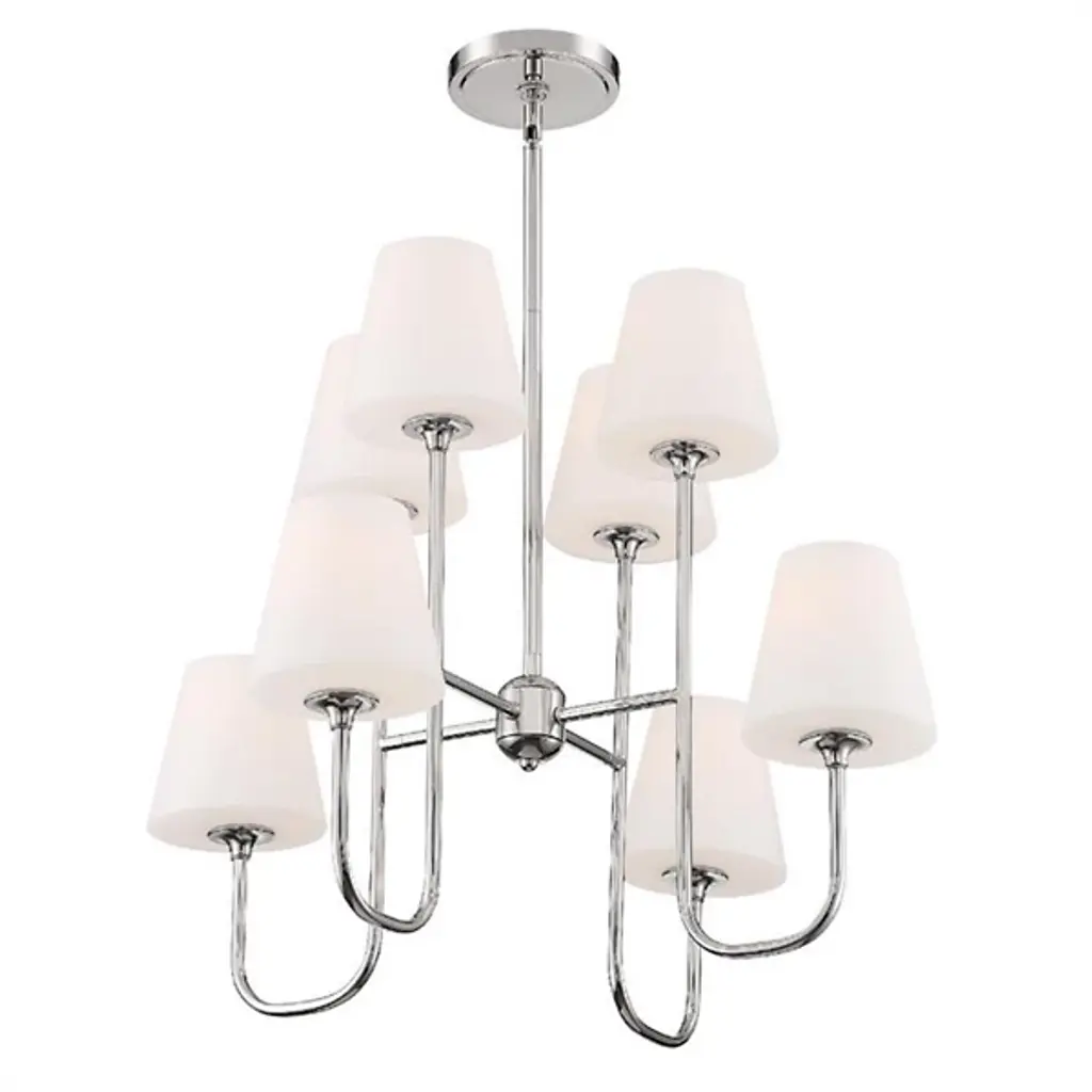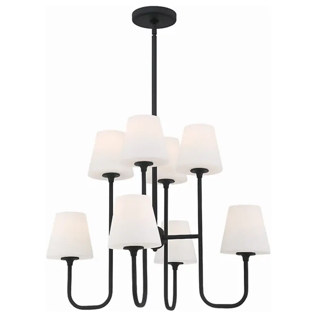 The Keenan Chandelier by Crystorama is a modern addition to spaces with a minimalistic sense of style. Simply structured, less is more as this piece is supported by a single down rod that holds a series of gracefully curved arms, creating a double-tiered composition. Each tier has its own arrangement of crisp, tapered glass shades that softly diffuse a welcoming layer of light onto surroundings, completing this elegant chandelier